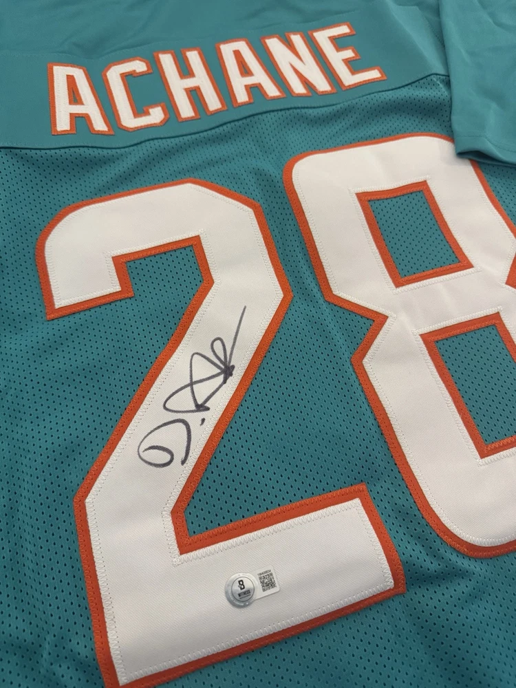 Elevate your collection with a De'Von Achane autographed Miami Dolphins jersey. This authentic piece, verified by Beckett Authentication Services, showcases the dynamic talent of the football star in pristine detail. The signature is a must-have for fans and collectors alike, symbolizing a piece of sports history. Carefully preserved, the jersey reflects the vibrant colors and design of the Miami Dolphins, capturing the essence of the player and the game. Whether displayed in your home or office, this signed jersey is a standout addition to any sports memorabilia ensemble.