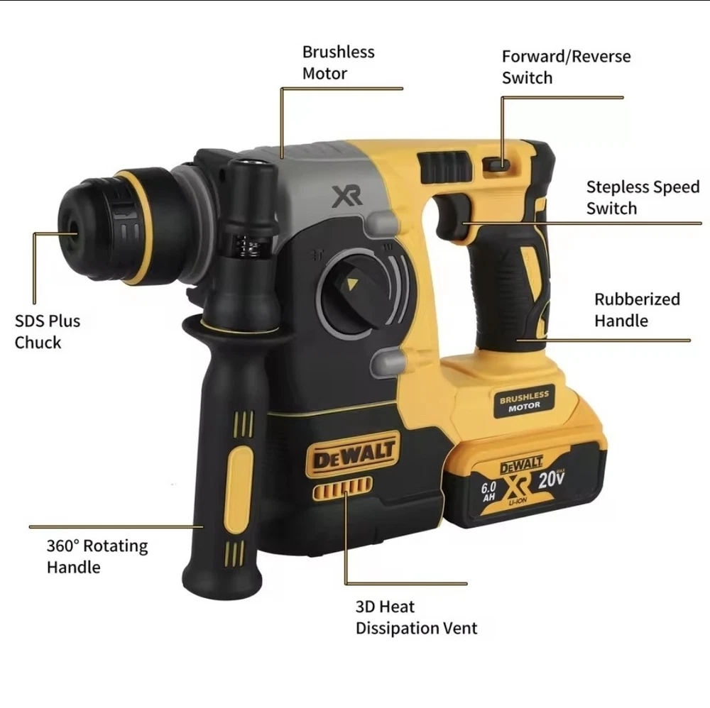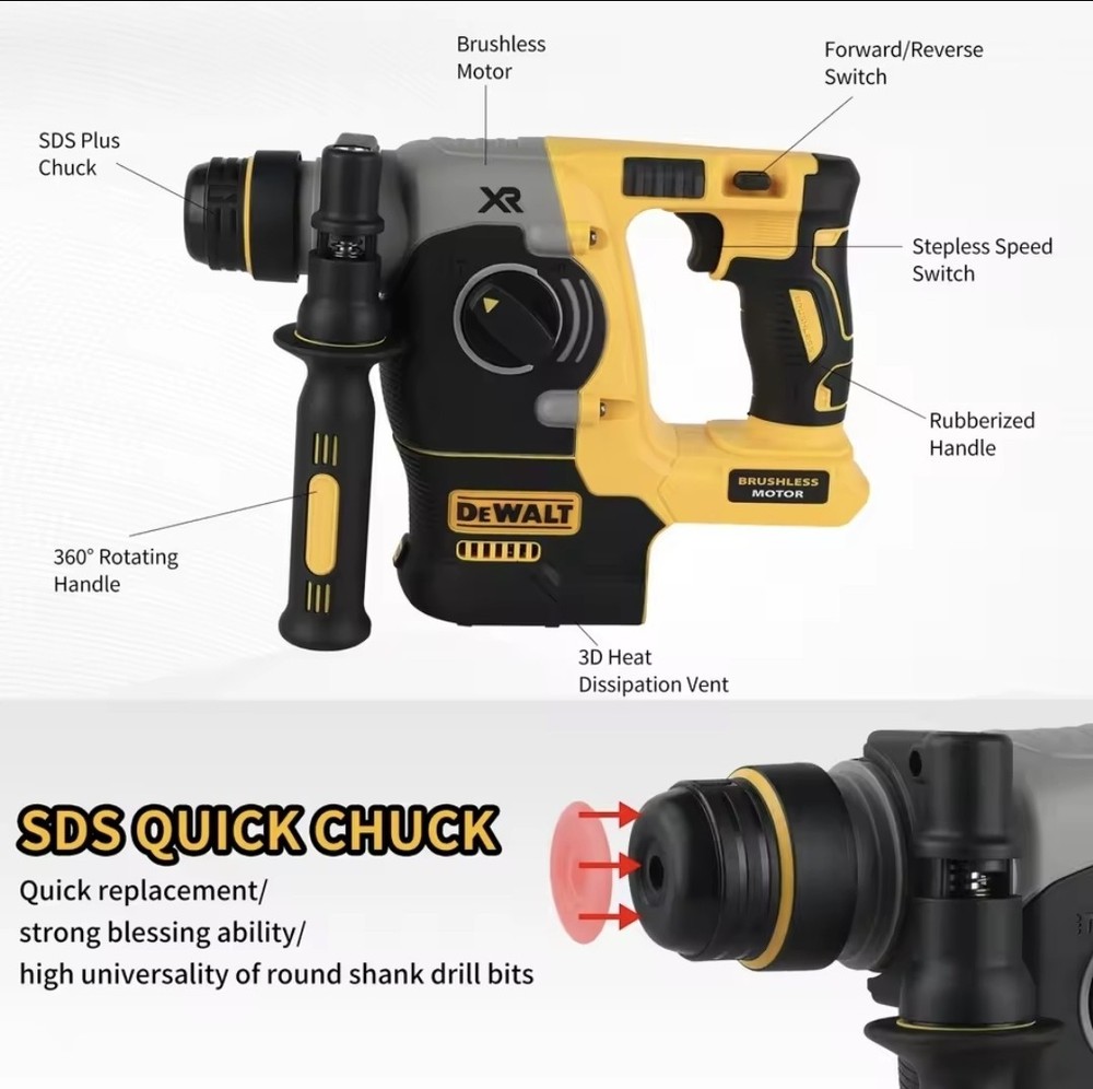 (Tool Only) Professional Power for the Toughest Masonry Jobs When standard hammer drills fail, the DeWalt 20V MAX XR SDS-Plus Rotary Hammer delivers. Engineered for heavy-duty drilling into concrete, brick, and stone, this tool provides 2.1 Joules of impact energy—giving you corded performance with cordless freedom. Whether you're anchoring bolts or chipping away old tile, this brushless powerhouse is built to survive the job site. Key Performance Features Brushless Motor Technology: Maximum runtime and durability. Brushless motors run cooler and last significantly longer than standard motors. SHOCKS® Active Vibration Control: Reduces vibration felt at the handles, allowing you to work longer with less fatigue and better precision. 3-Mode Versatility: Quickly switch between Drilling (wood/metal), Hammer Drilling (masonry), and Chipping/Chiseling (demolition). SDS-PLUS Chuck: The "four pits" quick-change system ensures your bits stay locked in during high-torque applications. Factory-Level Ergonomics: Lightweight, L-shape design with a 360° side handle for maximum control and balance during overhead or horizontal drilling. Retractable Utility Hook: Easily hang the tool on your belt or a ladder when not in use. Technical Specifications Voltage 20V MAX* Impact Energy 2.1 Joules No Load Speed 0 – 1,100 RPM Blows Per Minute 0 – 4,600 BPM Vibration Level 6.6 m/s² (Active Vibration Control) Chuck Type SDS-Plus (1-inch capacity) Optimal Drilling Range 5/32" – 1/2" (Concrete) What’s Included? 1 x DeWalt 20V Brushless SDS-Plus Rotary Hammer 1 x 360° Rotating Auxiliary Handle 1 x Depth Rod Concrete Drill Masonry Hammer XR Brushless The DeWalt 20V SDS Rotary Percussion Impact Drill is a powerful and versatile cordless tool designed for heavy-duty tasks. With a brushless motor and 2.1J maximum torque, this drill is capable of delivering reliable performance. It features a lightweight design, auxiliary handle for added control, and SDS-PLUS four pits chuck for easy bit changes. The 20V lithium-ion battery technology ensures long-lasting power, making it a convenient and efficient choice for various drilling applications. Ideal for professionals and DIY enthusiasts alike, this DeWalt drill is a solid addition to any tool collection.