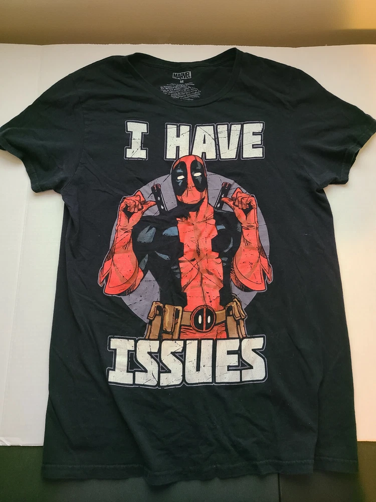 You are buying a USED copy of Deadpool I have Issues Marvel Comics T-Shirt Merc Black Medium . Please read the below Terms and Conditions before bidding, placing an offer or buying an item. By doing any of the three, it will be assumed that you have read the Terms and Conditions . Item Description and Conditions : Please read the item specifics for any details and condition on the item. We are happy to answer any questions, if you have any questions or unsure of anything with the item, please ask before buying or making an offer on an item. Do not ask a question within an offer. Item Packaging : The outside condition of an item (i.e.. the box or other packaging) is not guaranteed. If the item is described as NEW, the item inside is NEW and UNUSED. If there are any blemishes to the packaging, we will do our best to indicate them in the photos. If you have any questions on the packaging, please ask. Payment : Payment is expected within 2 days after the purchase has been made. Reminders will be sent after 24 hours. Items not paid for will be relisted after 48 hours unless the buyer sends a message and requests additional time to make the payment. International Shipping : We offer International Shipping through eBay?s Global Shipping Program. In the listing you should see estimated shipping and import fees. The full and final charges will be available to view at checkout. We do not have any control over import fees or taxes. Combined Shipping : We will combine shipping on multiple items. A combined invoice will be sent for multiple items that have not been paid for. If multiple items are paid for separately, we will refund a portion of the overage. Media Mail : Media items (such as DVDs, CDs, Cassettes, VHS tapes, Books, etc.) are sent Media Mail as indicated in the listing. The option to upgrade to First Class or faster shipping is available either through the listing or by messaging before the purchase to add a more expedited shipping at the buyer?s expense. Shipping : Most items are usually shipped the next business day after payment has been received. Please be aware of any holidays that might impact your shipment. Tracking is sent through eBay after the item has been packed. Returns : We do accept returns, please contact us as soon as possible after receiving the item with any issues. We only accept returns through eBay by the buyer opening a returns case. Feedback : Positive feedback is automatically left after positive feedback is received from the buyer. Be sure to favorite our store for updates!