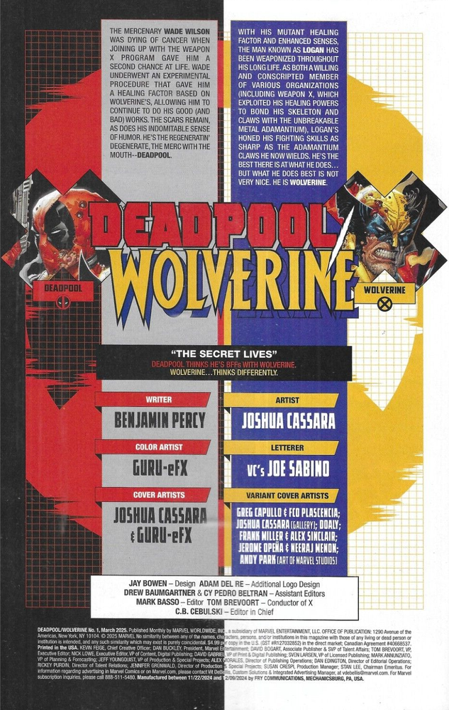 Deadpool Wolverine Issue #1 Joshua Cassara Cover A First printing Marvel All comics are bagged & boarded