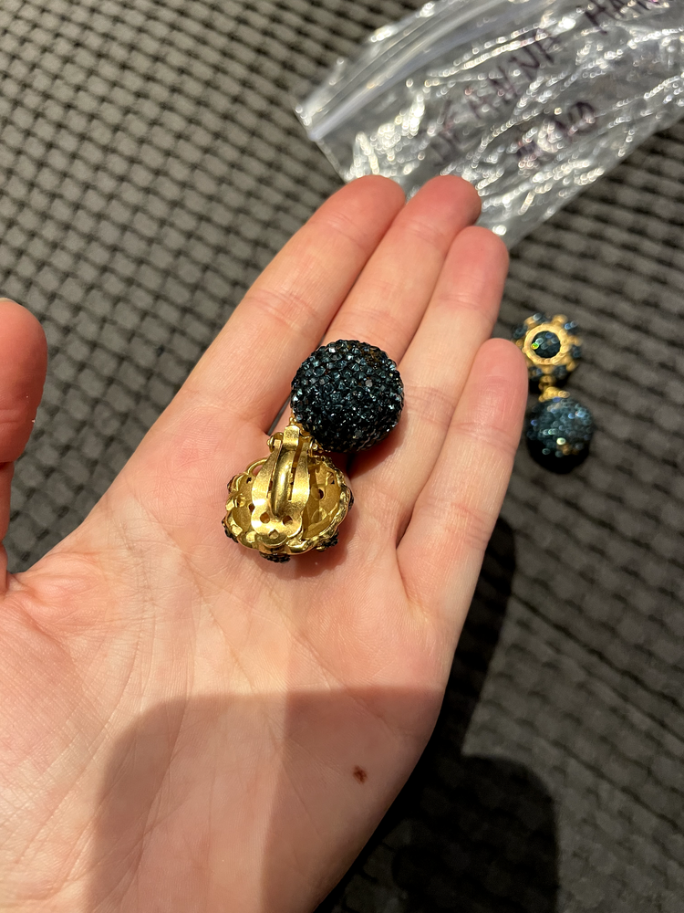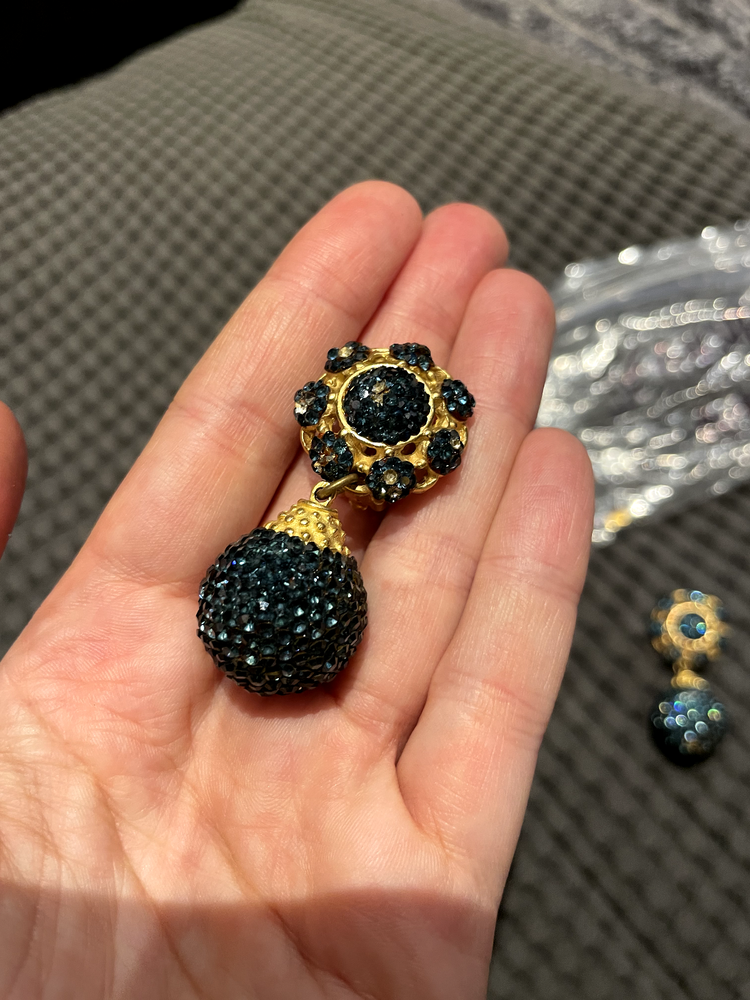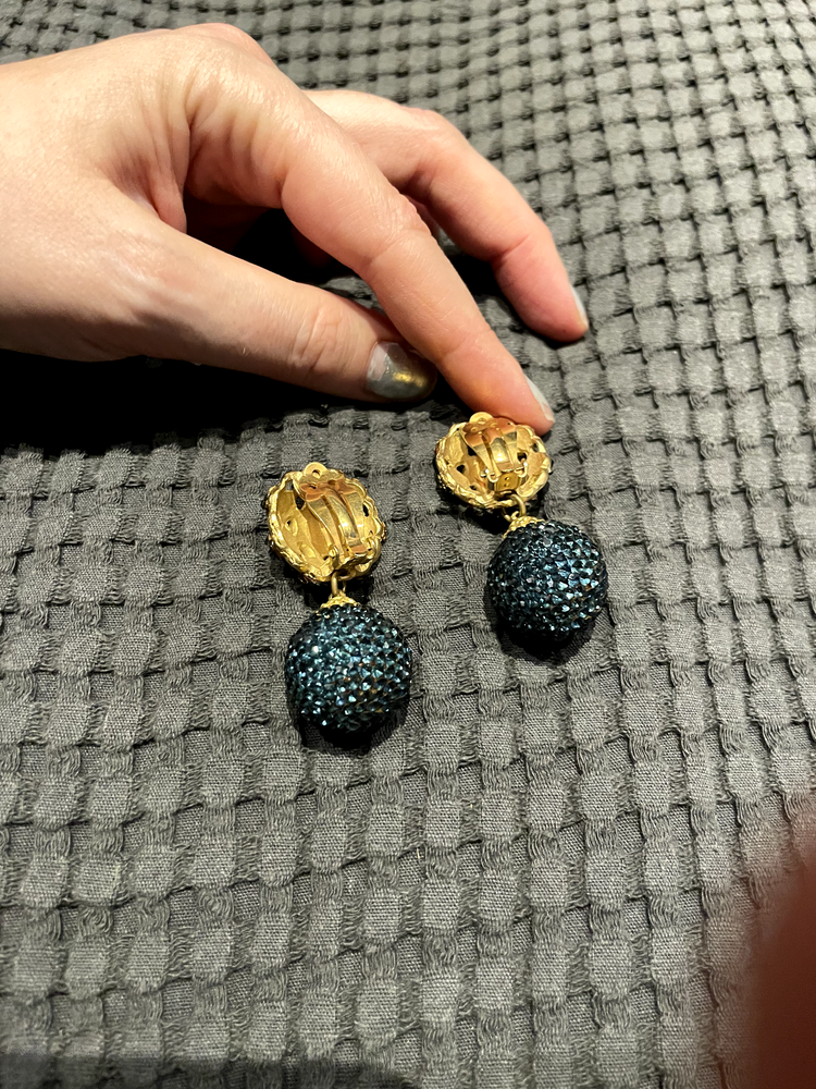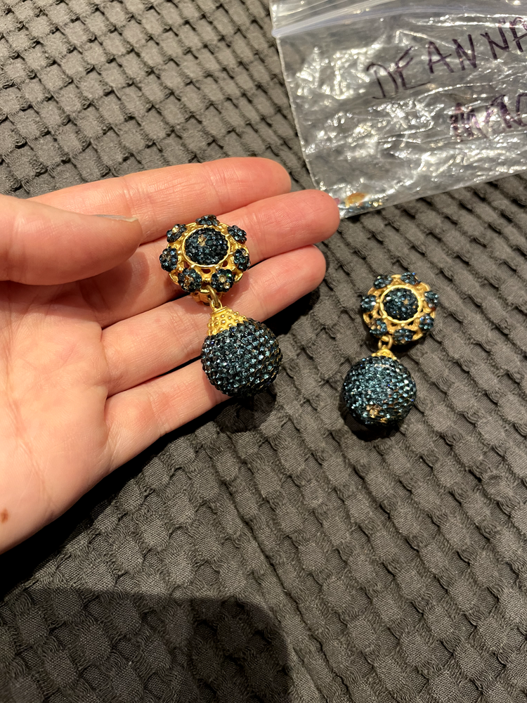 A stunning pair of vintage clip-on earrings by Deanna Hamro, featuring a luxurious gold-tone base adorned with vibrant blue crystals. These earrings showcase a glamorous two-piece design with a bold crystal-encrusted drop beneath a circular top, making them a perfect statement accessory for any occasion. The back reveals a classic gold finish with secure clip-on closures, suitable for those without pierced ears. Condition Note: Some gems are missing from the earrings. A few replacement gems will be included as well as a Deanna Hamro plate from the back of the earing. Additional sourcing may be required of some gems to fully restore their original brilliance. Despite this, these earrings remain a standout piece of vintage craftsmanship. Add a touch of timeless elegance to your jewelry collection today!