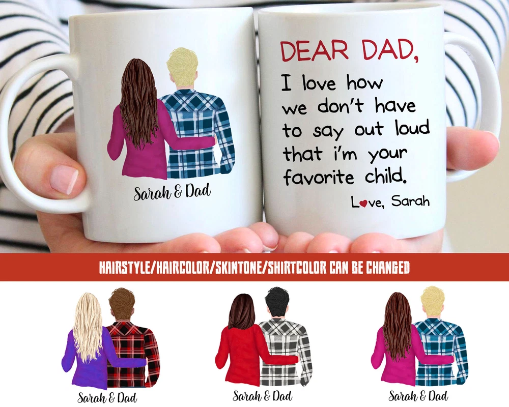 Dear Dad Personalized Mug I'm Your Favorite Child Mug Fathers Day Gift Daughter Product Details.. This high quality 11oz. ceramic white mug has a premium hard coat that provides crisp and vibrant color reproduction sure to last for years. Perfect for all hot & cold beverages. The highest quality printing possible is used. It will never fade no matter how many times you wash it. Material: 100% Ceramic. Print both sides. Dishwasher and Microwave Safe. High Gloss + Premium White Finish. Printed in the U.S.A. Personalized & Custom. We support personalized and custom mug to add custom, when placing an order, you can add notes to the "order note" in shipping address section. Also you can contact us directly via message. Shipping Info. Ready to ship in 1 to 2 business days, All products are made-to-order and proudly printed in the United States. Shipped by USPS and DHL, You will receive your order in 5-7 days. Replace & Refund. All products are defective during shipping broken, chipped will be replaced free of charge. You are not satisfied with the product, we will refund 100% money to you. If any other issues arise, please do not hesitate to message, we would be more than happy to assist you.