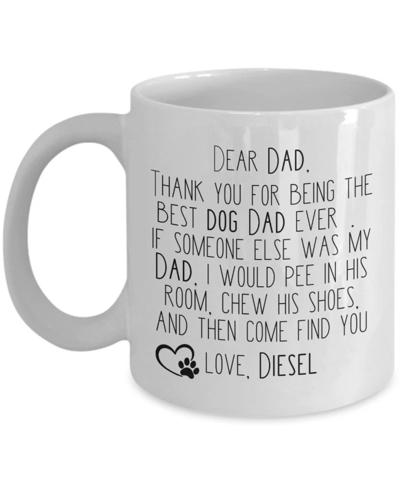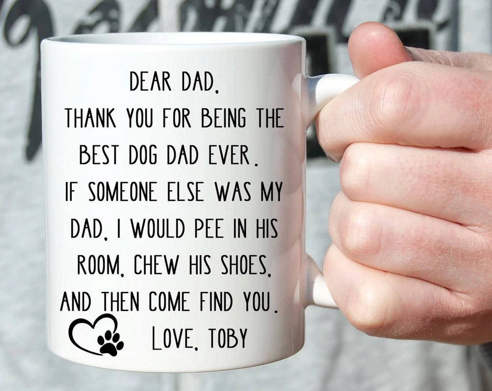 Dear Dog Dad Mug Dog Dad Gift Ceramic Mug Cup Fathers Day Personalized Coffee Cup Custom Coffee Mug Thank You Gift Birthday Product Details.. This high quality 11oz. ceramic white mug has a premium hard coat that provides crisp and vibrant color reproduction sure to last for years. Perfect for all hot & cold beverages. The highest quality printing possible is used. It will never fade no matter how many times you wash it. Material: 100% Ceramic. Print both sides. Dishwasher and Microwave Safe. High Gloss + Premium White Finish. Printed in the U.S.A. Personalized & Custom. We support personalized and custom mug to add custom, when placing an order, you can add notes to the "order note" in shipping address section. Also you can contact us directly via message. Shipping Info. Ready to ship in 1 to 2 business days, All products are made-to-order and proudly printed in the United States. Shipped by USPS and DHL, You will receive your order in 5-7 days. Replace & Refund. All products are defective during shipping broken, chipped will be replaced free of charge. You are not satisfied with the product, we will refund 100% money to you. If any other issues arise, please do not hesitate to message, we would be more than happy to assist you.