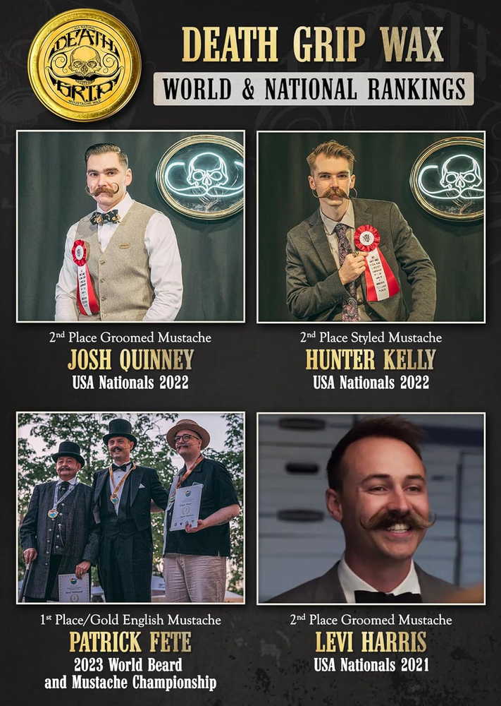 Store New Arrivals Add to Favorite View Feedback Contact Mustache Wax Death Grip Extra Strong Hold Moustache Wax Description Item model number MW-002 Manufacturer Death Grip Style Death Grip Extra Strong Hold Is Discontinued By Manufacturer No Product Dimensions 2.13 x 2.13 x 0.5 inches; 1.45 ounces Product Benefits function(f) {var _np=(window.P._namespace("DetailPageProductOverviewTemplatesJava"));if(_np.guardFatal){_np.guardFatal(f)(_np);}else{f(_np);}}(function(P) { P.when('A').execute(function(A){ A.on('a:truncate:po-attribute-truncate-0:updated', function(data) { var isTruncated = !data.truncateInstance.getIfTextFits(); var seeMoreElement = document.getElementById('po-attribute-see-more-id-0'); if(seeMoreElement) { seeMoreElement.style.display = isTruncated ? '' : 'none'; } }) }); })); Provides extra strong hold for up to 8+ hours, lasts up to 4 months, and contains all-natural cruelty-free ingredients. See more Material Type Free Dye Free, Paraffin Free, Paraben Free Liquid Volume 1 Fluid Ounces Scent Unscented Hair Type All Size 1 Ounce (Pack of 1) Caution For Serious Moustaches Only - Hairdryer or heat with a little bit of practice is recommended Extra Strong Hold - Holds those unruly stash whiskers in place for 8 plus hours even in hot weather Lasts A Long Time - 1oz metal tin mustache wax can last up to 4 months of daily usage; non scented Handcrafted Made In the USA - All natural cruelty free ingredients competition grade moustache wax Death Grip Mustache Wax Promise - If you are not happy for any reason we will refund your money Product Description Origin Story of Death Grip Mustache Wax The video showcases the product in use. The video guides you through product setup. The video compares multiple products. The video shows the product being unpacked. hero-video Merchant Video The video showcases the product in use. The video guides you through product setup. The video compares multiple products. The video shows the product being unpacked. hero-video Merchant Video Death Grip Mustache Wax Death Grip Mustache Wax is ideal for all your grooming needs. A little goes a long way, so you do not need to waste product by using a huge amount. Simply spread wax evenly without “pilling up”. For best results, use a hairdryer or heat up to make the wax more malleable to attain the perfect curl & shape you desire. Product Comparison Add to Cart Add to Cart Add to Cart Add to Cart Customer Reviews 4.4 out of 5 stars 10,448 4.4 out of 5 stars 10,448 4.4 out of 5 stars 10,448 4.4 out of 5 stars 10,448 Price $17.98 $ 17 . 98 $17.98 $ 17 . 98 $17.98 $ 17 . 98 $17.98 $ 17 . 98 Heat Source Required Yes Yes No No Tacky? Yes Slightly No Slightly Hold Strength Extra Strong. Extra Tacky. Extra Strong. Extra Firm. Medium. Easy Application. Strong. Easy Application. Intended Use / Style Competition Grade / Handlebar Competition Grade English Dali Training Styling Natural Look Styling / Training What's Included? 1oz Mustache Wax with Pick 1oz Mustache Wax with Pick 1oz Mustache Wax with Pick 1oz Mustache Wax with Pick Unscented ✔ ✔ ✔ ✔ How To Clean? Night Fury Wax Remover & Soap Night Fury Wax Remover & Soap Soap & Water Soap & Water ABOUT US We offer the best prices around on high quality products. Our E-store includes media such as books, movies, music and games while offering electronics, toys, sporting apparel, clothing, tools, general home, garden items and more. SHIPPING We are always working hard to ensure your package arrives as soon as possible. Please understand that some factors like weather, high postal traffic, and the performance of shipping companies are outside of our control. We offer free shipping to the lower 48 states and ship within 2 business days of payment, usually sooner. We do not accept P.O. Boxes. Please provide a physical address. RETURNS We offer a 30-Day Return Policy on items which you are not completely satisfied with. You have the option for a full-refund or an exchange of the item. No returns are available on items shipped outside of the USA. PAYMENT We accept PayPal. CONTACT US This page content is yet to come Please ad us to your favorite seller and visit again later Thank You CUSTOMER SATISFACTION We try our very best to make sure every customer is completely satisfied. If there's a problem, message us! We're happy to help.