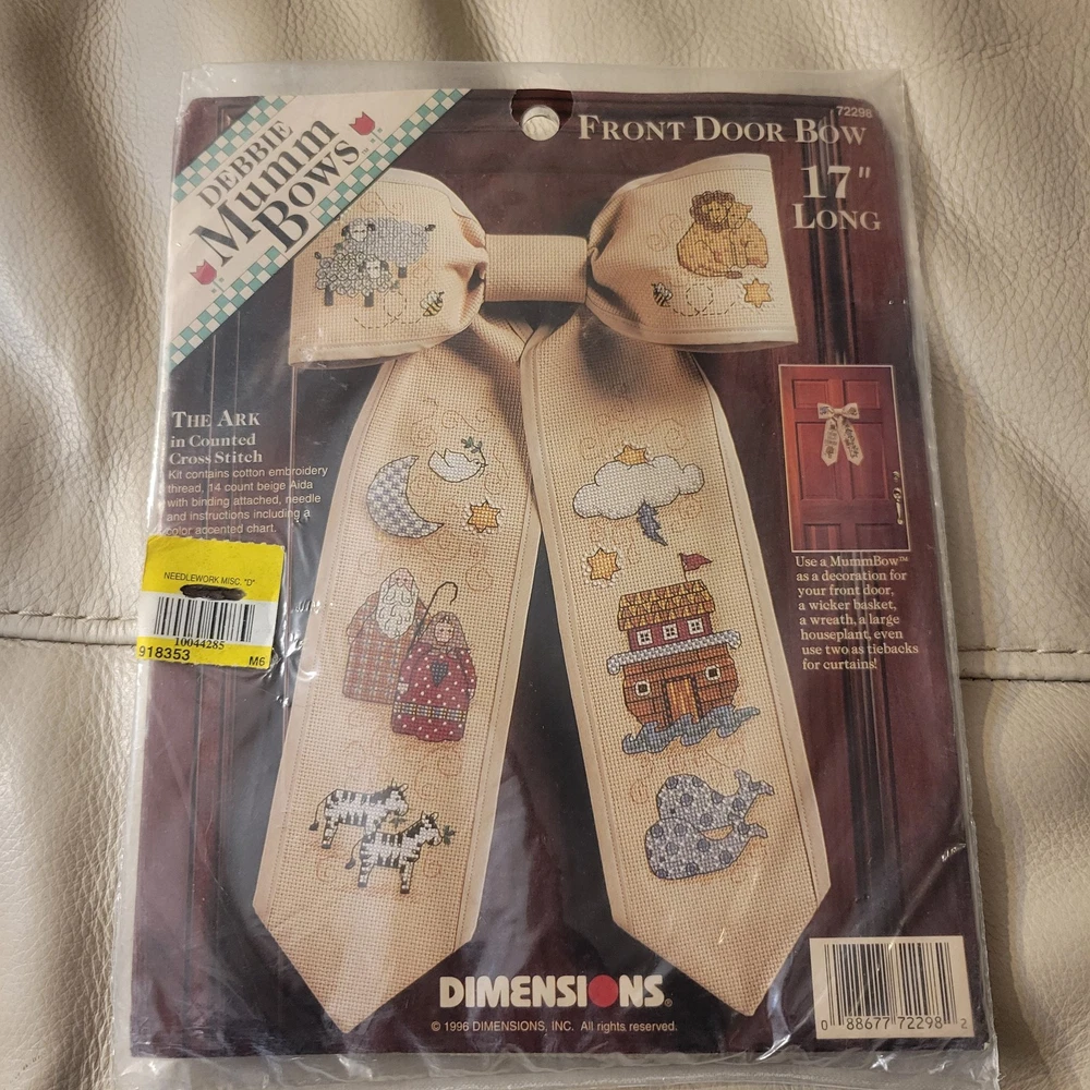 This is a sealed cross stitch kit from Dimensions featuring a noahs ark theme. The kit includes everything needed to complete a 17" front door bow design, including fabric, floss, and instructions. The brand is Dimensions and the model is Feather B & B. The kit is made in the United States and is perfect for those who enjoy needlecrafts and embroidery.