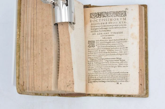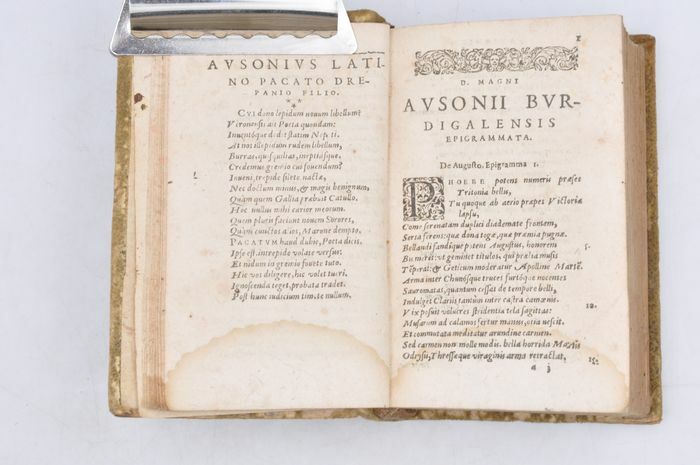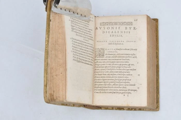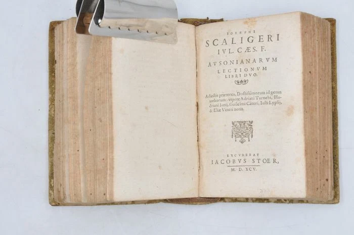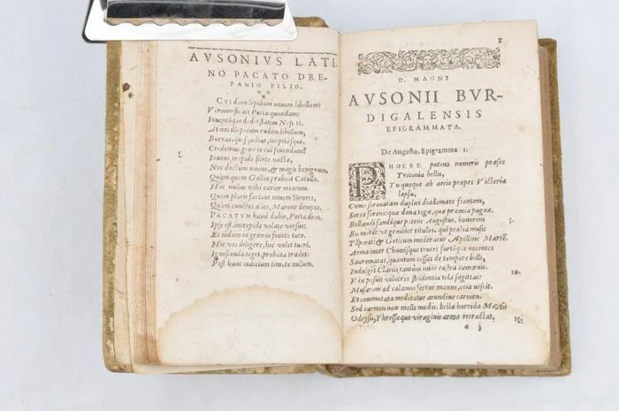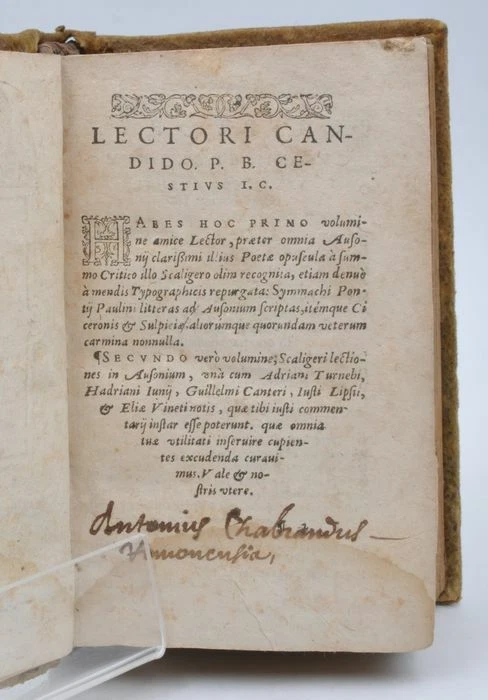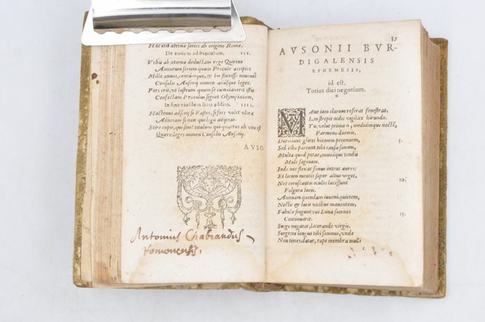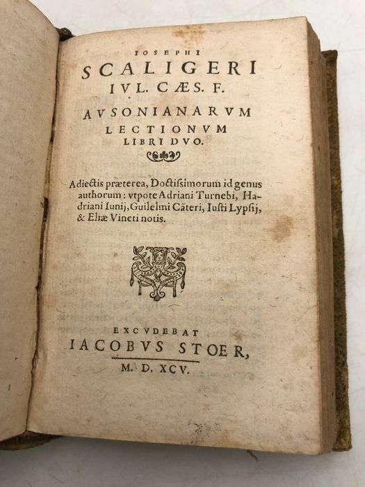 Petit ouvrage. Reliure style peau retournée avec quelques manque. Dos à 3 nerfs. Rousseurs. Mouillure sans gravité sur le bas de l'ouvrage affectant les 100 premières pages. Titre dans les bordures de la gravure sur bois. Le deuxième volume a un titre qui lui est propre, il contient ' Iosephi Scaligeri Iul. Caes. F. Ausonianarum lectionum libri duo', auquel ont été ajoutées les notes de A. Turnebus, Hardianus Junius, G. Canter, J. Lipsius & E. Vinetus). Note : Decimus Magnus Ausonius de Burdigala (Bordeaux), ca. 310-394, était selon HJ Rose un exemple de la dégénérescence sénile de la littérature latine du 4ème siècle, et la première lueur annonçant le renouveau de la littérature française. Il écrivait des bagatelles, parfois jolies ou intelligentes, souvent fatigantes. (H.J. Rose, « A History of Latin Literature », Londres 1967, p. 527/29). H.G. Evelyn White, l'éditeur de l'édition Loeb, est encore plus négatif : « En tant que poésie (.) la grande masse de ses vers est négligeable ». La valeur principale de l'œuvre d'Ausone est selon lui historique. (Loeb Classical Library, Ausonius, Cambr. Mass., 1919. p. VII) La « Neue Pauly » est plus positive : « Ausonius repräsentiert eine Kultur der Bewahrung und des Erbes. Allenthalben greift er auf die griech. et lat. Lit. zurück, über die er souverän verfügt, und gestaltet anspielungs- und voraussetzungsreiche pretiöse Gebilde von formalem Raffinement». (Der Neue Pauly, 2334) Alexander Souter est dans l'Oxford Classical Dictionary plein d'éloges : « Ses nombreux poèmes, écrits en plusieurs mètres (.) sont d'un intérêt considérable, à la fois dans le sujet et dans le style. Il existe plus d'une centaine d'épigrammes, dont certaines en grec et d'autres traduites du grec. Il y a 25 lettres. Sa correspondance avec Paulin de Nola en est la partie la plus notable. L'Éphéméride comprend de nombreux poèmes en divers mètres, traitant de la vie quotidienne. Les Parentalia sont un recueil de courts poèmes à la mémoire des proches décédés du poète. La Commemoratio Professorum Burdigalensium présente un intérêt pour l'histoire de l'éducation. (.) Ce récit n'épuise en aucun cas la liste des poèmes mineurs, à travers lesquels la connaissance minutieuse de l'auteur de Virgile est apparente et sa foi chrétienne n'est pas obstruée. Son poème le plus important est la Moselle qui attire toujours les lecteurs. Il s'agit d'une laudatio rhétoriquement façonnée sur 483 hexamètres et qui décrit avec beaucoup de détails les divers poissons que l'on trouve dans la rivière ainsi que quelques-uns des beaux bâtiments sur les rives et d'autres éléments, le tout constituant une série d'épisodes, composés, comme le reste du vers d'Ausone, selon la règle ». (OCD 2e éd. p. 154). (Q3) N'oubliez pas de m'ajouter à votre liste de favoris! .