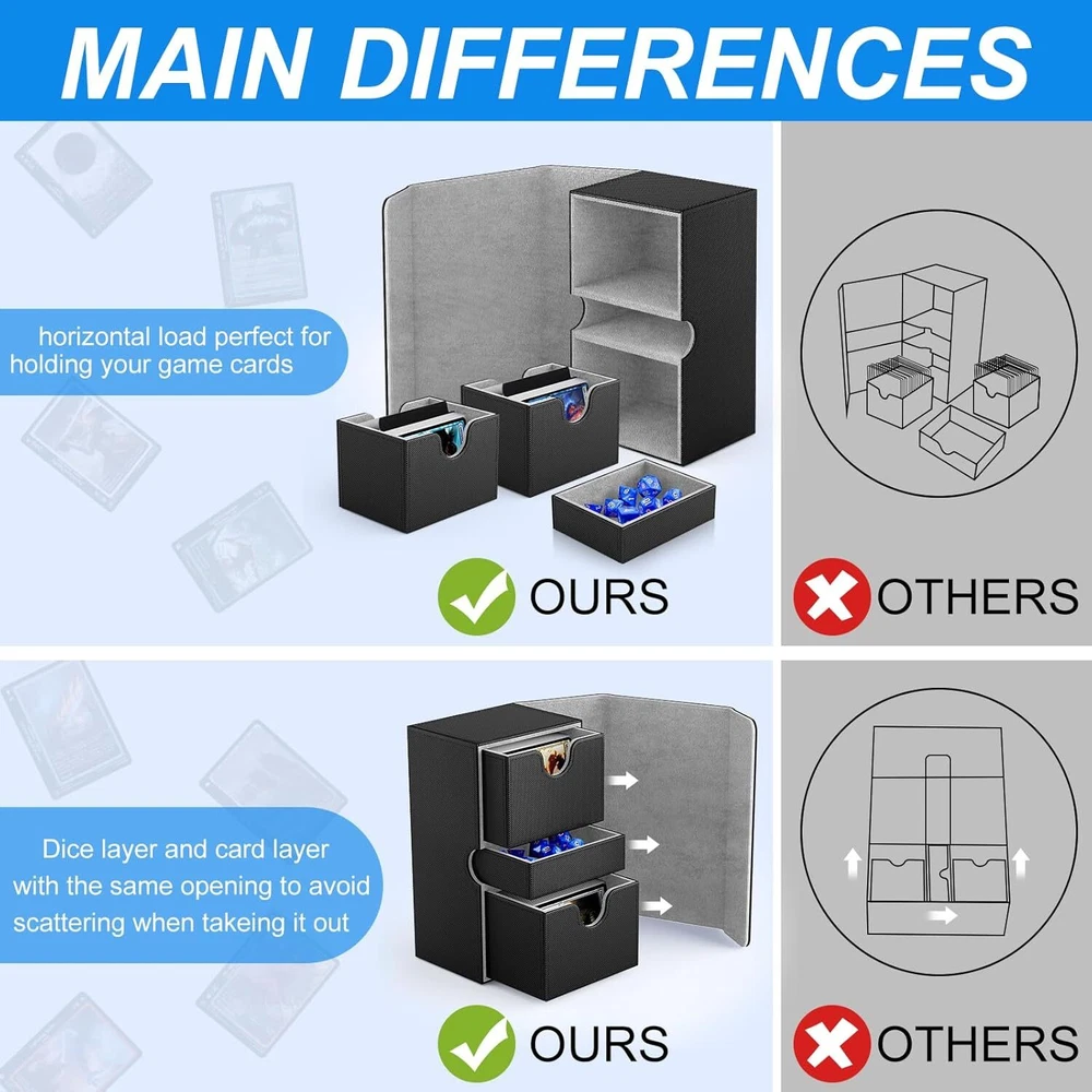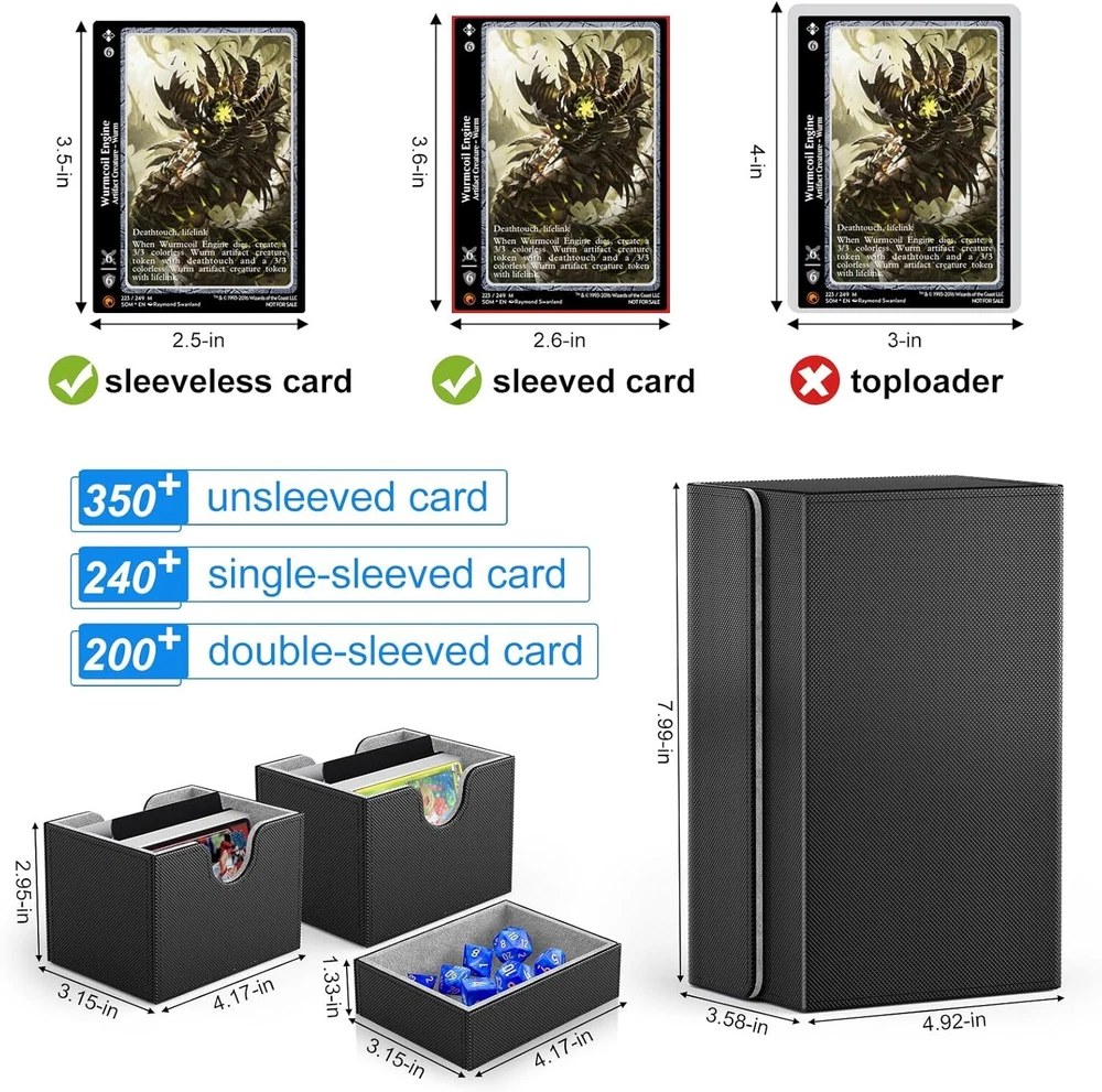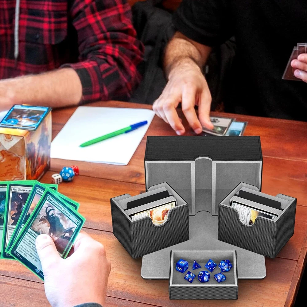 Free eBay listing template designed by dewiso.com Card Deck Box Fit For MTG Commander Deck Box with Dice Tray Fits 200+ Double Sleeved Cards, PU Leather Double Card Deck Box with Card Dividers and Dice FREE AND FAST SHIPPING! About this item 【Premium Double Deck Box】The commander deck box is equipped with 2 card trays and 1 dice tray, along with 2card dividers and 7 dices , specifically designed for your commander decks to enhance your gaming experience comprehensively. 【Large Capacity】The 2 side-loading card trays can effortlessly store 200 double-sleeved cards or 240 single-sleeved cards. The dedicated dice tray is designed to hold various accessories such as dice, counters, and tokens, ensuring your gaming gear remains organized. 【Strong Magnetic Closure】Featuring a powerful magnetic clasp design, the deck box mtg ensures a secure closure even during vigorous shaking or accidental drops, preventing cards from spilling out and guaranteeing their safety. 【Comprehensive Protection】The exterior of the card deck box is made from premium PU material, featuring a non-slip texture that is scratch-resistant and durable, effectively shielding against external impacts. The interior is lined with soft microfiber to prevent card scratches, and the U-shaped opening design allows for easy card retrieval, offering an optimal user experience. 【Perfect Gift Choice】Whether for a friend or for personal use, the mtg commander deck box is an ideal choice to elevate the gaming experience. Its high-quality materials and design make it an essential accessory for TCG enthusiasts. Product We offer a 30-Day Return Policy on items which you are not completely satisfied with. You have the option for a full-refund or an exchange of the item. No returns are available on items shipped outside of the US . Shipping We offer Free Shipping to the US and ship within 2 business days of payment, usually sooner. We use UPS express shipping. That's why your products are usually delivered within 3 days . Contact We try our very best to make sure every customer is completely satisfied. If there's a problem , message us! We're happy to help. 24/7 live chat available.