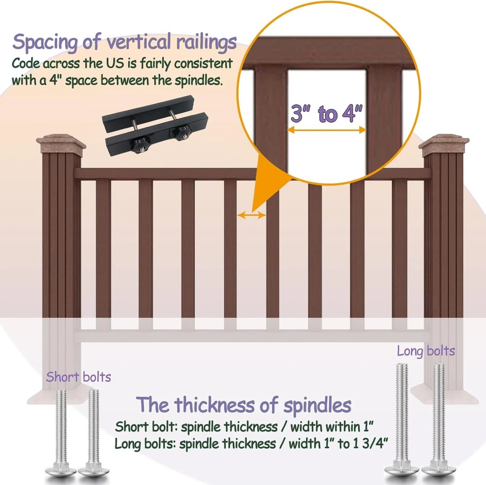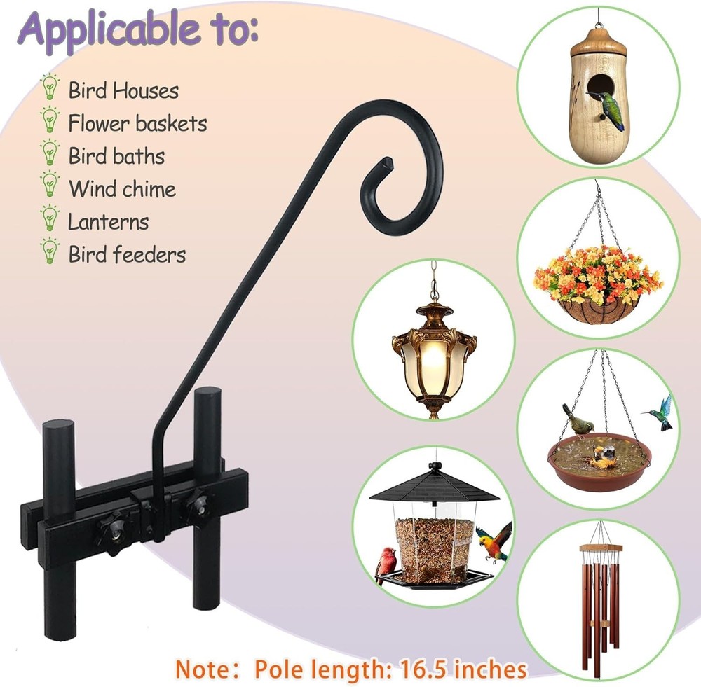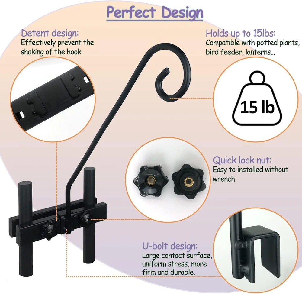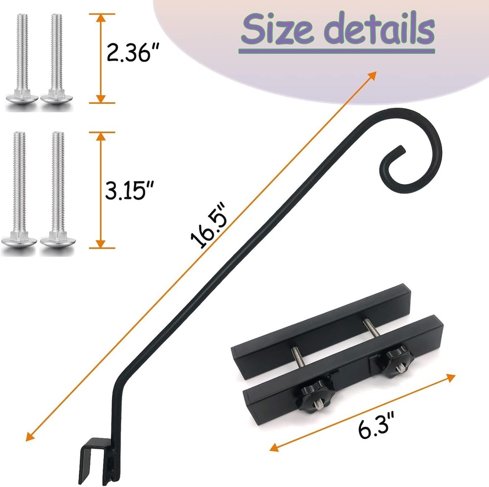 Deck Hook Rail Suitable for Hanging Flower Baskets Wind Chimes Planters Bird Feeders Lights, Heavy Duty Fence Deck Hook Rail Holds up to 15lbs with Ease Note: Pole Length: inches 【Multi-Use Hook Kit】 Hang Flower Baskets Bird Feeders Chimes Wreaths Lanterns on Any Deck, and very secure and fits almost any Rail Type - Holds up to 15 lbs Weight. 【Easy to Assemble】No wrench is required. Two sets of bolt types can be easily adjusted from 1/8” to 1 3/4” with nuts, which is compatible with the width / thickness of almost all spindles. Suggestion: Short bolt: the thickness / width of the main shaft is within 1 inch; Long bolts: spindle thickness / width 1” to 1 3/4”. 【Fine Material Selection】Railing Hanging Hook Kit is made of steel with black power coated surface. 304 stainless steel bolt witch is not easy to rust more sturdy and weather-resistant, reusable while adding to the exquisite look for your outdoor space. 【More Perfect Design】 1. Two fixing bolts enable it to be clamped more tightly and firmly; 2. The limit design on the steel rail prevents the hook from swinging with the wind; 3. The matched nut can be easily removed / installed without additional tools; 4. The adjustment range of 1/8” to 1 3/4” is suitable for almost all spindle thicknesses / widths. 【Best Service】Provides a true satisfaction SATISFACTION GUARANTEE and don’t hesitate to contact me if there is any problem.