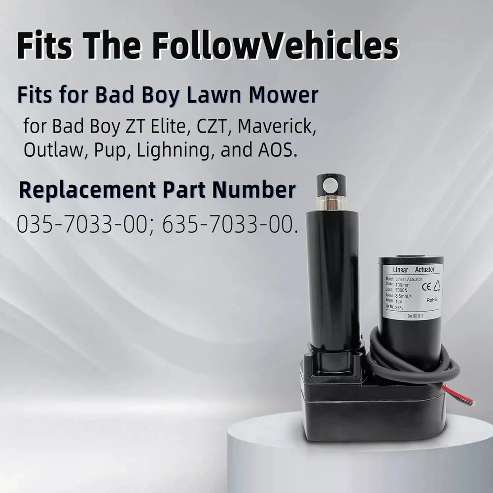 NEW-00023 Deck Lift Actuator For Bad Boy Lawn Mower ZT Elite CZT Outlaw XP AOS Accessory PRODUCT DESCRIPTION Deck Lift Actuator 035-7033-00 for Bad Boy Lawn Mower ZT Elite CZT Maverick 635-7033-00 Specification: Type: Deck Lift Actuator Condition: New Stroke: 100mm Load: 7000N Voltage: 12 V Color: Black Feature: 100% Brand New. Made of hight quality metal materials. Factory-spec and the perfect replacement part. Fitment: This Deck Lift Actuator Fit For Bad Boy Lawn Mower: For ZT 2007-2012 For ZT Elite 2013-2018 For Pup and Lightning 2008-2011 For CZT 2011-2015 For CZT Elite 2014-2015 For AOS 2007-2010 For Outlaw XP 2012-2018 For Maverick 2016-2018 Replace Part Number: 035-7033-00; 635-7033-00 NOTE: Please check the part number / model carefully before purchasing to insure fitment. Packing Included: 1Pc Deck Lift Actuator Shipping Contact Us Our products have been sent to the US warehouse. All items will be shipped via WINIT CORPORATION. In 2-5 working days, you will receive your items. Thank you and have a nice day. If you have any question about us or items, please contact us, we will reply it as soon as possible. Shipping Our products have been sent to the US warehouse. All items will be shipped via WINIT CORPORATION. In 2-5 working days, you will receive your items. Thank you and have a nice day. Contact Us If you have any question about us or items, please contact us, we will reply it as soon as possible. PaymentShippingReturn policyAbout usContact us Copyright © - Tongtool All rights reserved | Design:Tongtool