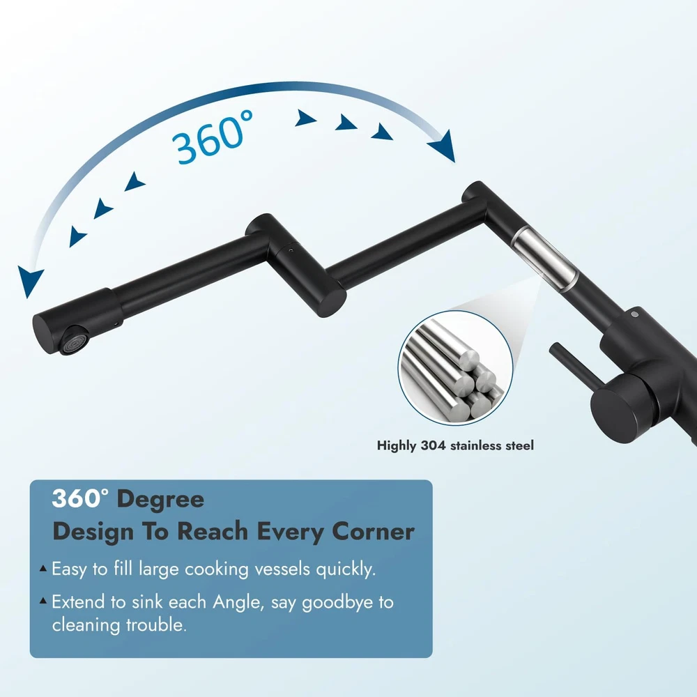 This pot filler faucet is a game-changer in the kitchen! The 360° rotating design makes filling pots so much easier, and the matte black finish adds a sleek, modern touch. The single handle controls hot and cold water smoothly, and the retractable feature is super convenient. Made of durable stainless steel, it feels sturdy and well-built. Installation was straightforward, and the water flow is strong yet efficient. Perfect for any home chef looking to upgrade their cooking space!