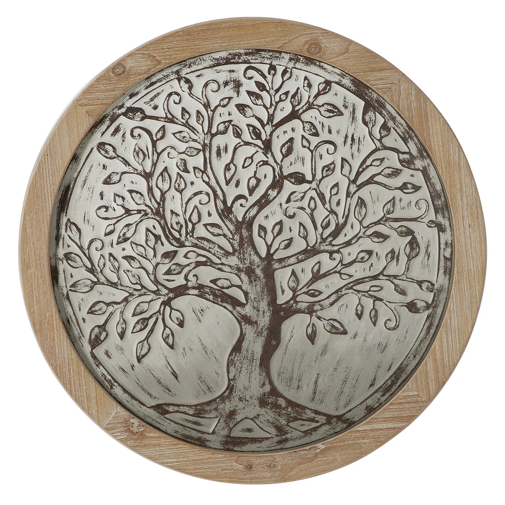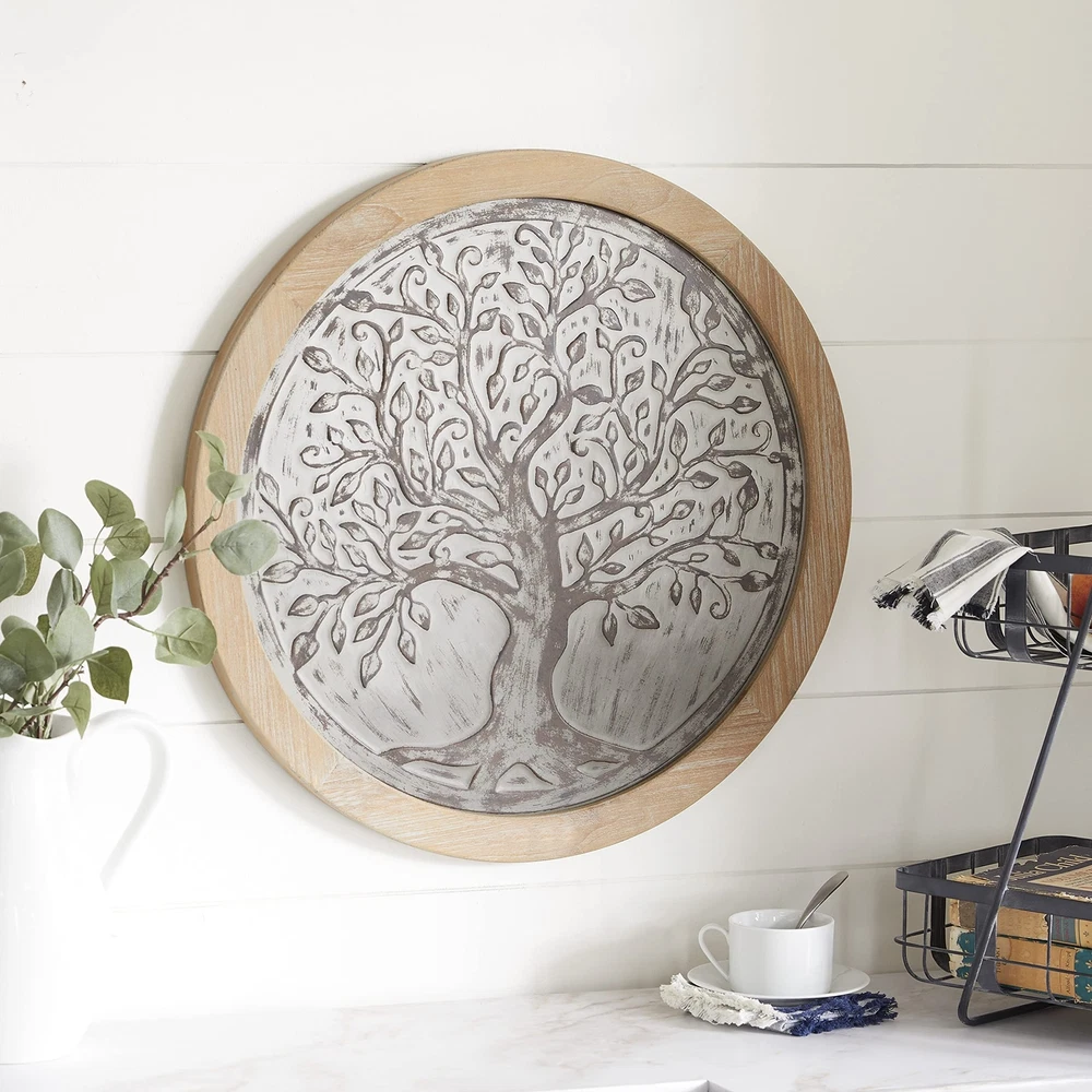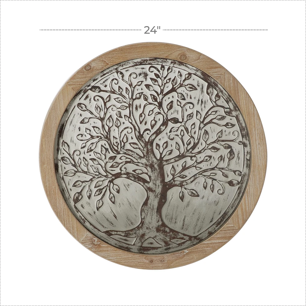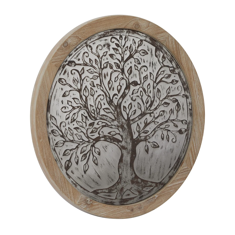 Deco 79 Wooden Tree Home Wall Decor Embossed Wall Sculpture, Wall Art 24" x 2" x 24", Brown Product Details Product Dimensions: 23.55 x 24 x 0.2 inches Item Weight: 4 pounds Manufacturer: Deco 79 Country of Origin: China Item model number: 53642 Care instructions: Wipe clean with a dry cloth Assembly required: No Number of pieces: 1 Warranty Description: No Warranty Batteries required: No FARMHOUSE THEME Infuse your home with cozy charm, where weathered textures, rustic finishes, and warm earthy tones create a wholesome atmosphere WOODEN WALL HOME DECOR Crafted from sturdy iron with an MDF backing, this brown home wall decor promises durability BROWN AND GRAY DISTRESSED FINISH Round decor for wall exhibits a rich brown panel and frame, further enhanced by white distressing, offering an appealing rustic charm FEATURES ROUND BOTANICAL WALL DECOR This wood wall decor boasts a detailed tree image with branches fanning outward, all encased within an elegant round wooden frame LARGE SIZE The brown wooden wall decor measures 23.55L x 1.55W x 23.60H inches, and weighs 2.90 lbs This tree wall sculpture's circular shape allows it to seamlessly fit into any corner of a warm-toned farmhouse living room, bedroom, or cozy reading nook. This item ships in 1 carton. Round wall décor featuring an elegant tree design. Can be hung vertically using the sawtooths; nails and screws not included. Suitable for indoor use only. This item ships fully assembled in one piece. This is a single brown colored wall sculptures. Farmhouse style.