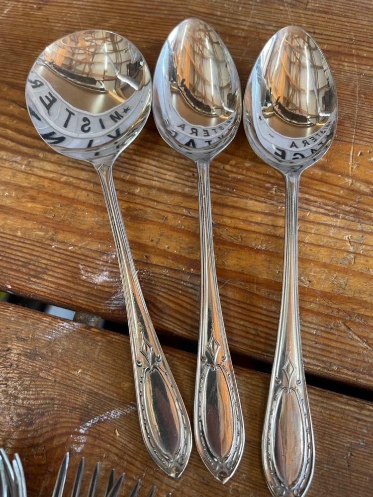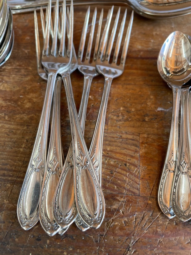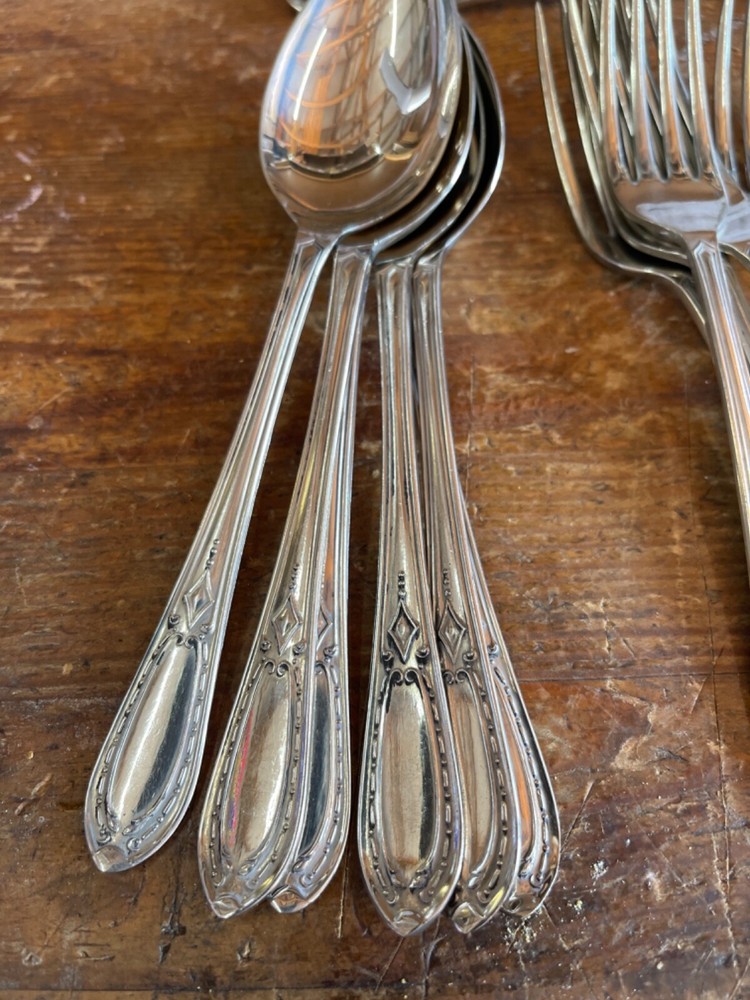 As photos and condition report 6 each of dessert forks and spoons, fruit spoons and coffee spoons, and 3 serving spoons All have nice pattern to handles and great lustre Thanks for looking