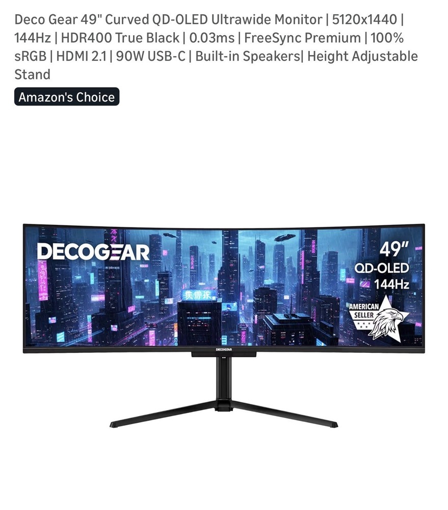 Deco Gear 49" Curved QD-OLED Ultrawide Monitor | 5120x1440 | 144Hz | HDR400 True Black | 0.03ms | FreeSync Premium | 100% sRGB | HDMI 2.1 | 90W USB-C | Built-in Speakers| Height Adjustable Stand