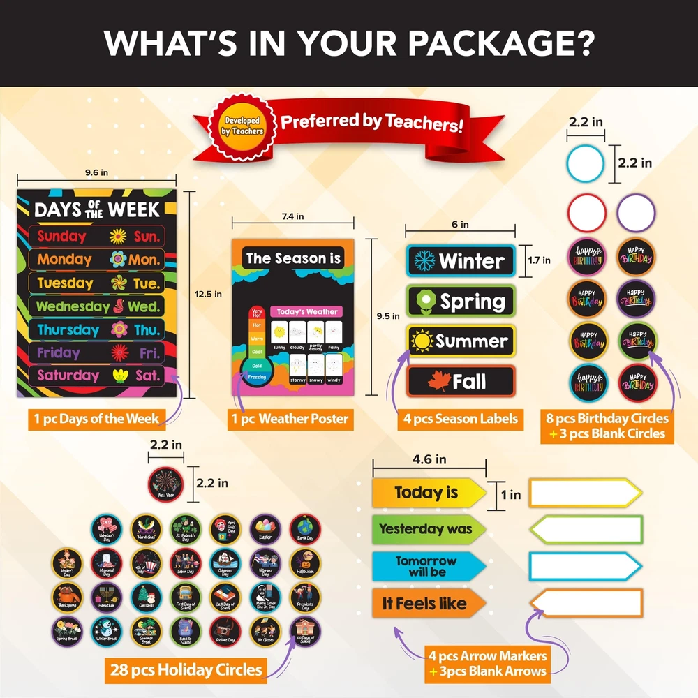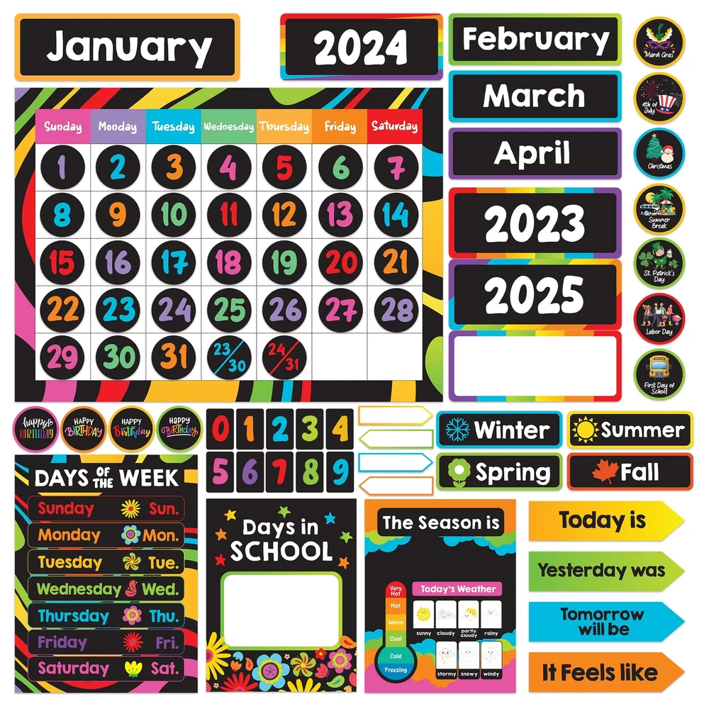 CALENDAR BULLETIN BOARD SET - Brighten up classrooms with days of the week poster for kids. This set includes a 4-piece calendar chart that is fun to assemble. It comes with 143 colorful cutouts that transform classrooms into a lively space! PLAY & LEARN - Teach them about dates, seasons, and events while creating an engaging learning environment with this wall calendar for classroom. Elevate students' learning space with this well-designed calendar school classroom calendar set. DESIGNED TO LAST - Experience the convenience of this pre-cut and sturdy classroom calander set. Crafted from high-quality gloss-laminated paper for easy writing & erasing, Elevate your classroom décor with this class calendar bulletin board set. IMPROVE LEARNING - Teach a sense of time and responsibility to students with this bulletin board calendar set for classroom. This will help students with topics like counting days, keeping track of major occasions, and celebrating birthdays. WE JUST WANNA MAKE YOU SMILE - Your happiness is our unwavering priority. If you ever find yourself less than delighted with your chalkboard preschool classroom calendar set & calendar for school classroom calendar, simply reach out, and it will be made right. Buy with confidence and don't miss out on this well-designed calendar for kindergarten classroom!