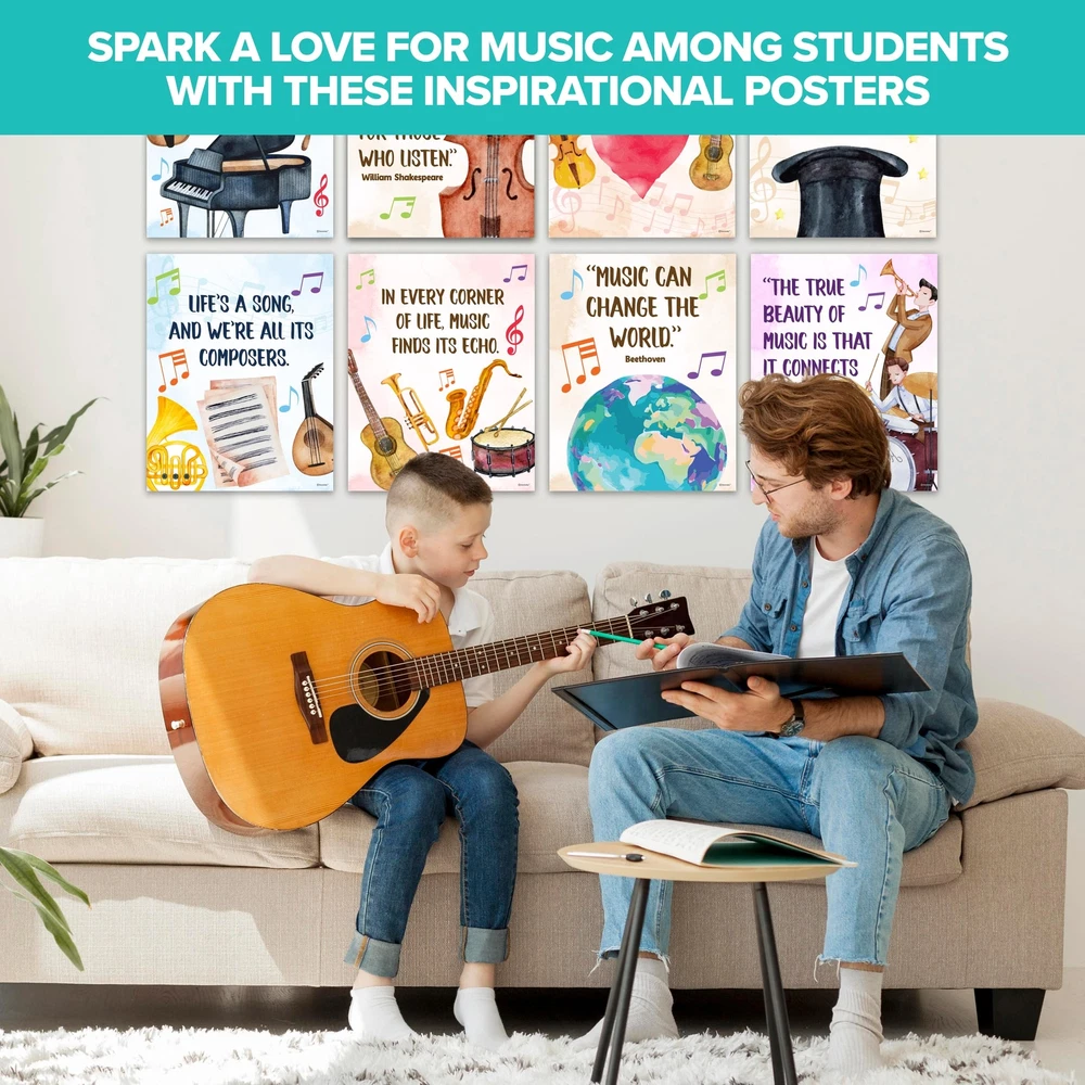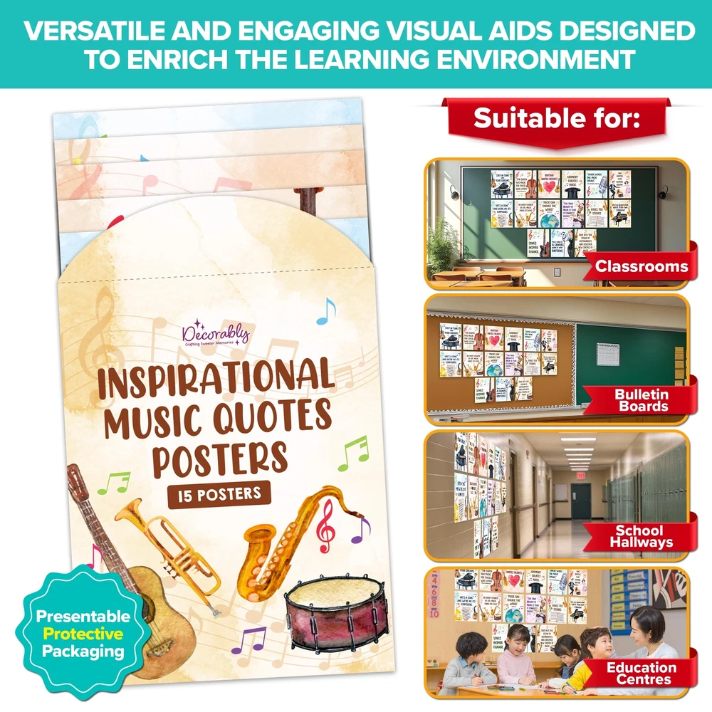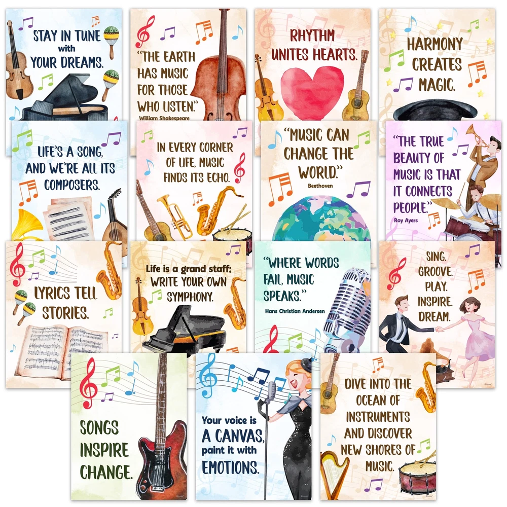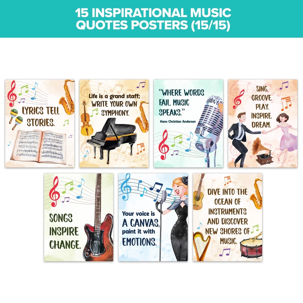 MUSICAL INSPIRATION - Expect 15 elementary music posters to ignite a passion for music among your students. These music class posters elementary revolve around inspiring quotes, captivating them to express their connection to music. ARTISTIC MASTERPIECE - These music teacher posters are artistic masterpieces that offer source of inspiration to students. Each choir posters for classroom provides a heartening music insight, inviting students to engage in a musical journey. EXCELLENT MATERIAL - Each music bulletin board decorations is treated with durable matte-laminated finish & non-glare qualities. These music room posters are printed on premium-grade paper at 11x14in, providing clear texts & vivid images. CAPTIVATING DECORS - These music class decor are visually captivating tools that provide valuable insight & practices. With a set of music decorations for classroom & music room decorations, students are exposed to wisdom & lessons of musical quotes. WE JUST WANNA MAKE YOU SMILE - Your happiness is our unwavering priority. If you ever find yourself less than delighted with your music preschool posters, simply reach out, and it will be made right. Buy with confidence and don't miss out on these music posters!