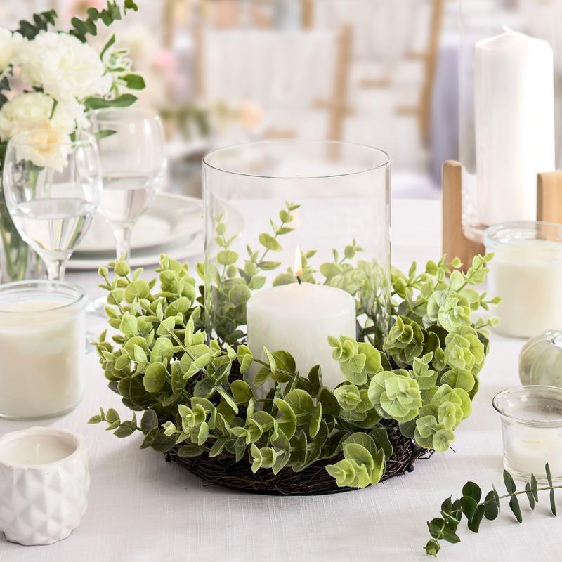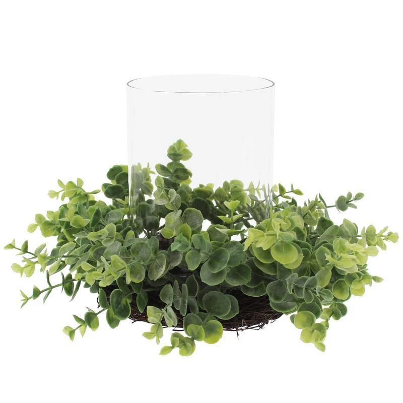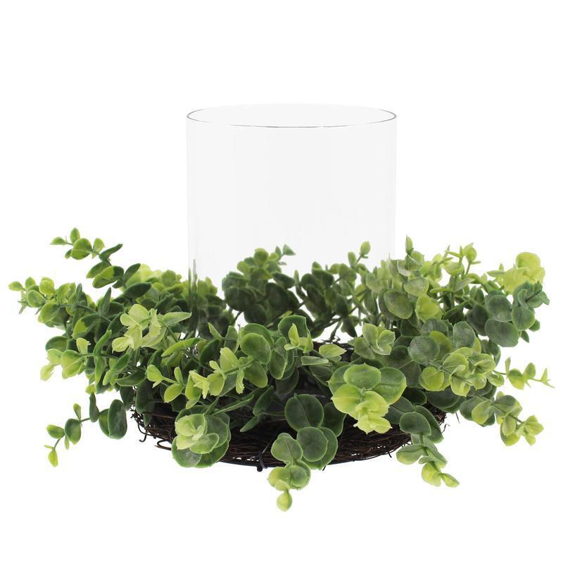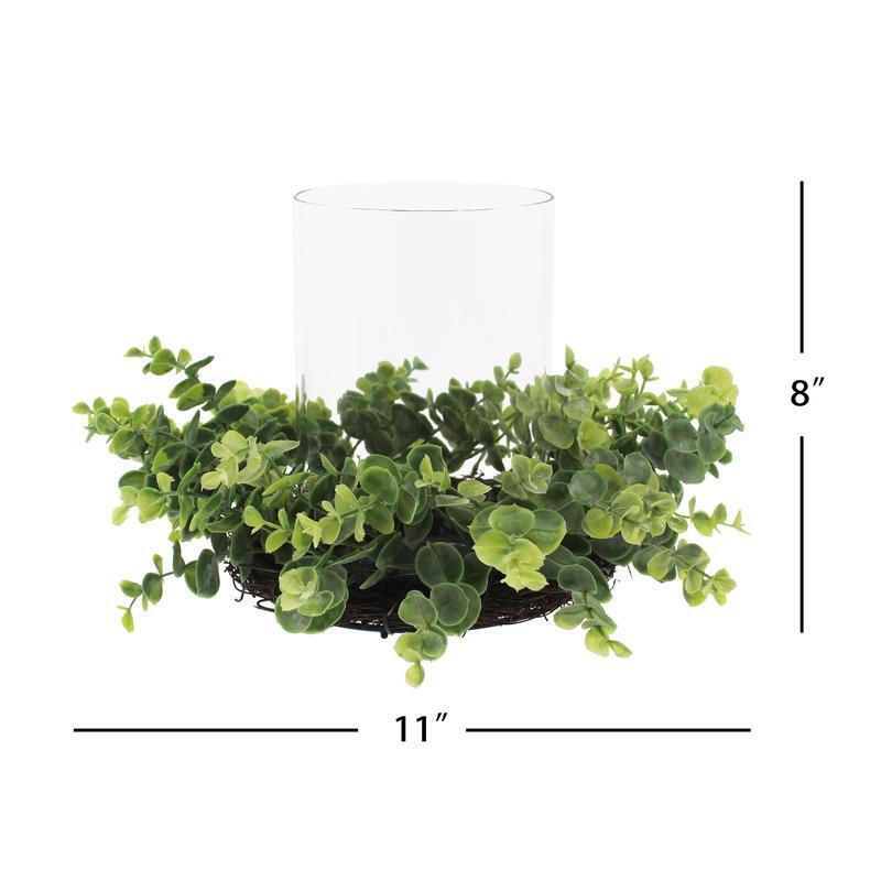 You may also like Decorative Black Metal Hammered Glass Pillar Candle Holder Lantern Indoor New 29.59 USD Free shipping Decorative Black Metal Pillar Candle Holder Lantern Indoor Outdoor Use 16.65 USD Free shipping The Mainstays Clear Glass Hurricane Candleholder with Green Faux Eucalyptus and Rattan Ring and Iron Base is a classic accent piece that will brighten up any living room, dining room, or office. This clear, glass hurricane candleholder with green, faux eucalyptus and rattan ring features a sturdy iron base and measures 11”L x 11”W x 8”H, so it’s sure to stand out as a stylish centerpiece on a coffee table, dining table, or side table. Designed to hold pillar candles 3 inches in diameter by 4 inches tall or everyday décor, this hurricane candleholder makes a fantastic gift for a friend or yourself. With a beautiful, traditional design, the Mainstays Clear Glass Hurricane Candleholder with Green Faux Eucalyptus and Rattan Ring and Iron Base makes a marvelous, complementary adornment for any room. Classic accent piece brightens up any room Clear, glass hurricane candleholder with green, faux eucalyptus and rattan ring features sturdy iron base and makes stylish centerpiece With multiple uses, it makes a fantastic gift for a friend or yourself Designed to hold pillar candles 3 inches in diameter by 4 inches tall or everyday décor Features a beautiful, traditional design for a marvelous, complementary adornment for any room Materials: Iron, glass, polyethylene, rattan Dimensions: 11”L x 11”W x 8”H Weight: 1. 34 lbs