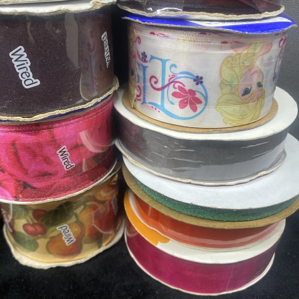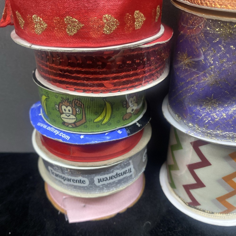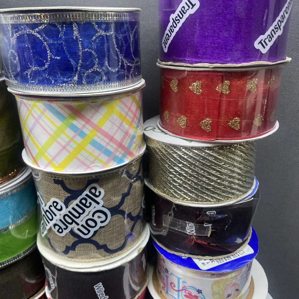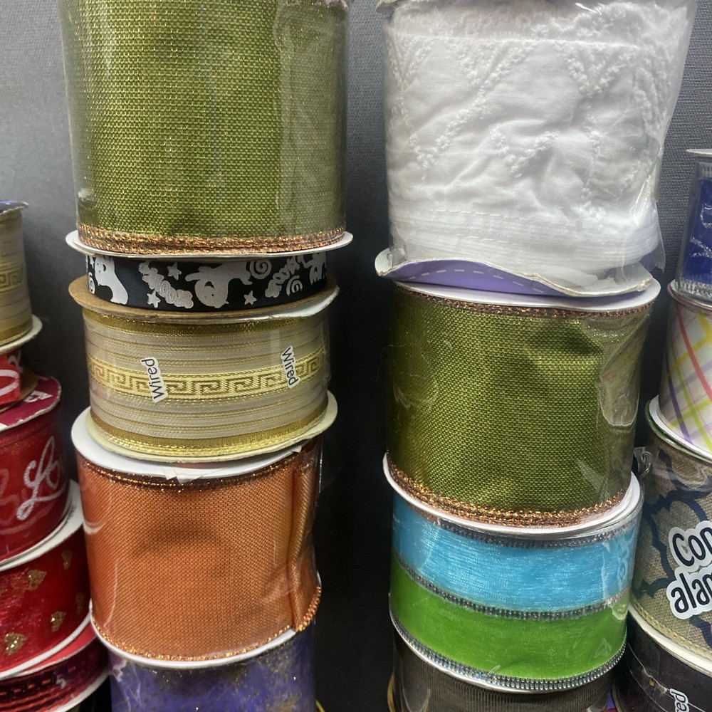 This lot of 37 decorative mesh pieces in various colors and sizes is perfect for crafting projects. The multicolor mesh is ideal for adding a festive touch to your creations. Made of mesh material, these pieces are versatile and can be used in a variety of ways. The assorted brands ensures quality, and the lot includes pieces from China in a style that is suitable for a range of crafting needs. Whether you're looking to add some sparkle to your crafts or create unique designs, this lot of mesh is sure to inspire your creativity. Most rolls are full Some rolls have been used and retaped. Great variety!