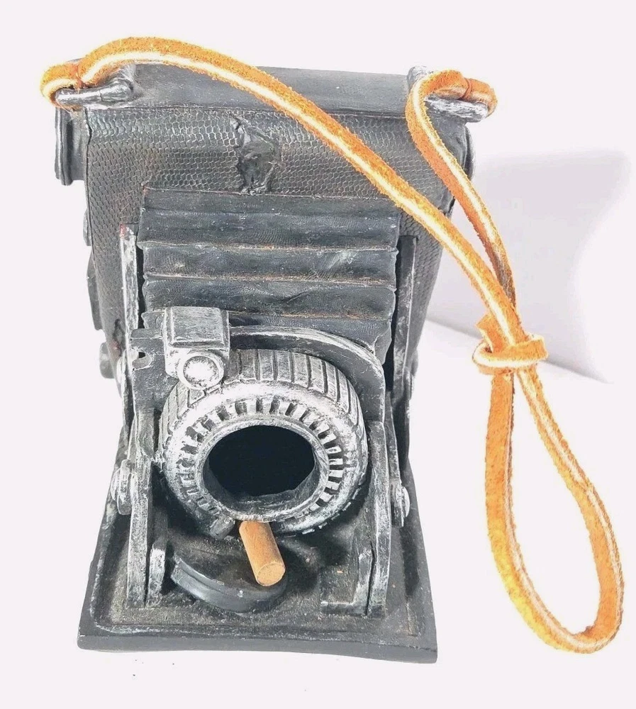 This decorative old fashioned folding camera replica is made of resin with a leather strap, standing at approximately 5 inches tall. Its classic design and black color give it a timeless appeal, perfect for adding a touch of nostalgia to any collection or decor. This unique piece combines the old-fashioned style with modern materials, making it a versatile and eye-catching addition to any space. Made in China, this one-of-a-kind item is sure to stand out in any collection of decorative items.