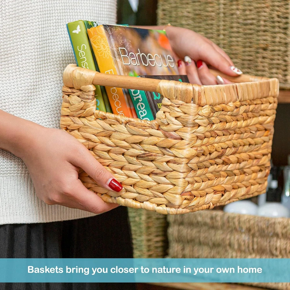 ✅ Wicker Baskets - Whether it be by way of pure decor, storage, or organization for kitchen, pantry, or bathroom. This basket wicker suit your home in every way. The rectangular baskets wicker is great for magazines, games, pet toys, media, household items. ✅ Natural & High Quality - Our small rectangle basket storage are made of Water Hyacinth, an all-natural and easily renewable resource with an iron frame for sturdy storage. The wooden handles on both sides are not only pretty but to help you easy to carry the wicker basket. ✅ From Vietnam - The handicraft of making rattan wares from hyacinth has become a Vietnamese tradition for years. Wicker baskets made of natural Water Hyacinth promote a healthy world. These basket hyacinth were born with a mission to deliver Vietnamese hearts and souls to international friends. It will definitely serve your purpose well. ✅ Small Wicker Baskets: 10"L x 7.5"W x 6.3"H. These small rectangular wicker baskets are convenient and easy to storage for drawers, shelves, desks, or in the house. Please kindly make allowances for slight variations due to the handcrafted nature of these goods. Just use a damp cloth and wipe it gently for cleaning. ✅ Perfect Gift Idea - Our natural wicker decorative baskets is a great way to make a difference by promoting a sustainable lifestyle, a thoughtful and useful gift for anyone who supports a plastic-free environment Product information Material Water Hyacinth Color Water Hyacinth Shape Rectangular Product Dimensions 7.5"D x 10"W x 6.3"H Style Rustic Room Type Pantry, Bathroom, Home Office, Entryway or Mudroom, Kitchen, Bedroom, Living Room, Nursery, Dining Room Recommended Uses For Product Storage Number of Pieces 3 Finish Type Natural With Lid No Handle Material Wood Closure Type Open Top Special Feature Sturdy