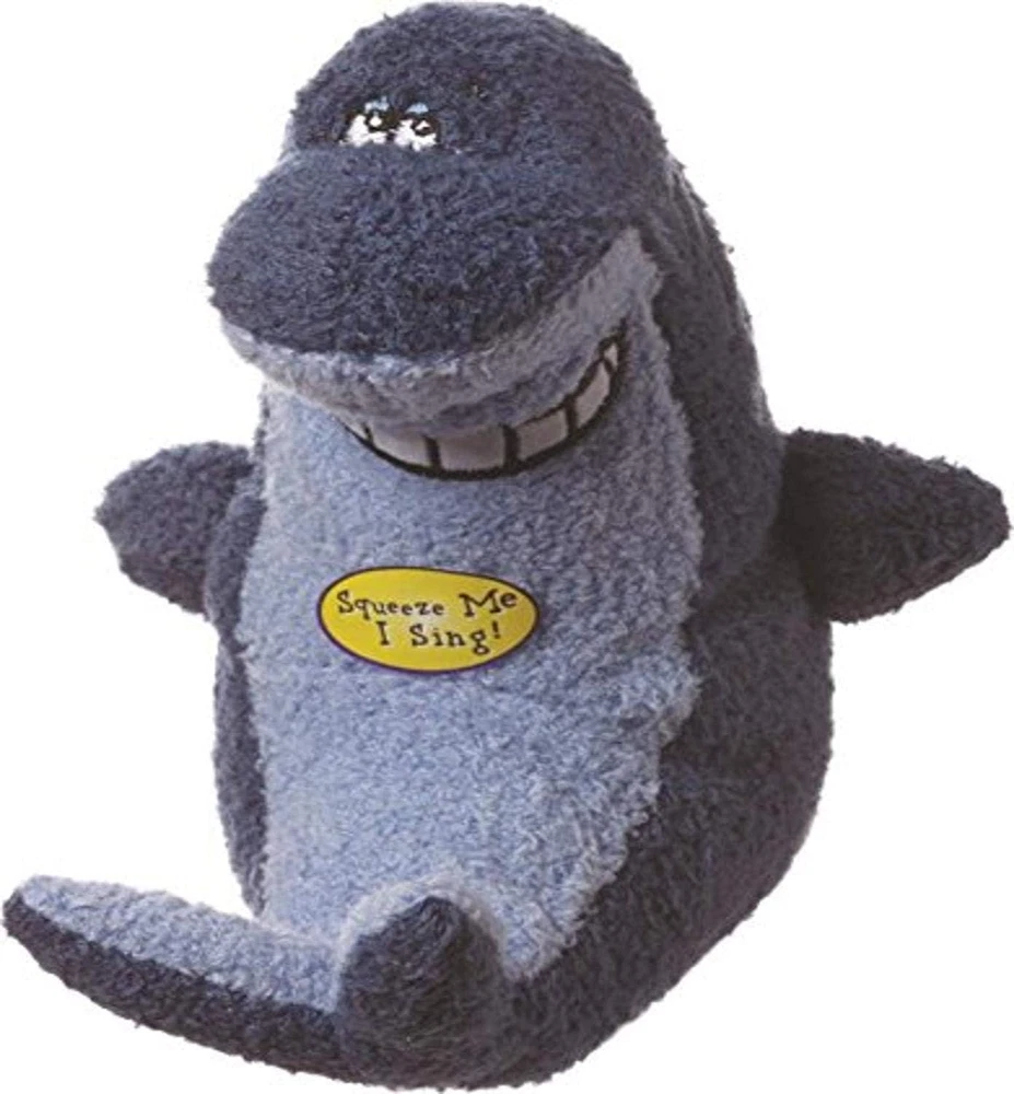 Singing Dog Toy Fun for Fetch and Play Plush filled Pets should be supervised while playing with toys and all damaged toys should be discarded Multipet's Deedle Dude Shark. This blue plush filled Shark contains a voice box that sings the unique Deedle Dudes anthem when the dog squeezes the toy. This toy is a fun and cute item that pets enjoy.
