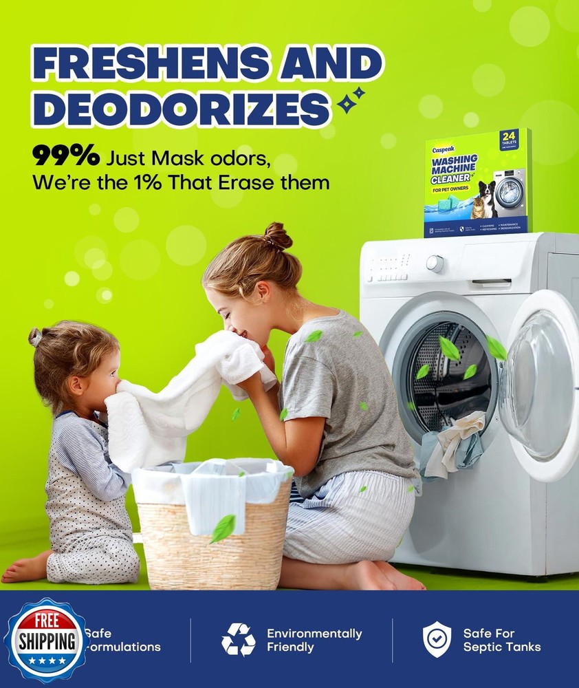 Deep Cleaning Washing Machine Cleaner Tablets, No More Odor and Pet Fur Washing Machine Cleaning Tablets, Washer Cleaner For HE Top Front Load, Septic Safe, 24 Counts/1 Year Supply Features POWERFUL ActivePLUS FORMULA, RENEWS YOUR WASHER - The all-new, upgraded Caspeak ActivePLUS formula with 2X active ingredients, delivers deep-cleaning strength that tackles what you can’t see! From grease and limescale to sweat, detergent residue, and pet fur—our washing machine cleaner uses targeted ingredients to break down every type of buildup. Deep clean, fresh start—just Caspeak washer cleaner. WE DON’T HIDE ODORS, WE WIPE THEM OUT- Caspeak washer machine cleaner tablets use a powerful “ODOR-LOCK” technology, capture and destroy odors at the molecular level — and eliminate them down the drain for good! With a fresh, light scent and minimal fragrance, our washer cleaner tablets leave your washer truly fresh — no lingering awful smells like others. Feel the powerful odor removal in just 1 use! PESKY FUR? LET OUR ENZYME FORMULA HANDLE IT - Caspeak pet hair dissolver for washing machine contains patented multi-enzyme complex. It targets fiber chains in pet and human hair, breaking them down and 100% dissolving them. Specially made for pet families, Caspeak laundry cleaner dissolves quickly and leaves no chemical residues behind — safe for both pets and humans. Say goodbye to pet fur clinging to your clothes after every wash! LONGER WASHER LIFE, STARTS WITH A SAFE CHOICE - Don’t let residue buildup ruin your washer! Use our laundry machine cleaner monthly to clean inner parts like the drum, valves, and hose pipes deeply and thoroughly — extends your washer’s life, restores optimal performance, andand saves you costly manual cleaning fees! Unlike others that may harm your washer, our washing machine cleaning tablets is safer, eco-friendly, and septic tank-safe! YOUR SMILE, OUR COMMITMENT - Caspeak top front load washing machine cleaner is designed to work both front and top load washers including HE. Please comfirm it's empty inside the washer before use. We recommend monthly dosage, 1-2 descaler each time (adjust according to your needs. 1 box can be used for 1 year if you take 2 counts 1 time). We stand by our products with a hassle-free after-sale service. If you’re not satisfied, you can request a free replacement or refund, no returns needed. Shipping Free & Fast Shipping: We offer free shipping to most of the USA with a normal delivery time of 3-7 days. However, due to the current situation, additional delivery time (up to 3 weeks) may be required for some items. Alternative Carriers: We may use alternative carriers (e.g., USPS, FedEx, UPS) to ensure your package arrives safely and on time. Due to the use of multiple carriers, we are unable to provide a tracking number automatically. Handling Time: Orders are processed and shipped within 1-2 business days of receiving cleared payment. Shipping Restrictions: Shipping to Alaska, Hawaii, Puerto Rico, Guam, and other US territories may incur shipping charges or delivery restrictions. Please contact us before ordering, or your order can be refunded/cancelled. State Restrictions: Certain items may not be shipped to California due to state regulations. Contact for Tracking Updates: If you require tracking updates or have any concerns about the delivery of your order, please feel free to contact us, and we will be happy to assist you. Return Policy 30-Day Hassle-Free Returns: If you are not completely satisfied with your purchase, you can return the item for free within 30 days of receiving it for a full refund or exchange. Easy Return Process: Contact us, and we will provide you with a prepaid return shipping label and detailed instructions. No Restocking Fee: There are no restocking fees for returns. However, the buyer is responsible for return shipping costs if the return is not due to a seller"s error. Refund Processing: Refunds will be processed within 1 business day of receiving the returned item in its original condition. Feedback Your feedback is extremely important to us. We strive to provide the best products and customer service possible. If you are satisfied with your purchase, please take a moment to leave us a positive review. If you have any concerns or issues with your order, please contact us before leaving negative feedback. We are committed to resolving any problems and ensuring your satisfaction. Contact Us If you have any questions or concerns, please feel free to reach out to our customer support team. You can contact us through the eBay messaging system. We are available Monday to Friday, 9:00 am to 5:00 pm EST, and we will do our best to respond to your inquiry within 24 hours. Thank you for supporting our small family business!