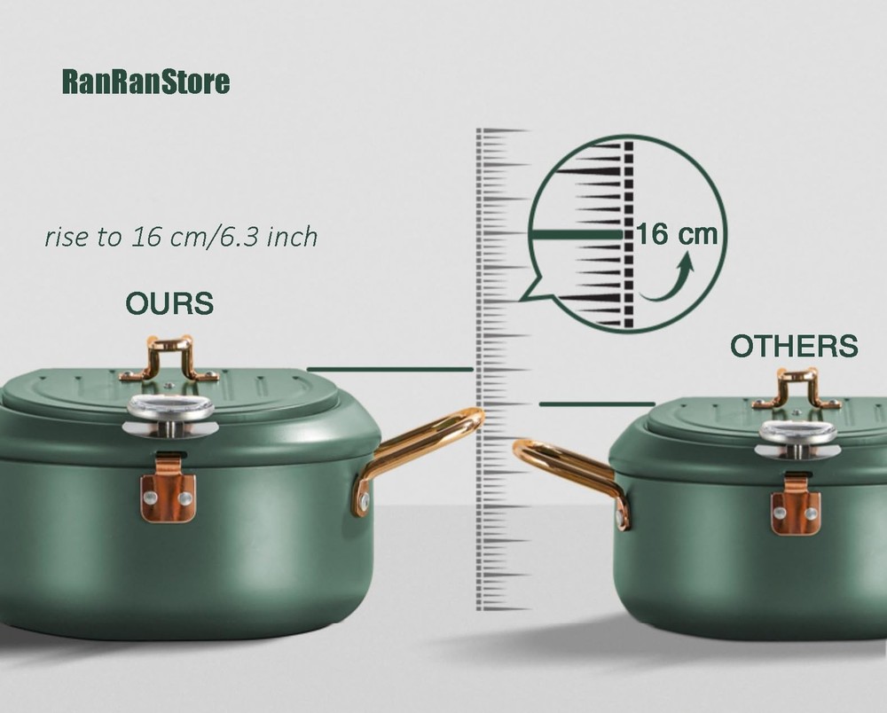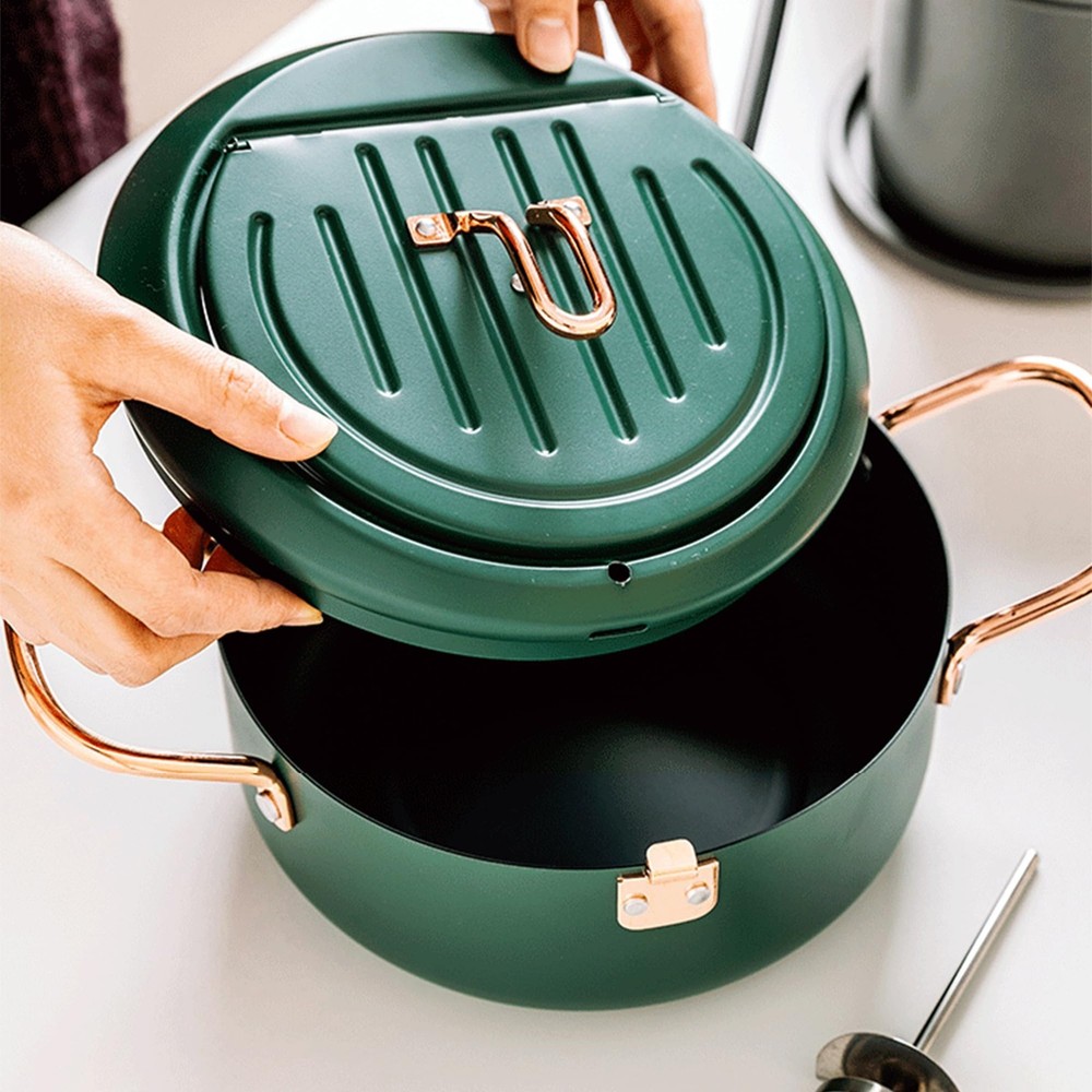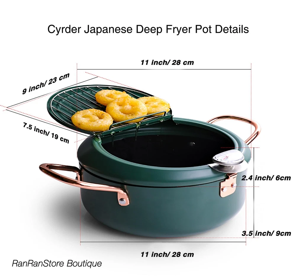 Exquisite Green & Gold Japanese Deep Fryer Pot Premium Carbon Steel with Advanced Non-Stick Coating -- Expertly crafted from premium carbon steel for superior heat conductivity and frying performance, this pot features a innovative temperature-resistant non-stick coating on both the interior and exterior. This coating prevents food from sticking, resists rust, and makes cleaning remarkably easy. The elegant gold-finish handle adds a touch of sophistication and style to your kitchen Large Capacity & Optimized Deep Design -- With a generous 150 oz (approx. 4.4L) capacity, an 11-inch diameter, and an extra-deep 3.55-inch interior, this fry pot accommodates large portions while significantly reducing oil splatter. We recommend using about 2 liters of oil for efficient and enjoyable frying. It heats quickly and works seamlessly on all stovetops, including induction, gas, and electric. Precise Temperature Control with Built-In Thermometer -- Achieve perfect results every time with the integrated Fahrenheit thermometer. Take full command of your frying: maintain ideal temperatures at 300-320°F for vegetables, 320-340°F for meats and poultry, and 350-380°F for seafood. Create crispy, golden, professional-quality tempura and other favorites with ease. Health-Conscious Frying with Less Oil -- Enjoy guilt-free indulgence in your favorite fried foods like tempura, chicken, and fish. The deep design and temperature control allow you to use less oil, resulting in lighter, less greasy meals that are both delicious and better for you. The thermometer helps prevent overheating, preserving oil quality and enhancing flavor. Ideal Tool for Authentic Japanese Tempura at Home -- Designed specifically for tempura enthusiasts, this fryer empowers you to create master-level dishes in your own kitchen. Its combination of precise heating, large capacity, and elegant design makes it an essential tool for achieving restaurant-quality results with confidence and convenience.