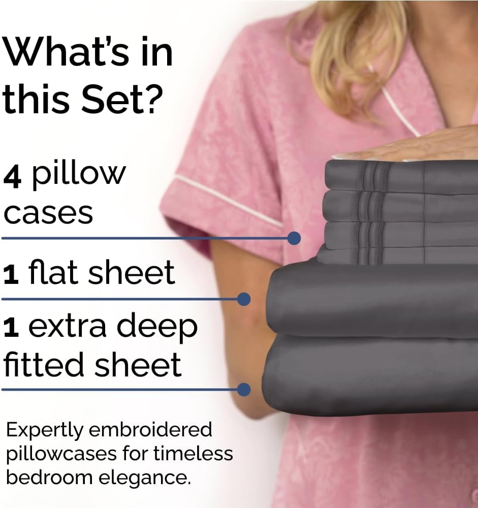 Store New Arrivals Add to Favorite View Feedback Contact Extra Deep King Sheet Set - 6 Piece Breathable & Cooling Sheets - Hotel Luxury Bedding Set W/18-24 Inch Extra Deep Pockets - Easy & Secure Fit - Super Soft, Wrinkle Free and Comfy - Grey, King Size Description Item model number 21InchKingGrey Style 21Inch 6 Pcs Sheet Set Pattern Solid Country of Origin China Theme Solid Number of Pieces 6 Unit Count 1 Count Pillowcase Quantity 4 Material Microfiber Age Range (Description) Adult Seasons All Is Discontinued By Manufacturer No Package Dimensions 12.4 x 10.64 x 4.93 inches Closure Type Pull-On Item Weight 4.24 pounds Special Feature Wrinke-Free, Hotel-Quality Color 07 - Dark Grey Thread Count 200 Included Components 4 Pillowcases, Fitted Sheet, Flat Sheet Product Care Instructions Machine Wash Size King EXTRA DEEP POCKET KING SHEETS / EXTRA DEEP FITTED KING SHEETS: These bed sheets are for very deep pocket mattresses. They fit any mattress with pockets that are 18, 20, 21, 22 and 24 inches deep. There's stretchable elastic around the extra deep fitted sheet which stretches for a nice tug around your mattress. Perfect for extra tall & large mattresses. Rest assured these oversized sheets will stay on tight & stay in place! 6 PIECE SHEET SET: This bed sheet set comes with 4 pillowcases total all with a beautiful decorative embroidery design on each pillow case. The pillow cases have enclosure designs. This bedding set will accommodate your extra thick mattress perfectly. GREAT FOR DOUBLE PILLOW TOP MATTRESS: These bed sheets are perfect for mattresses with a 3 inch or 4 inch topper on top, memory foam toppers, big mattress pads, pillow tops, foam toppers, big foam toppers, pillow top mattresses and memory foam. These sheets will not come off. MICROFIBER: These are the softest type of microfiber bed sheets we have created. Super soft with a light feel. Not crisp like cotton. If you're accustomed to cotton sheets and you've never tried microfiber sheets we recommend you give these a try. They're even softer than cotton! DIMENSIONS & SIZES: Flat Sheet 111 wide and 102 long. Fitted sheet 78 wide and 80 long with 21 inch pockets (has elastic so it can stretch). All four pillow cases are oversized 20 x 40 inch. Product Description The video showcases the product in use. The video guides you through product setup. The video compares multiple products. The video shows the product being unpacked. Shop the CGK Linens catalog of luxury bedding products Add to Cart Add to Cart Add to Cart Add to Cart Customer Reviews 4.4 out of 5 stars 82,932 4.6 out of 5 stars 44,986 4.4 out of 5 stars 3,108 4.6 out of 5 stars 31 Price $59.99 $ 59 . 99 $13.99 $ 13 . 99 $39.99 $ 39 . 99 $192.00 $ 192 . 00 Fits Sizes 18 to 24 Inch Mattress 30" Length x 19" Height Twin, Full, Queen, King 18 to 24 Inch Mattress Triple Embroidered Pillowcases Triple Embroidered Triple Embroidered X Triple Embroidered Envelope Enclosure Pillowcases Envelope Enclosure Envelope Enclosure X Envelope Enclosure OEKO-TEX Certified Yes Yes Yes Yes Product Care Machine Wash Machine Wash Machine Wash Machine Wash Wrinkle Proof Yes Yes Yes Yes Fade Proof Yes Yes Yes Yes Stain Proof Yes Yes Yes Yes ABOUT US We offer the best prices around on high quality products. Our E-store includes media such as books, movies, music and games while offering electronics, toys, sporting apparel, clothing, tools, general home, garden items and more. SHIPPING We are always working hard to ensure your package arrives as soon as possible. Please understand that some factors like weather, high postal traffic, and the performance of shipping companies are outside of our control. We offer free shipping to the lower 48 states and ship within 2 business days of payment, usually sooner. We do not accept P.O. Boxes. Please provide a physical address. For shipping outside of the continental USA, we only use eBay's Global Shipping Program.The item is shipped to KY and then sent to the rest of the world. International customers are responsible for all duties and taxes. Continue to check out in order to calculate costs for shipping the item to your country. Messages regarding eBay's Global Shipping Program MUST be directed at eBay EXCLUSIVELY. RETURNS We offer a 30-Day Return Policy on items which you are not completely satisfied with. You have the option for a full-refund or an exchange of the item. No returns are available on items shipped outside of the USA. PAYMENT We accept PayPal. CONTACT US This page content is yet to come Please ad us to your favorite seller and visit again later Thank You CUSTOMER SATISFACTION We try our very best to make sure every customer is completely satisfied. If there's a problem, message us! We're happy to help. WE ACCEPT Copyright © 2021 AutoDS. | All Rights Reserved
