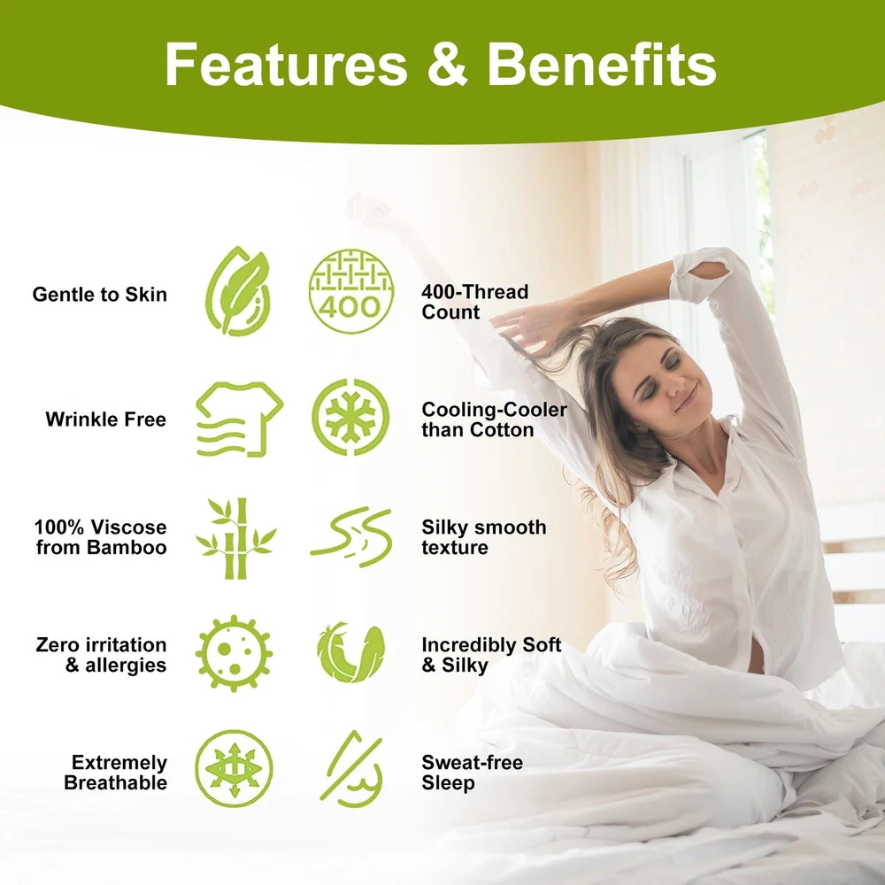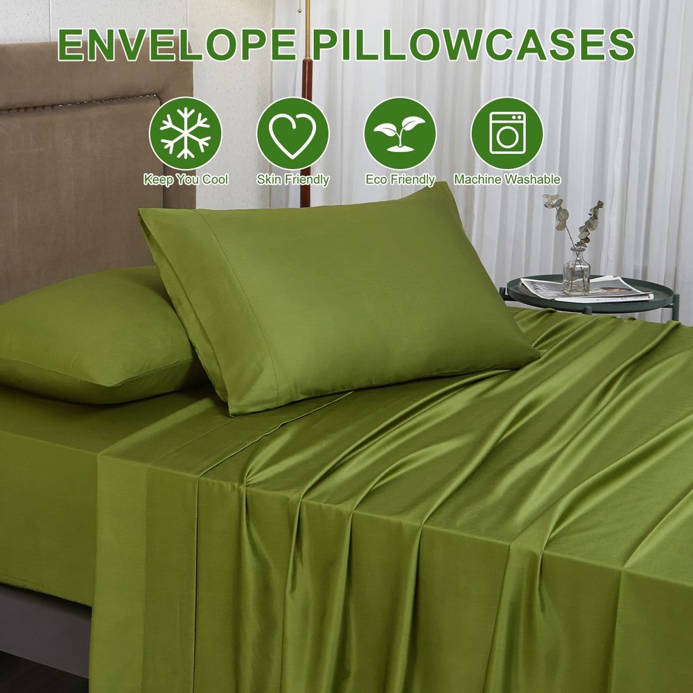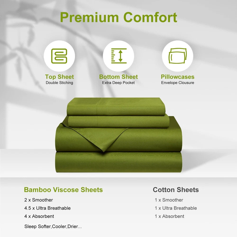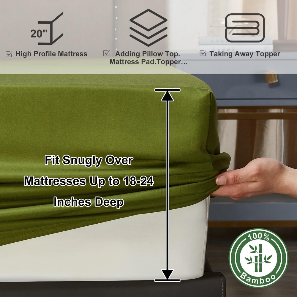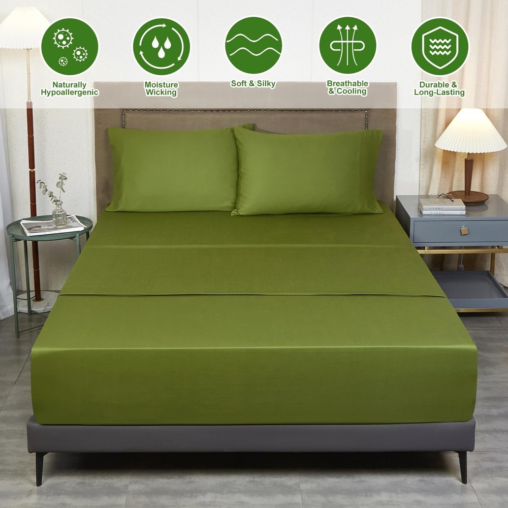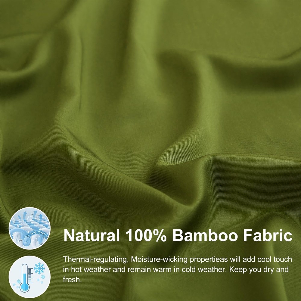 ABOUT : focuses on home textile products, we use the highest quality raw materials to provide you with high-quality products and quality services. Our use of high-quality materials, launched a four-piece set of 100% Rayon Derived from Bamboo, including 1 fitted sheet,1 flat sheet and two pillow shams. 【Cooling Bed Sheets Set】Queen bed sheets are designed to provide you with that luxurious, smooth silky feel.100% Rayon Derived from Bamboo without any other added ingredients, Treat Yourself to the Softest with the cooling Sheets Set and Make the most of your sleep hours with the most comfortable sheets that will let you drift off and wake up refreshed the next day. 【Breathable Cooling Sheets with Silk Feel】Our cooling sheets fabric is soft like the finest cotton or silk, it can adjust to your body temperature, keep you cool and relaxed while sleeping and providing all season comfort. It has very fast wicking properties that allow it to be 3-4 times more absorbent than cotton, it means you will stay cooler in the summer and in the winter the fabrics are warm but at the same time allowing more air between you and your skin, so overheating is prevented. 【Extra Deep Pocket Queen Sheets Set】Our deep pocket fitted sheets Queen has extra deep pocket that fit mattresses up to 18"-24" deep with added stretch and durable elastic 360° around the fitted sheet, these sheets grip and fit better than any other sheet set! Luxury Queen Bed sheet set is designed to fit nearly all mattresses, especially thick mattresses, double pillow-top mattresses, memory foam toppers, big mattress pads, or air mattresses... 【4 Piece King Bed Sheets Set】King sheets set includes 1 flat sheet (108"x102"), 1 fitted sheet (78"x80") and 2 pillow cases (20"x40"). Our cooling fitted sheet is 20 inch deep, it can stretch to fit the mattress up to 24"inches. A gripping all-around elastic band can hold them in place and bring you a perfect restful sleep. Silky texture sheet set is softer than Egyptian cotton sheets and designed to soften with each wash ensuring increasingly cozy nights over time. 【EASY CARE, HYPOALLERGENIC】These cooling queen sheets deep pocket are durable and machine washable, shrink and fade resistant. Wash your sheets in cold water on a gentle cycle, air dry on the line or tumble dry on a low temperature. Unlike other materials, rayon from bamboo in textile form is able to retain many of the properties that it has as a plant. It has a naturally smooth drape especially if you promptly remove it from the dryer.