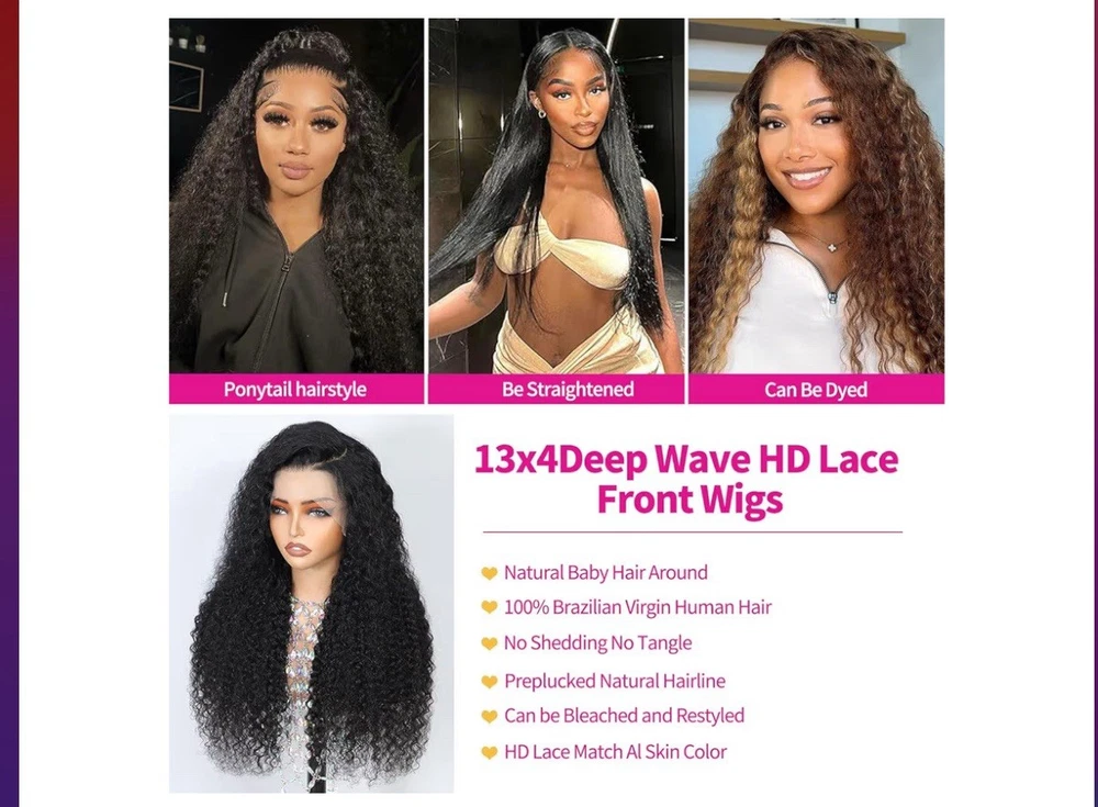 Lace Front Wigs Human Hair Material】:13x4 Deep Wave Lace Front Wigs Human Hair 10A Grade 100% Unprocessed Human Hair Wig,Cut From Young Donor Directly, It's Soft, Clean, Thick and Free of Unpleasant Odors, Giving You a Comfortable, Silky Experience with Little to No Hair Loss or Tangles. Natural Look,Full and Thick,Health and Comfort,Smooth and Bouncy with Natural Luster and Color.Makes You Outstanding and Attractive in the Crowds. 【13x4 Lace Front Wig Human Advantages】:13x4 Lace Front Wigs Human Hair Has the Larger Lace Space.You Can Make Free Part and Try to Diy More Hairstyle as You Like. Not Let You Sweat , Easier To Wear, You Will Fell More Breathable. The HD Transparent Lace Frontal Wig is Very Soft and Invisible, Melt with Your Skin Perfectly. Wig Lace: Super Thin Swiss HD Transparent Lace, Clean, Healthy, Soft and Bouncy,can fit most skin color tones; Hair Knots are Very Small and Can be Bleached, 4 Inch Deeper Part and Longer Hairline, Can Make any Part As You Wish.Can Make You Leading the Fashion. 【Lace Front Wig Human Hair Details and Cap Process】:13x4 deep wave lace front wigs human hair ,Lace Front Wigs Human Hair for Woman.Pre Plucked with Baby Hair and Natural Hairline, Hair Knots are Very Small,Match all Skin Color Perfectly.HD Lace Front Wigs Cap(21.5-22.5 Inch)with 4 Combs and 2 Adjustable Straps Make It Fit Most People,Firm and Snug.Wig Elastic Bands Allows to Change The Tightness to Fit Your Head Circumference.Easy to Wear and Remove. 【deep wave lace front wigs human hair Texture and Density】:We Choose the Human Hair to Make the deep wave lace front wigs human hair, to Ensure That Every wigs human hair You Receive is a Qualified Product. 13x4 Lace Front Wig Human Hair 200% Density True to Length & Weight, no Shedding, Tangle Free, Can be Side Part, Middle Part, High Ponytail& Bun,Can be Dyed, Bleached and Restyled According to Your Like, Looks Realistic Like Your Own Hair. 【deep wave lace front wigs human hair Suitable Occasions】: deep wave lace front wigs human hair Looks More Natural and Full. Can Make Free Part, Middle Part and Side Part,Etc. You Can Wear The Wig to Any Occasion Including Wedding, Festivals, Graduation Ceremony, Party or Annual Christmas party ,Daily Life and So On.Make You the Most Charming.