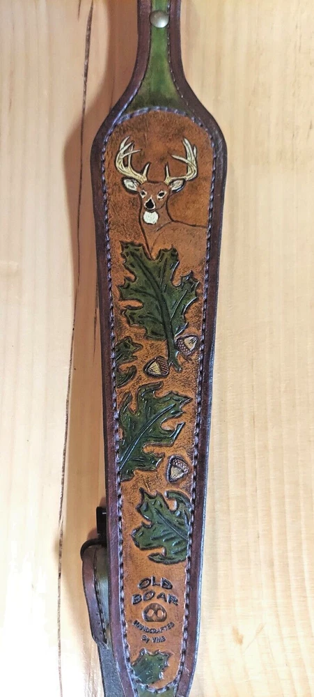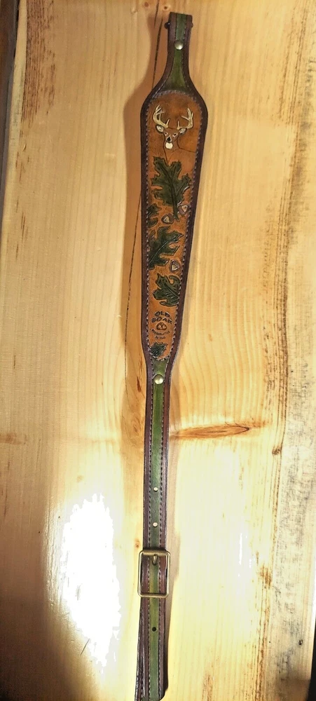 Custom leather rifle or shotgun sling, suede padded, deer with oakleaves, hand carved and stitched, thumb loop, adjustable 33" - 38", 8-10oz veg tanned leather, colored two toned with tan antique finish, swivelsincluded. Made in Wisconsin. USA shipping only. We do custom orders!