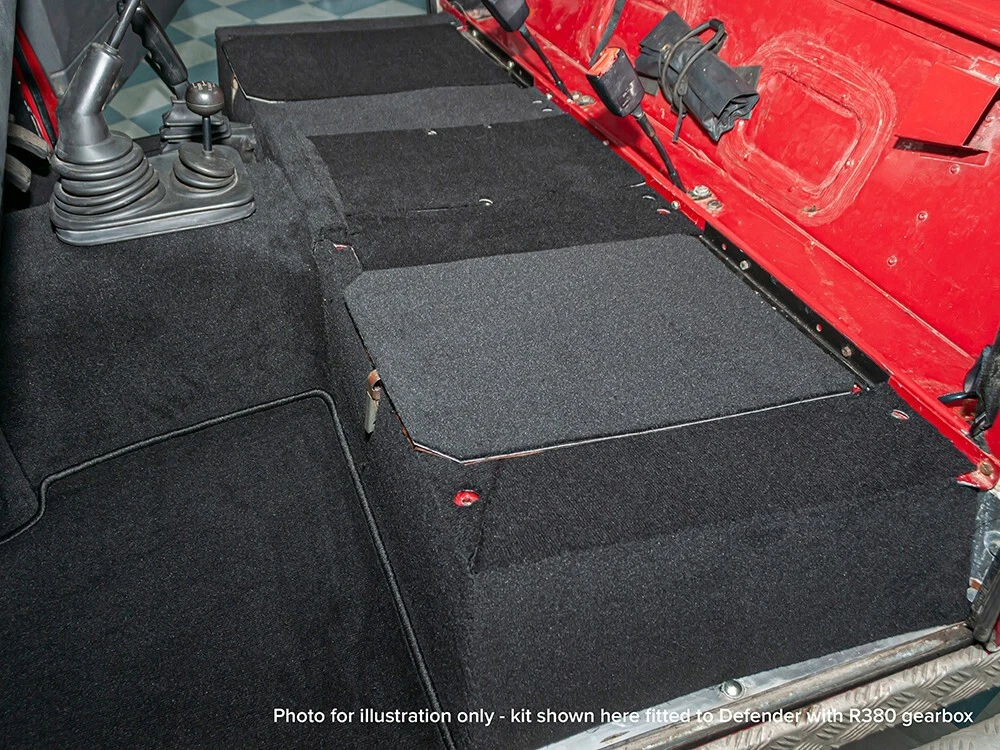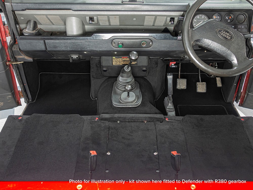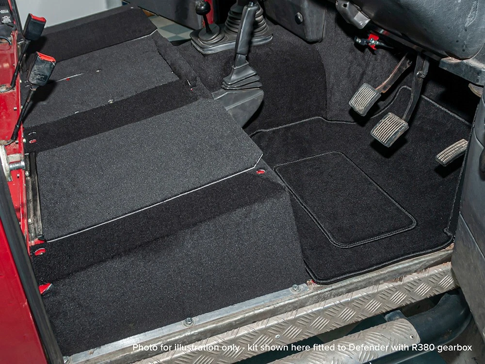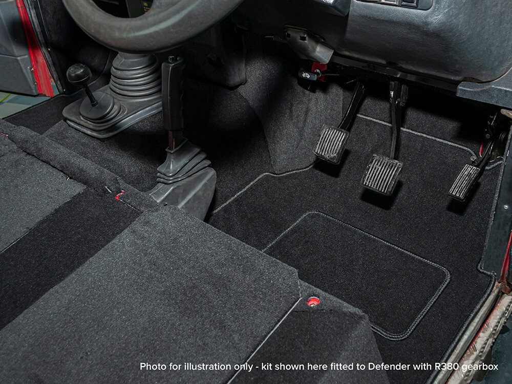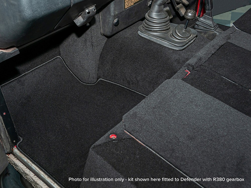 Full carpet set for Defender 200Tdi models 1990 to 1993 (Factory Station Wagons) with 4 inward facing seats & Square Arches with LT77 Gearboxes EXCLUDES V8 Models Black RHD Defender - up to and including 200Tdi - LT77 gearbox - Excludes V8 Once installed, these easy to fit, hard wearing carpet kits will transform your Defender’s interior. The black 5mm woven pile carpet is manufactured with a hardback which ensures it holds its shape for years to come. All holes are pre-cut for a precision fit. No glue is required and with only strips of double-sided tape (supplied where applicable), fitment is quick and easy with no mess. The carpet also has the added advantage of improving soundproofing within the cabin. When applicable, floor mats have a reinforced edged for a smart, hard wearing finish. Note - The carpet kit will not fit over rubber moulded mat sets. As a general rule, our carpet will however, fit over sound proofing kits such as Dynamat. Front Kits consists of > Bulkhead panel > Gear box tunnel > Floor mats > Under dashboard panels > Kick plate panels > Seat box panels Rear Kits consists of > Wheel arches > Floor We also sell fronts & rears separate too. FREE DELIVERY