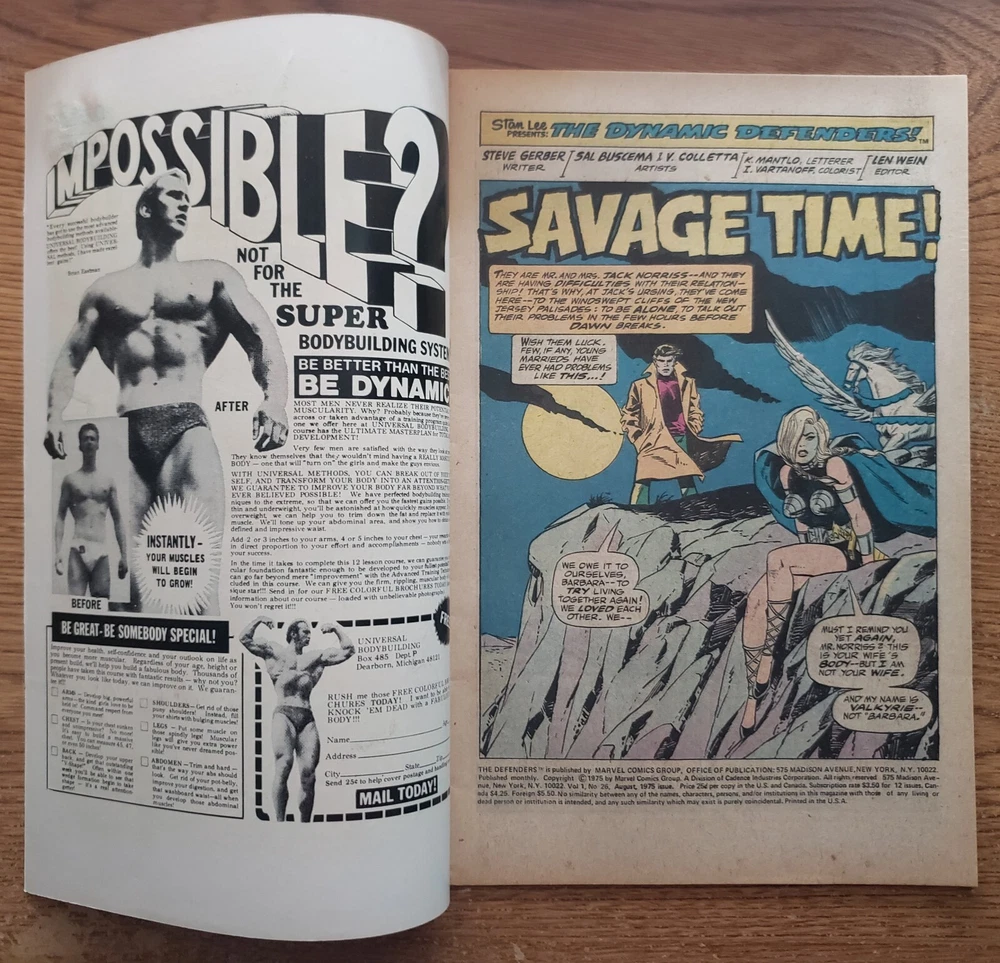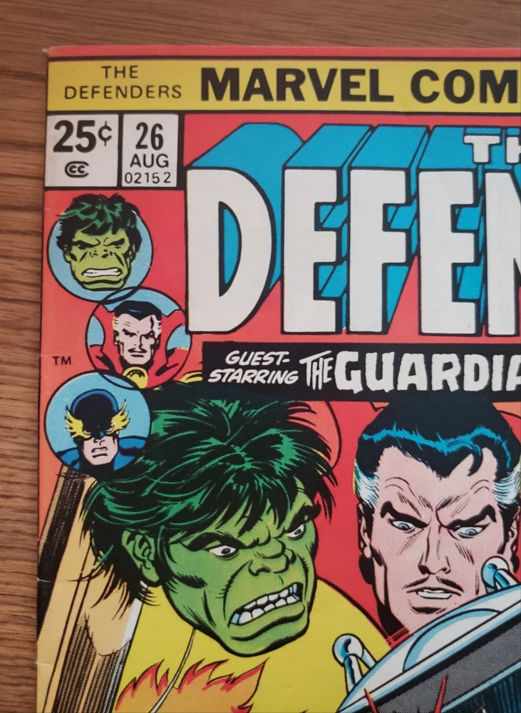 Defenders #26 FN 6.0 "Guest-Starring The Gaurdians of the Galaxy!" published in 1975.