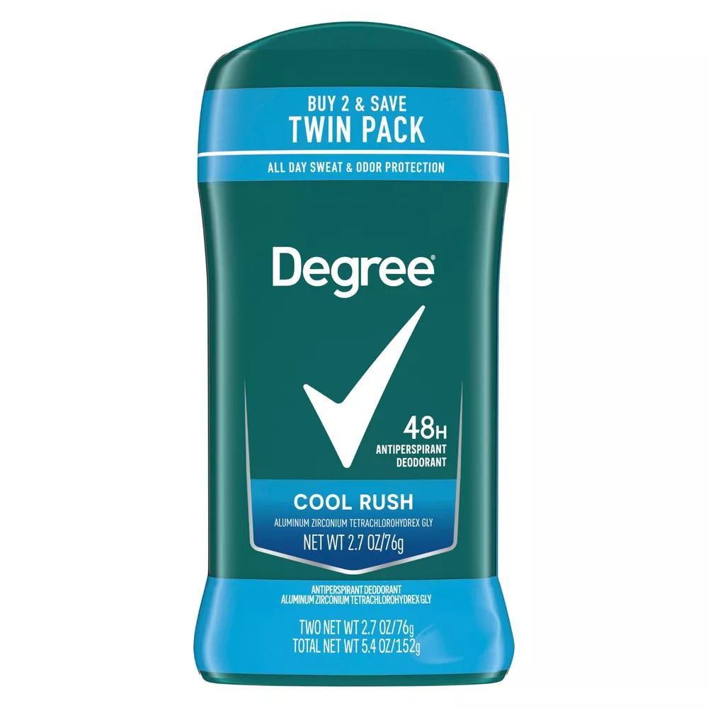 Degree Men Original Antiperspirant Deodorant for Men Cool Rush Twin Pack, 2.7oz 48-HOUR PROTECTION: Active lives need Degree Men Cool Rush Antiperspirant Deodorant. This antiperspirant for men delivers confidence with 48-hour sweat and odor protection. FEEL SHOWER-FRESH ALL DAY: This antiperspirant deodorant keeps you feeling dry with a crisp, arctic scent. You'll feel as fresh as when you started your day. READY FOR WHAT’S NEXT: Take on the day with Degree Men Cool Rush Antiperspirant Deodorant stick. Simply twist, glide, and move. CRISP SCENT: Stay fresh longer with this antiperspirant for men. Degree Men Cool Rush Antiperspirant Deodorant features a clean, refreshing scent to keep you feeling energized. RECYCLE WITH DEGREE: As well as increasing our use of reusable materials, we’re making it easier for you to recycle our antiperspirant and dry spray packaging. GO BEYOND YOUR LIMITS: At Degree, we want to inspire the confidence in everyone to move more and go further. We’re here to support your journey through an antiperspirant for men that moves with you. info: