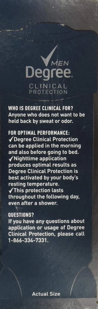 Product Description Degree Men, Clinical Protection, Antiperspirant Deodorant, Soft Solid, Clean, 1.7 Ounce (Pack Of 4) Degree Clinical Protection Long Lasting Antiperspirant Deodorant Stick, Clean, Degree Men Clinical Protection Clean Antiperspirant Deodorant delivers prescription-strength wetness protection with 72-hour sweat and odor control to keep you feeling dry and fresh. Our breakthrough motionsense technology works in sync with your body, all day long. This Antiperspirant deodorant releases a clean, masculine scent every time you move. The powerful, prescription-strength Antiperspirant deodorant responds when you need it most, so you can stay confident without having to worry about slowing down. PRESCRIPTION-STRENGTH PROTECTION: Active lives need Degree Men Clinical Protection Clean Antiperspirant Deodorant. This Antiperspirant for men delivers prescription-strength wetness protection MOTIONSENSE® TECHNOLOGY: Our breakthrough MotionSense® technology works in sync with your body all day long. This deodorant for men releases a subtle burst of fragrance every time you move READY FOR WHAT'S NEXT: Take on the day with Degree Men Clinical Protection Clean Antiperspirant Deodorant stick. Simply twist, glide, and move UNSTOPPABLE FRESHNESS: Stay fresh, longer with this Antiperspirant. Degree Men Clinical Protection Clean Antiperspirant Deodorant features a clean, masculine scent to keep you feeling energized RECYCLE WITH DEGREE: As well as increasing our use of reusable materials, we're making it easier for you to recycle our Antiperspirant and dry spray packaging Clean Clinical Antiperspirant Deodorant: Provides 24-hour protection against sweat and odor Neutral Scent: Unisex fragrance won't overpower you or your partner Ingredients Active ingredient: Aluminum Zirconium Tetrachlorohydrex GLY (20%); Inactive ingredients: Cyclopentasiloxane, dimethicone, paraffin, microcrystalline wax, fragrance (parfum), silica, caprylic/capric triglyceride, sodium starch octenylsuccinate, dimethicone crosspolymer, hydrated silica, maltodextrin, gelatin crosspolymer, hydrolyzed corn starch octenylsuccinate, cellulose gum, and BHT