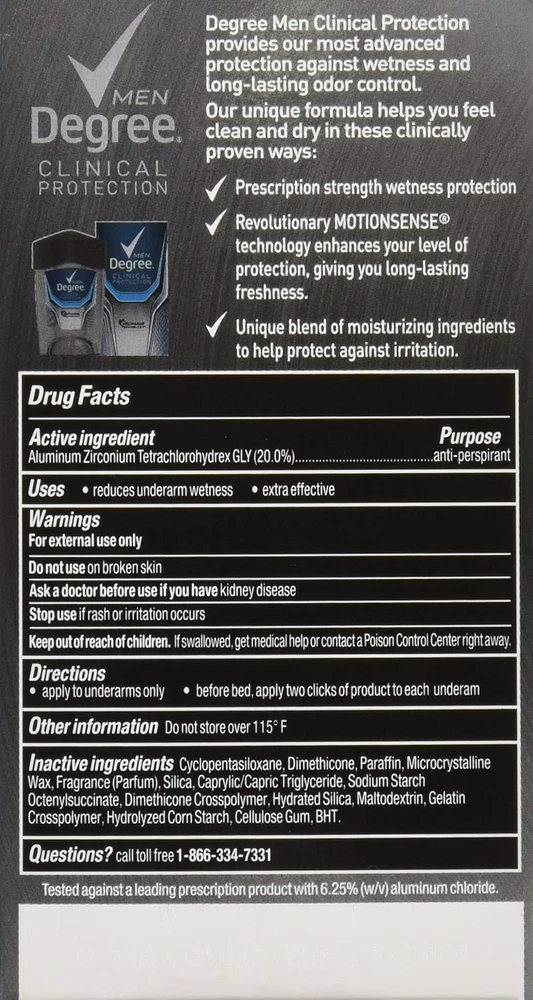 Product Description Degree Men, Clinical Protection, Antiperspirant Deodorant, Soft Solid, Clean, 1.7 Ounce (Pack Of 8) Degree Clinical Protection Long Lasting Antiperspirant Deodorant Stick, Clean, Degree Men Clinical Protection Clean Antiperspirant Deodorant delivers prescription-strength wetness protection with 72-hour sweat and odor control to keep you feeling dry and fresh. Our breakthrough motionsense technology works in sync with your body, all day long. This Antiperspirant deodorant releases a clean, masculine scent every time you move. The powerful, prescription-strength Antiperspirant deodorant responds when you need it most, so you can stay confident without having to worry about slowing down. PRESCRIPTION-STRENGTH PROTECTION: Active lives need Degree Men Clinical Protection Clean Antiperspirant Deodorant. This Antiperspirant for men delivers prescription-strength wetness protection MOTIONSENSE® TECHNOLOGY: Our breakthrough MotionSense® technology works in sync with your body all day long. This deodorant for men releases a subtle burst of fragrance every time you move READY FOR WHAT'S NEXT: Take on the day with Degree Men Clinical Protection Clean Antiperspirant Deodorant stick. Simply twist, glide, and move UNSTOPPABLE FRESHNESS: Stay fresh, longer with this Antiperspirant. Degree Men Clinical Protection Clean Antiperspirant Deodorant features a clean, masculine scent to keep you feeling energized RECYCLE WITH DEGREE: As well as increasing our use of reusable materials, we're making it easier for you to recycle our Antiperspirant and dry spray packaging Clean Clinical Antiperspirant Deodorant: Provides 24-hour protection against sweat and odor Neutral Scent: Unisex fragrance won't overpower you or your partner Ingredients Active ingredient: Aluminum Zirconium Tetrachlorohydrex GLY (20%); Inactive ingredients: Cyclopentasiloxane, dimethicone, paraffin, microcrystalline wax, fragrance (parfum), silica, caprylic/capric triglyceride, sodium starch octenylsuccinate, dimethicone crosspolymer, hydrated silica, maltodextrin, gelatin crosspolymer, hydrolyzed corn starch octenylsuccinate, cellulose gum, and BHT