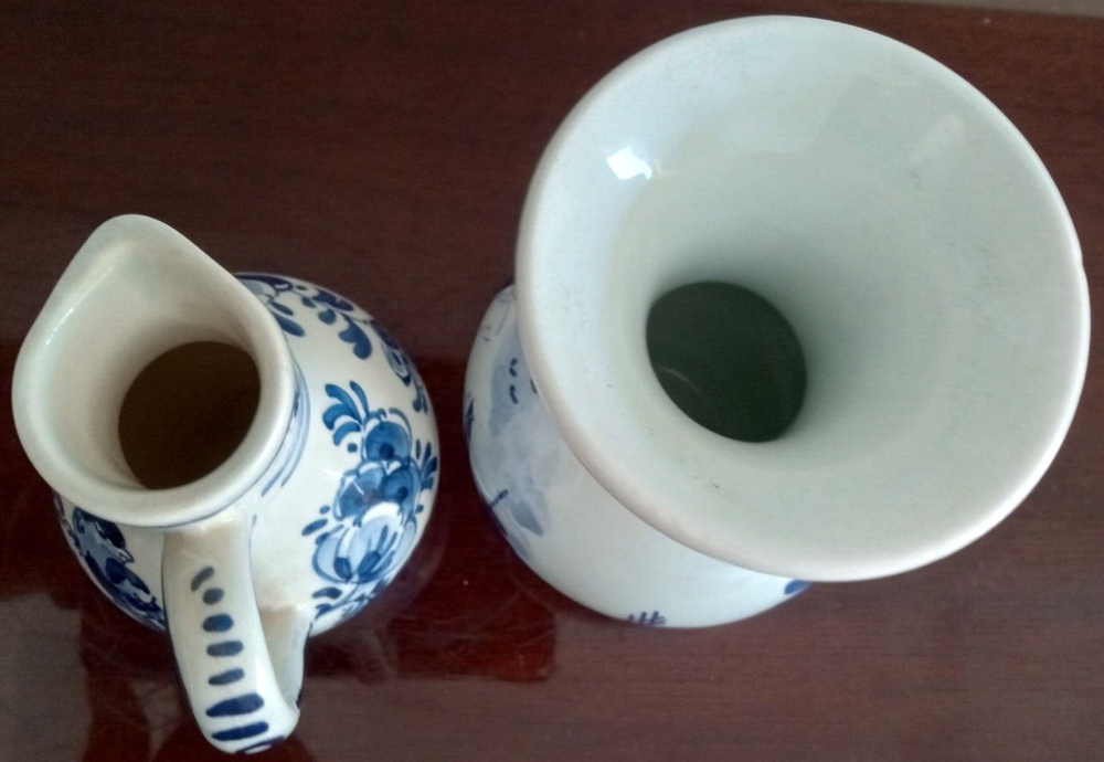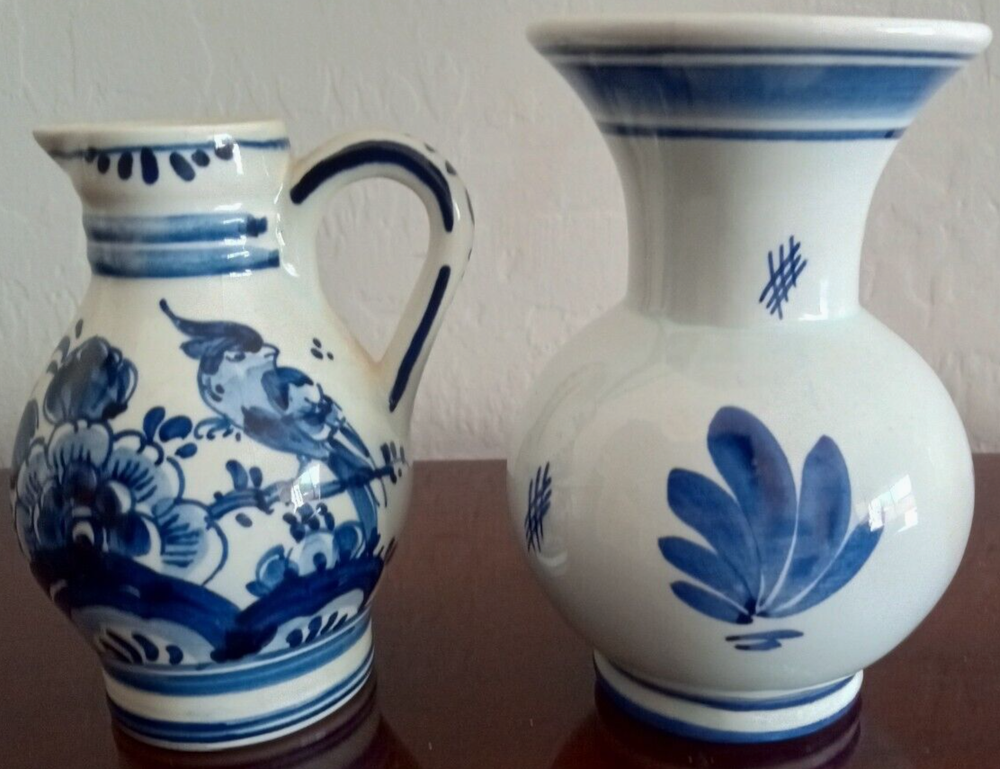 This charming miniature vase and pitcher set features a beautiful Delft-style floral pattern for the pitcher and landscape theme for the vase within a Dutch colonial theme. These pieces are hand-painted with a glossy finish and feature a stunning blue and white color scheme. The vase stands at 4.0" tall and the pitcher measures 3.75". This set is an original vintage presentation of art pottery from the Netherlands signed with a painted backstamp. They belong to the category of decorative pottery and glassware. This set is perfect for collectors of unique decorative treasures for the home.
