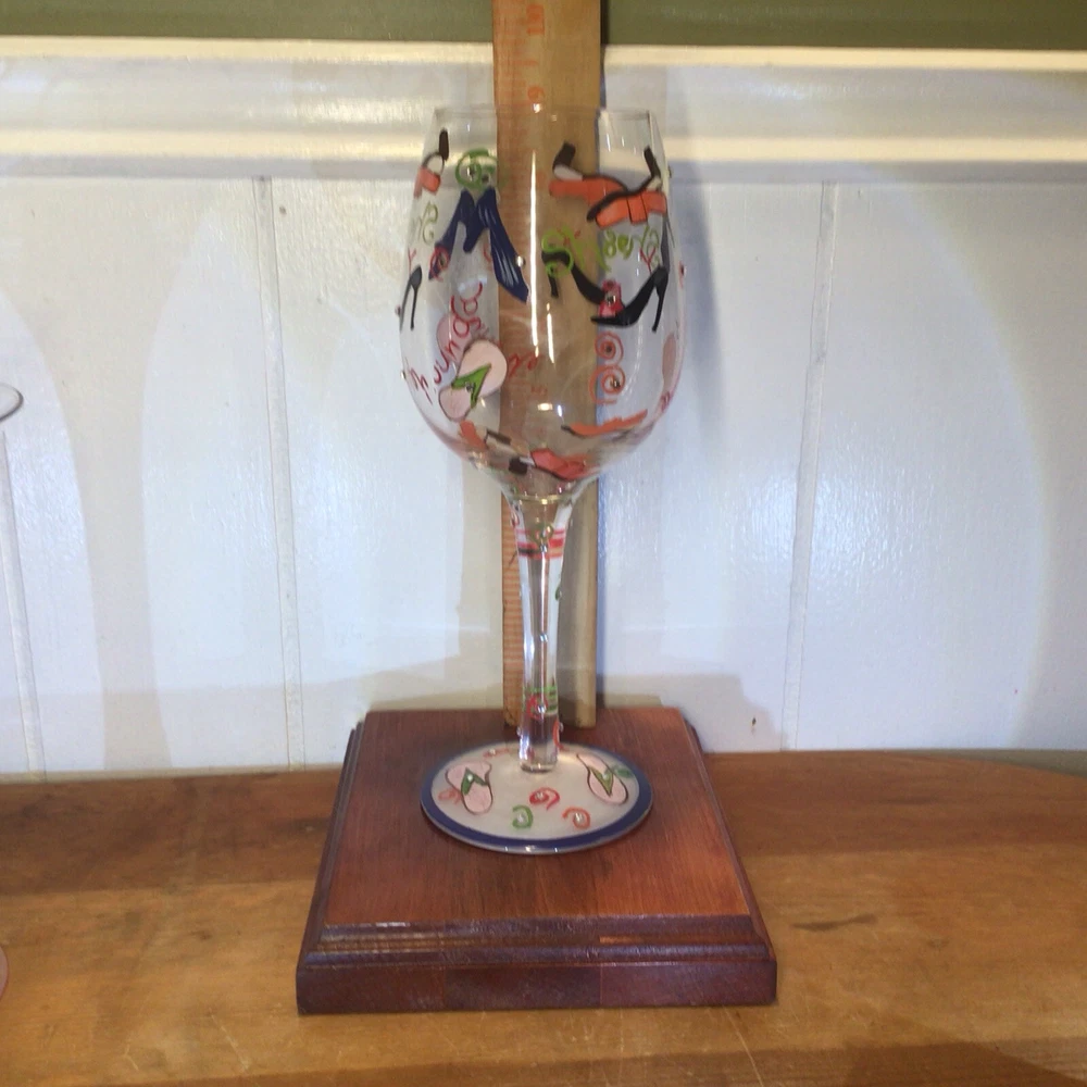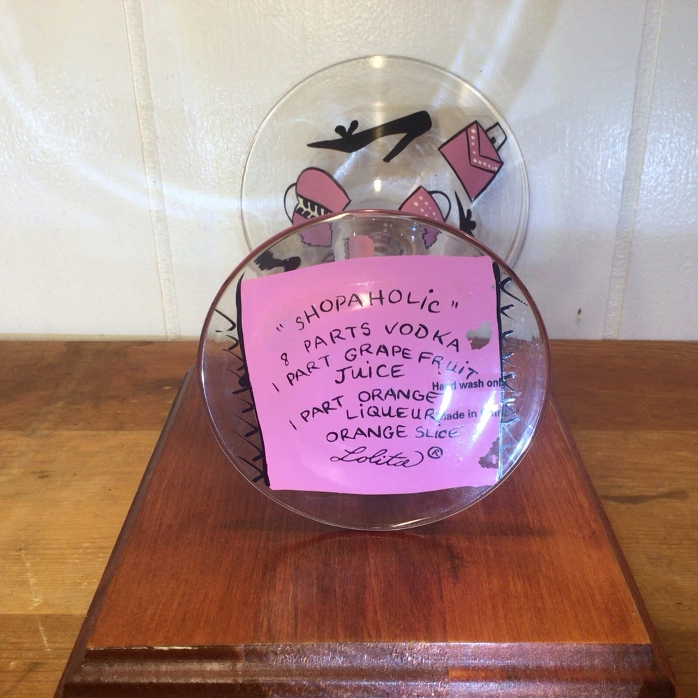 This is a set of two hand-painted crystal wine glasses with a contemporary abstract design featuring shoes and purses. Each glass has a round shape and a capacity of 15 oz. The brand is Fifth Avenue Crystal ( wine glass) and Lolita ( martini glass). These glasses are ideal for all occasions and are perfect for adults.