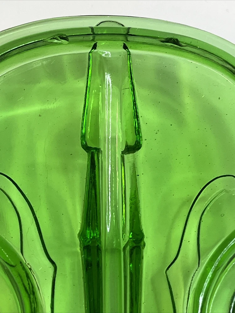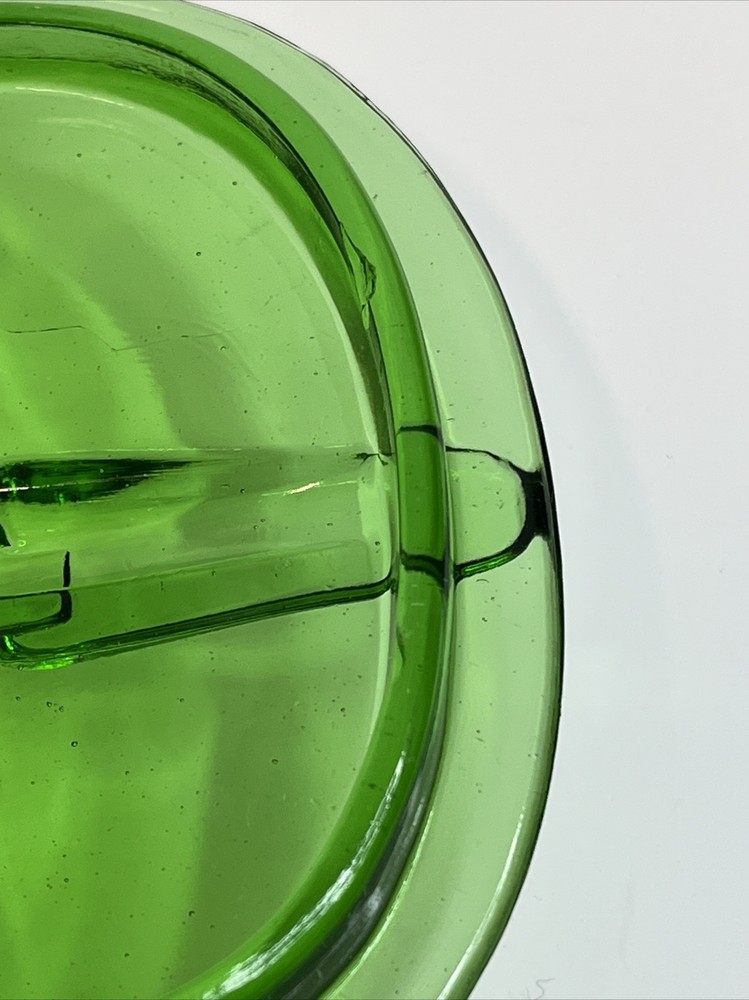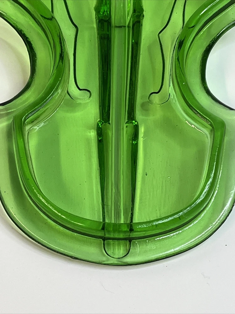 Vintage Dell Green Glass Violin Candy LID ONLY Underside Edge Chips READ Original collector, and the owner has downsized to assisted living. All proceeds to go to her care. This is the lid of a Dell vintage green candy dish. Under side edge has two chips, as is common in these used dishes. Original dish had the music symbol on the base. Pet and smoke free home