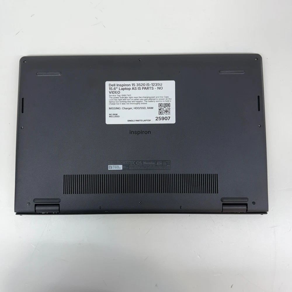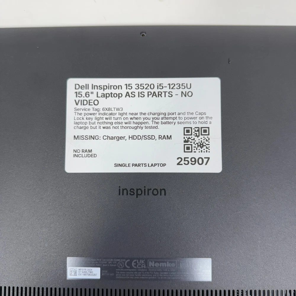 This is an INCOMPLETE Laptop being offered AS IS FOR PARTS OR REPAIR. It is a used item so please expect cosmetic wear like surface scratches and scuff marks. Service Tag: 6X8LTW3 The power indicator light near the charging port and the Caps Lock key light will turn on when you you attempt to power on the laptop but nothing else will happen. The battery seems to hold a charge but it was not thoroughly tested. Screen appears intact, but does have a couple of small scratches. Laptop turns on, but no video is displayed on display or external monitor. Please assume it could need motherboard repair and may not be a simple fix. Dell Inspiron 15 3520 15.6 in. Display, Intel Core i5-1235U MISSING: Charger, HDD/SSD, RAM, Bottom Screws It will be packed carefully for shipping.