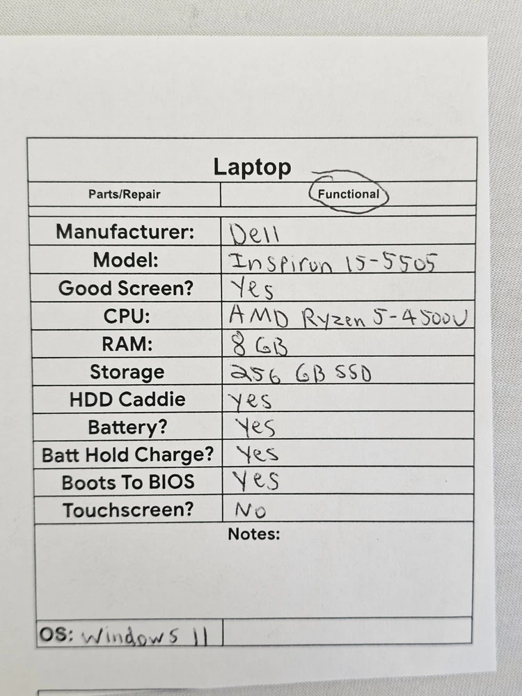 Dell Inspiron 15-5505 Laptop - AMD Ryzen 5-4500u - 8GB RAM - 256GB SSD - Win 11 Laptop has been cleared and ready for use. See pictures. Laptop is sold as laptop only with no accessories or chargers included. SHIPPING: We will ship your item in 1-3 Business days. Most items are ship within one day but I work full time and cant always get all orders shipped. Your item will be packaged nicely to ensure safe arrival. We will always use the most cost effective shipping method. TERMS: Please pay for your item within 3 business days or we will be forced to open an unpaid item case after a week. No Returns accepted on items for Parts THANK YOU AND HAVE A GREAT DAY!!!!!