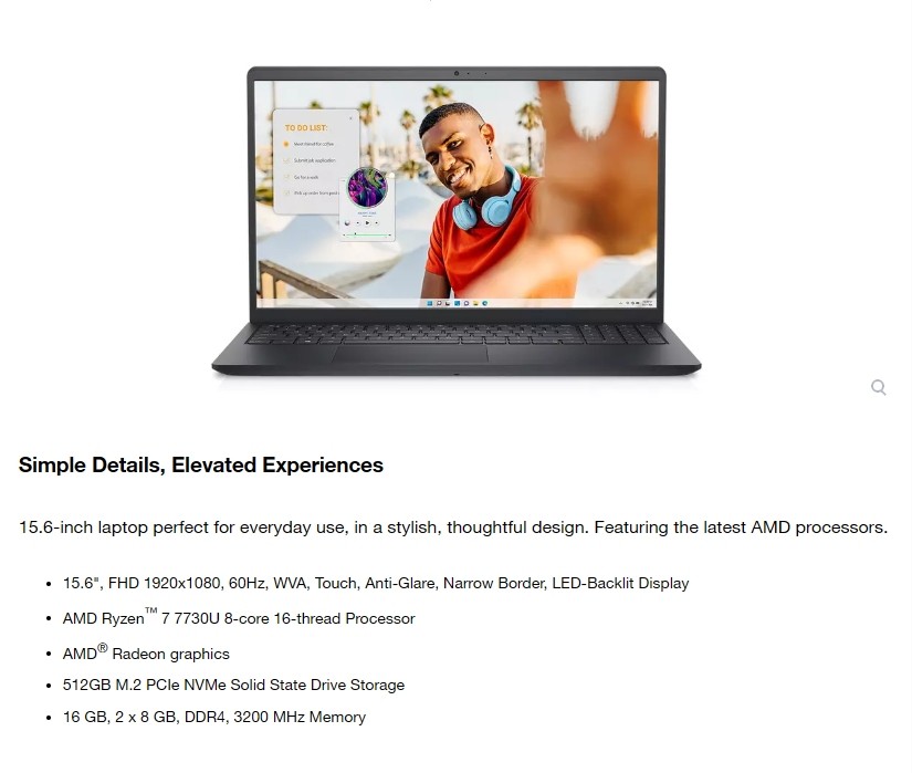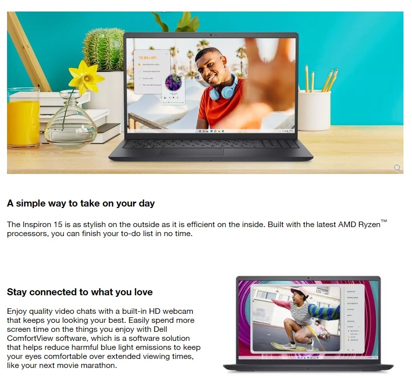 Newly Upgraded Dell inspiron i3535-A813BLK-PUS Laptop, 15.6 inches AMD Ryzen 7 7730U (8-Core) Processor, 8-core, 16-thread - AMD Radoen Graphics 15.6", FHD 1920x1080, 60Hz, WVA, Touchscreen, Anti-Glare, Narrow Border, LED-Backlit Display - UP TO 64GB DDR4 RAM 4TB SSD - Windows 11 Pro Hurry and seize the opportunity to own our high-performance laptop at an unbeatable price! As we make room for exciting new products, we're offering our best price ever on this remarkable device. Don't miss out - purchase yours before it's gone! Fast Shipping / Free Shipping within 48 Contiguous States Product Overview Windows 11 brings you closer to what you love Family, friends, obsessions, music, creations Windows 11 is the one place for it all. With a fresh feel and tools that make it easier to be efficient, it has what you need for whatever’s next. A simple way to take on your day The Inspiron 15 is as stylish on the outside as it is efficient on the inside. Built with the latest AMD Ryzen ™ processors, you can finish your to-do list in no time. Stay connected to what you love Enjoy quality video chats with a built-in HD webcam that keeps you looking your best. Easily spend more screen time on the things you enjoy with Dell ComfortView software, which is a software solution that helps reduce harmful blue light emissions to keep your eyes comfortable over extended viewing times, like your next movie marathon. Ports and Slots 1. SD card reader | 2. USB 2.0 port | 3. Headset jack | 4. Power jack | 5. HDMI 1.4 | 6. USB 3.2 Gen 1 Type-A port | 7. USB 3.2 Gen 1 Type-C port Choose your upgrades We specialize in providing professional upgrades and customization for computers. Note that if you opt for customization of your computer from the aforementioned list, our engineers will open the manufacturer's box to install upgrades and test the system. Upgrade Memory for Multi-tasking : 16GB|32GB|64GB RAM Upgrade SSD for Storage and Speed : 512GB|1TB|2TB|4TB SSD Specifications Quick Info Processor & Memory: AMD Ryzen 7 7730U (8-Core) Processor 16GB|32GB|64GB DDR4 3200MHz RAM Drives: 512GB|1TB|2TB|4TB PCIe® NVMe™ M.2 Solid State Drive No Optical Drive Operating System: Microsoft® Windows 11 Pro Graphics & Video: 15.6" Touchscreen WVA LED-Backlit FHD (1920x1080) 60Hz Display Integrated AMD Radeon™ Graphics Audio: MaxxAudio® Pro Speaker Communications: Realtek Wi-Fi 5 + and Bluetooth 5.0 Integrated Widescreen HD (720p) Webcam Ports & Slots: 1x USB 3.2 Gen 1 Type-A 1x USB 3.2 Gen 1 Type-C 1x USB 2.0 1x HDMI 1.4 1x Headset Jack 1x SD Card Reader Power Supply: 3-Cell 41Hr Battery Additional Information: Dimensions: 9.27"L x 14.11"W x 0.75"H Approximate Weight: 3.59 lbs Bluetooth Version Bluetooth 5.0 Brand Dell Color Black Features Bluetooth Features Integrated Webcam Features Touchscreen Generation AMD Ryzen 7th Generation Graphics AMD Radeon Memory (RAM) 16 GB | 32 GB | 64 GB Memory Card Slot 1x SD Memory Card Reader Model i3535-A813BLK-PUS Number of Audio Ports 1x Headphone/Microphone Combo Jack Number of Ethernet Ports - Number of HDMI Ports 1x HDMI 1.4 Output Number of Thunderbolt Ports - Number of USB-A Ports 2 Ports (1x USB-A 3.2, 1x USB-A 2.0) Number of USB-C Ports 1 Port (1x USB-C 3.2) Operating System Windows OS Optical Drive No Optical Drive Processor AMD Ryzen 7 Processor Brand AMD Screen Resolution 1920 x 1080 Screen Size 15.6 in. SSD Size 512 GB | 1 TB | 2 TB | 4 TB Storage Drive Type SSD Webcam Resolution 720p Wireless Networking Wi-Fi 5 We can be contacted at any time through eBay messages if you have any questions, comments or product requests. We will respond to you within 24 hours and do our best to help you out! We encourage our customers to contact us with any questions or concerns! We'd like to be sure you are completely satisfied with your purchase.