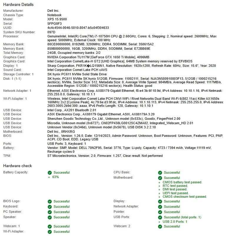 This unit is sold exactly as shown in the pictures. Please do not assume that something is included if not seen in the photos. This unit was used and may have minor scuffs, scratches, marks, dents or dings. Please carefully see pictures for cosmetic condition before placing your order. Battery condition: 63% capacity. This unit doesn’t include a charger, accessories, or instruction manuals. The unit has been fully functional tested and successfully powered on and booted. For more details, please refer to the test results shown in the pictures. The Dell XPS 15 9500 Laptop is a powerful workstation suitable for casual computing. Featuring an Intel Core i7 10th Gen processor, NVIDIA GeForce GTX 1650 Ti graphics card, and 24GB of RAM, this laptop offers fast performance and smooth graphics. With a 15.6-inch screen size and a maximum resolution of 1920 x 1080, users can enjoy a vibrant display for their work or entertainment needs. The 512GB NVMe storage type ensures quick data access and transfer, while the sleek silver color adds a touch of elegance to this Dell XPS model.