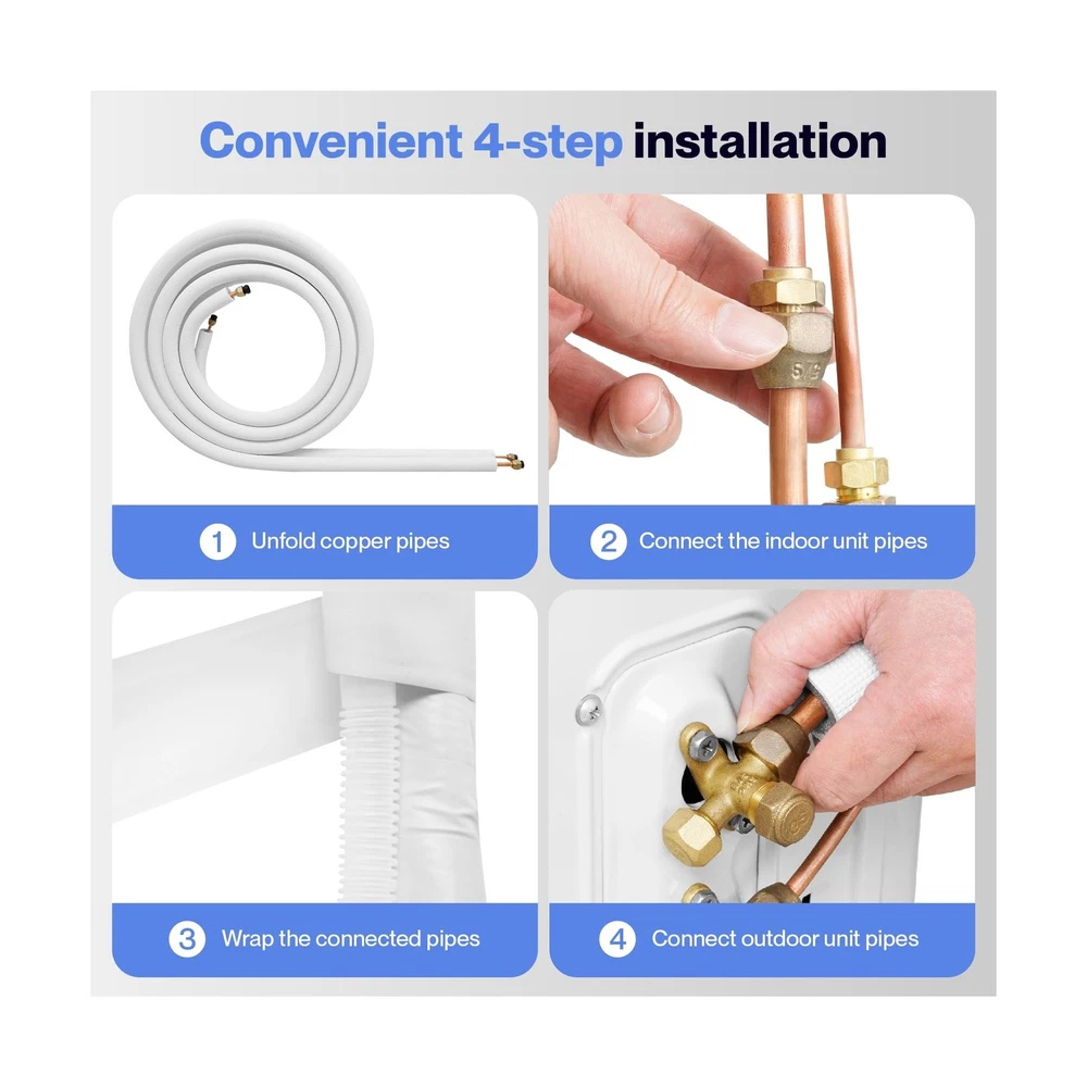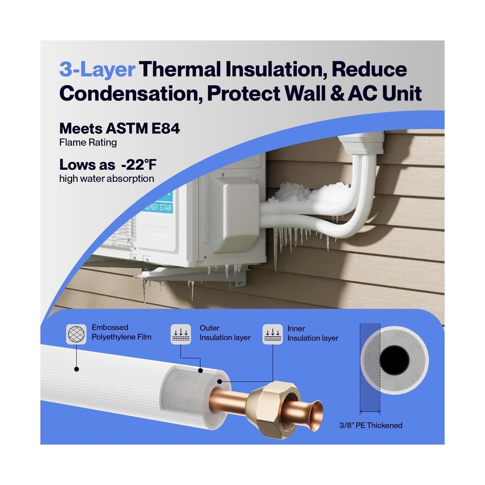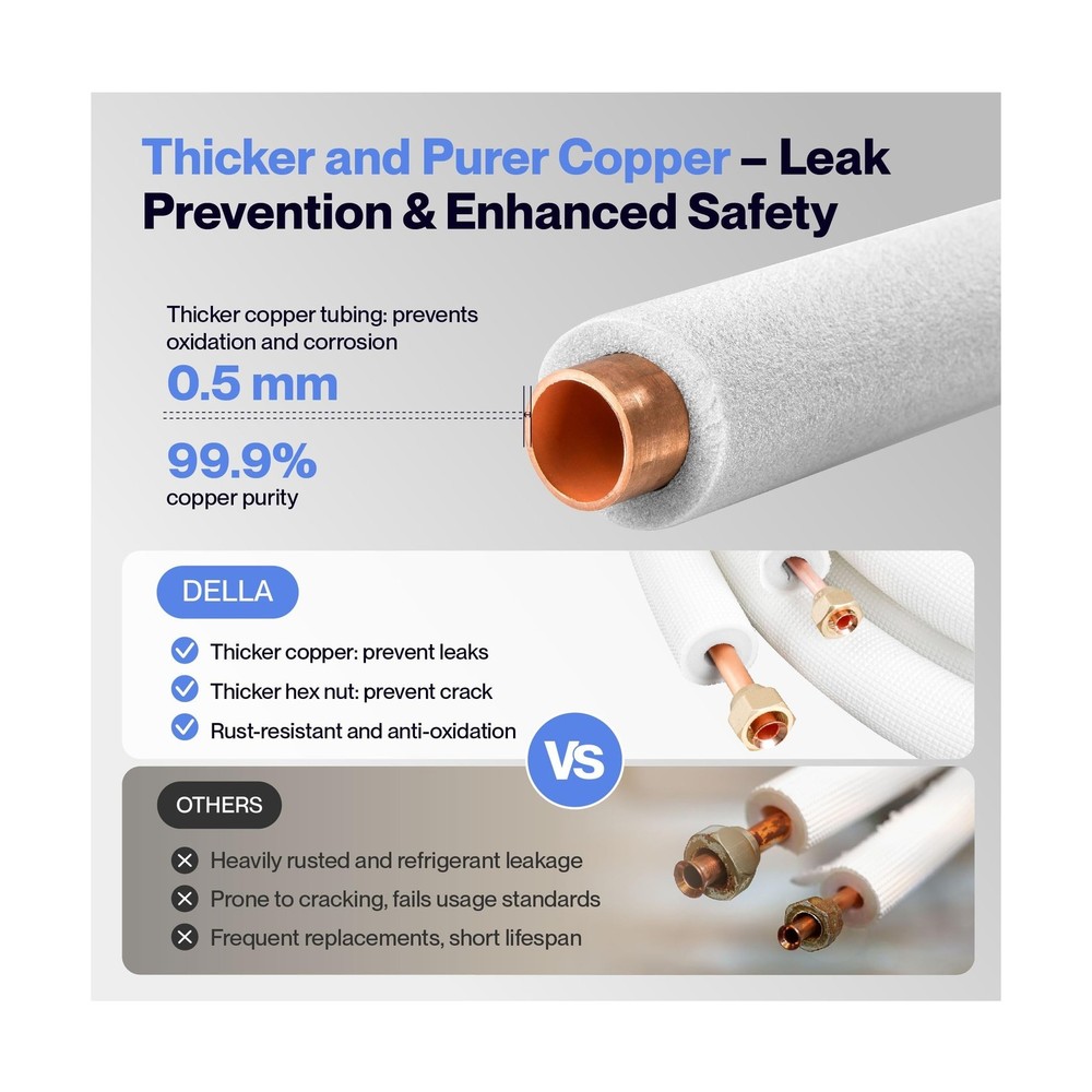 Della 25 Ft Mini Split Line Set, Includes 3/8" & 1/4" O.D. Copper Pipes with Flared Nuts and a 3/8" Thick White PE Insulated Coil, Perfect for Mini Split AC and Other HVAC Systems Description Features: Precision & Durability: 3/8" and 1/4" OD copper aluminum tubes with zero tolerance design for mini split AC. 0.5" thick walls ensure leak proof performance, durability, and excellent thermal conductivity ideal for tough environments. Complete Protection: 3/8" thick, 3 layer insulation for mini split copper aluminum lines. Features embossed polyethylene film and weather resistant foam. Flame retardant, heat insulating, and drip reducing protects walls, equipment, and extends service life. All Weather Copper Tubes: Built for -22F to 221F, compatible with all refrigerants. UV resistant coating for summer, moisture protection for winter durable and efficient in any climate. Complete Accessory Kit: Includes all essentials for easy installation refrigerant pipes, drain hose, wall sleeve, insulation foam, and more. Everything you need in one box. 24/7 Customer Support: At DELLA, we're here for you around the clock. Whether you need help with missing parts or have any other concerns, our dedicated support team is always just a message awayanytime, day or night. Product Details: Brand: Della Material: Copper, Polyethylene (PE) Color: White Product Dimensions: 300"L x 0.38"W Item Weight: 10 Pounds Nominal Wall Thickness: 0.5 inches Outside Diameter: 0.25 Inches Item Length: 300 Inches UPC Manufacturer: DELLA Item Dimensions L x W: 300"L x 0.38"W Item Weight: 10 Pounds Nominal Wall Thickness: 0.5 inches Outside Diameter: 0.25 Inches Item Length: 300 Inches Material Type: Copper, Polyethylene (PE) Color: White Brand Name: Della UPC: 192928041460 Manufacturer: DELLA Unit Count: 1.0 Count Delivery We Do Not Ship Outside of the Continental US. Return Policy All items qualify for returns within 30 days of receipt. Seller is responsible for return shipping on any item that is not damaged. Feedback We take our reputation seriously, we buy and sell online, so we understand the value of trust. If you are unsatisfied with your order, please contact us and we will work with you to resolve it to your satisfaction.