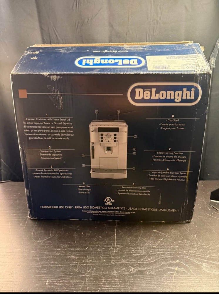 Item Depth:17 inGrinding Method:BurrCoffee Type:Whole BeansModel:ECAM22110SBMPN:ECAM22110SBColor:SilverFinish:MetalHeat up Time:FastType of Coffee Made:Espresso Macchiato, Espresso, Latte Macchiato, Mocha, Hot Milk, CappuccinoMaterial:Stainless SteelNumber of Cups:8Type:Espresso MachineBrand:De'LonghiUPC:0044387022118Cable Length:Built-InWater Tank Capacity:60 OzBean/Coffee Capacity:8.8 ozItem Height:13.8 inCompatible Water Filtration:De’LonghiBar Pressure:15 bargtin13:0044387022118Voltage:110 VPower:1200 WFeatures:Steam Wand, Auto Shut-off, Thermostat, Lightweight, Water Tank, Bypass Doser, Built-in Water Filter, Water Filter, Manual, Frother, Built-in Grinder, Programmable, Water Level Indicator, Removable Drip Tray, Hot Water Dispenser, Easy to Clean, Adjustable Coffee Spouts, Energy Saving Mode, Removable Water Tank, Cup Warming Surface, Quick HeatingPower Source:Wall Plug-in