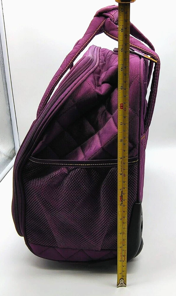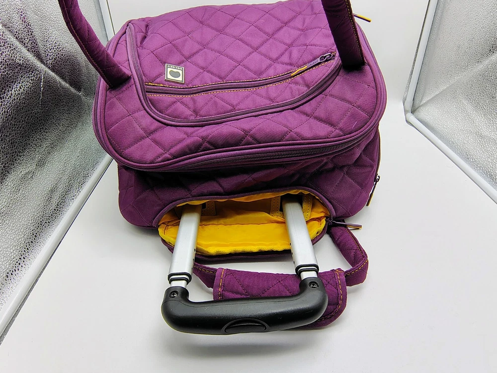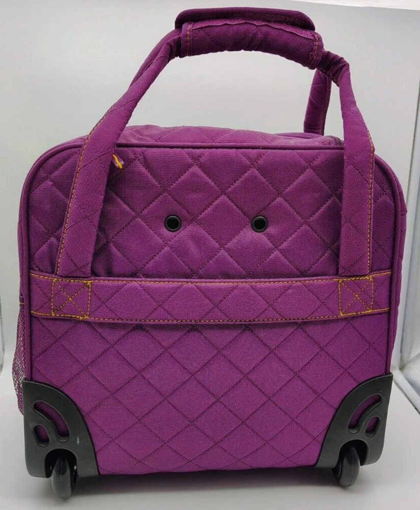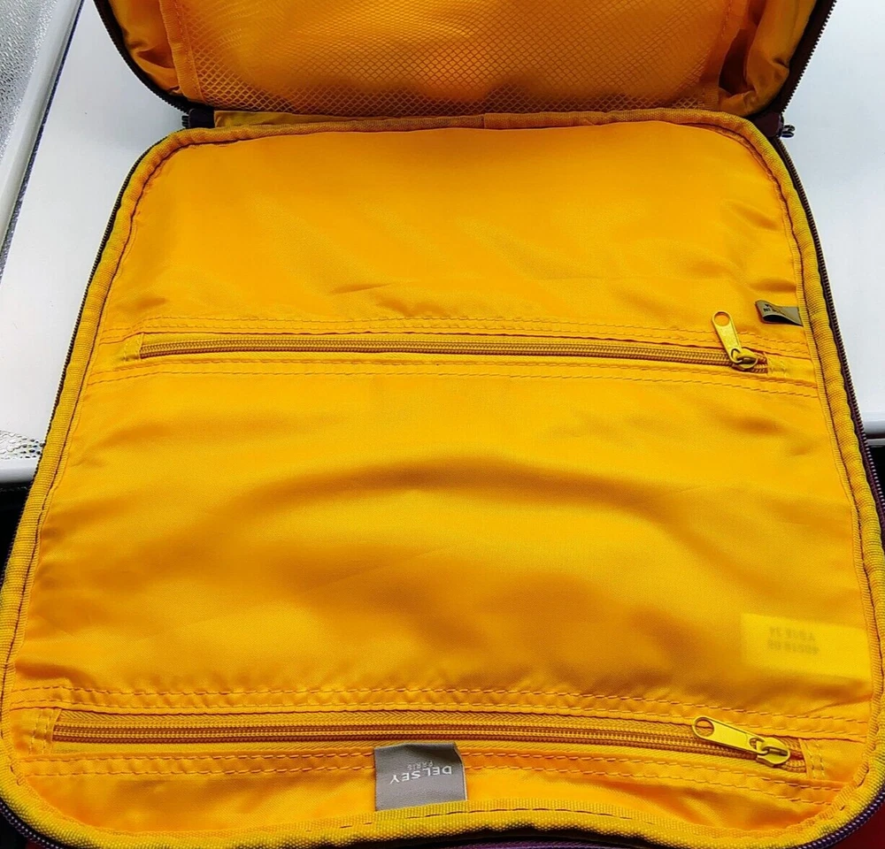 Type:Underseat LuggageColor:Plum Exterior/Yellow InteriorCountry/Region of Manufacture:ChinaPattern:Quilted SolidUPC:Does not applyBrand:DELSEYgtin13:Does not applyFeatures:Wheels/Rolling, Carry On, Laptop Compartment, Soft Case, Water Bottle Pocket, Luggage BandSize:15"