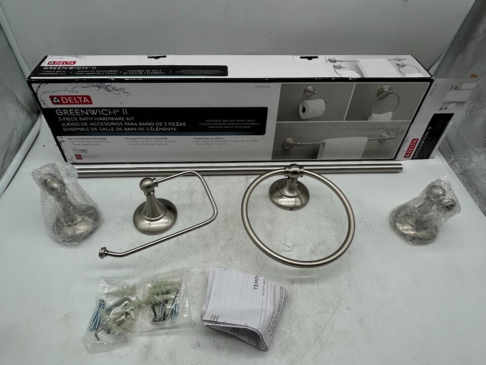 This is a NEW OPEN BOX item. The Greenwich II Bath Collection by Delta blends classic design with modern convenience , inspired by American casual décor . This 3-piece set includes a 24-inch towel bar, an open square toilet paper holder, and a round towel ring , making it an ideal upgrade for any bathroom. The SpotShield brushed nickel finish resists water spots, fingerprints, and stains, ensuring a clean and polished look for years to come. Key Features Complete 3-Piece Set – Includes a 24-inch towel bar, toilet paper holder, and towel ring for a cohesive and functional bathroom upgrade. SpotShield Brushed Nickel Finish – A warm, muted silver tone with earthy undertones , designed to resist water spots, fingerprints, and stains . Durable & Reliable – Crafted from multiple metals for strength and longevity . Wall-Mounted Design – Maximizes space while keeping towels and essentials easily accessible . Easy Installation – Includes all necessary mounting hardware, a template, and step-by-step instructions for a hassle-free setup . Dimensions Towel Bar: 2.76" H x 28.50" L x 3.49" D Toilet Paper Holder: 4.84" H x 6.45" L x 3.43" D Towel Ring: 7.53" H x 6.38" L x 2.74" D Why Choose the Greenwich II Bath Accessory Set? Provides a stylish and practical bathroom upgrade. SpotShield technology keeps hardware cleaner for longer . Durable construction ensures years of reliable use . Easy to install with included hardware and mounting template. Complete your bathroom with other coordinating pieces from the Delta Greenwich II Collection (sold separately) for a harmonized, modern look . We take great care to inspect all items and ensure they are accurately described. Should you have any issues with your purchase, please let us know immediately. We are committed to resolving any concerns promptly and to your satisfaction. Our small business truly appreciates your patronage.