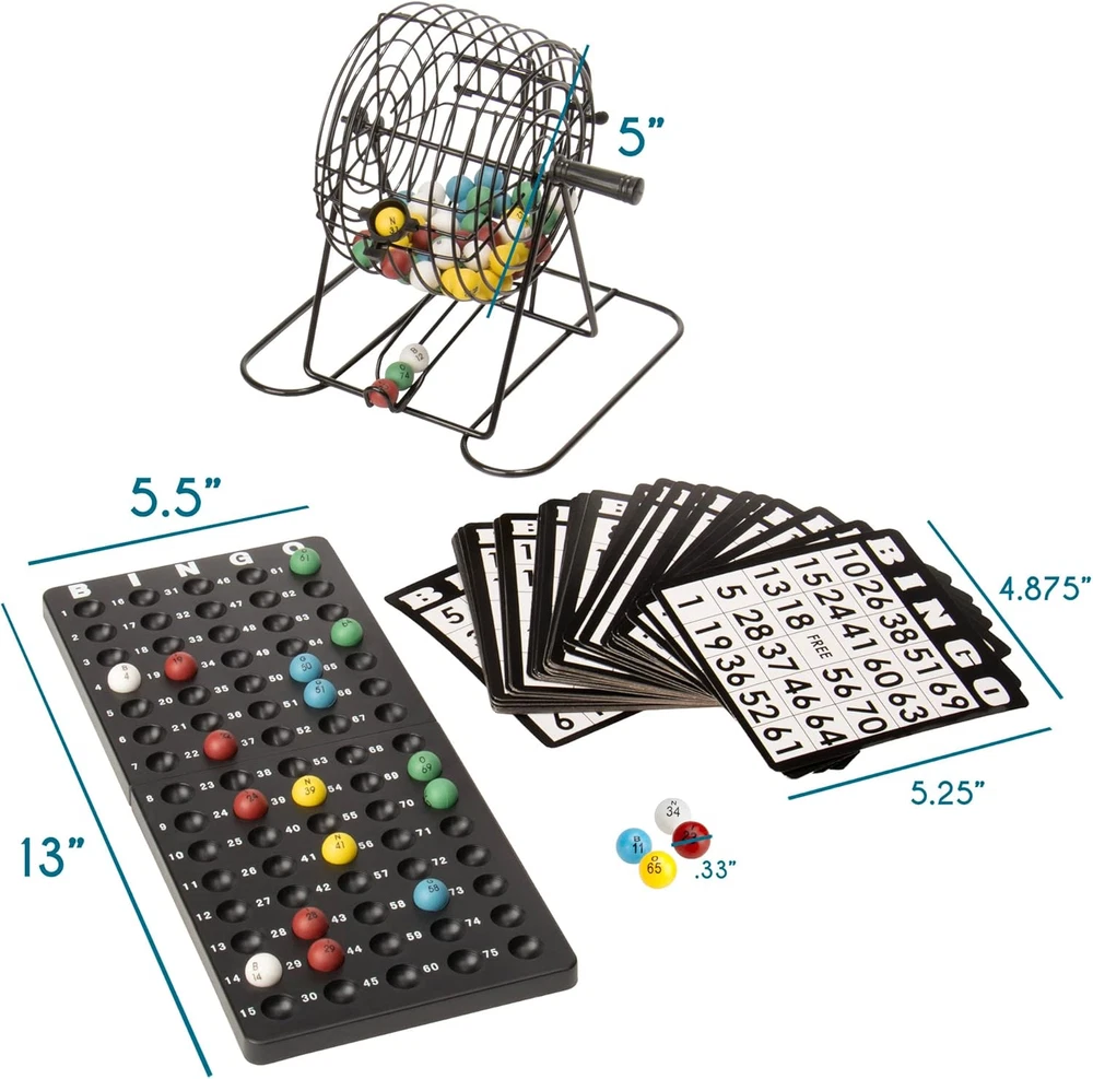 Free Expansion Set - Most starter Bingo sets offer just 18 bingo cards and 100 bingo chips, barely enough for 4 games of cover-all. Our Deluxe Bingo Set with Free Expansion Pack includes an additional 32 cards and 200 chips. That's a total of 50 cards and 300 chips! More Pieces, More Players, More Bingo - Our Deluxe Bingo game set is great for large groups, parties, classrooms, or experienced players playing multiple cards at once Pedal to the Metal - Our metal Bingo cage is superior to plastic cages. It spins smoothly and won't crack with use. And, instead of flimsy paper, our Bingo Cards are printed on reusable card stock Easy Reading - Our colorful Bingo Balls have a proprietary clear coating that competitors don't, which prevents the letters and numbers printed on from rubbing off over time Why You'll Love It - Because it suits so many players, our Deluxe Bingo Set is perfect for community centers, school classrooms, retirement homes, firehalls, family games for Christmas, game night, anywhere a game of Bingo is sure to get started Product Description More Pieces. More Players. More Bingo. This deluxe Bingo Game is ideal for larger parties and groups, offering more playing pieces than most sets. Each luxury set comes with 50 Bingo cards, 300 Bingo chips, a Bingo board, a metal cage, 75 colorful plastic balls and instructions for different Bingo game variations. The Bingo board is made from two sturdy plastic pieces that hook together at the top and bottom. Each board measures 13 inches long and 5.5 inches wide. The boards hold a combined total of 60 plastic balls, each measuring 0.33 inches in diameter. Why You'll Love It: Our superior quality, metal Bingo cage is simple to use. Just give it a spin and watch as the balls roll down the metal slot for number callouts. The cage is 6" tall, including the base. The Bingo cards are made from heavy cardboard, measuring 4.88" x 5.25", making them highly durable and easy to read. You can use and reuse the cards after each game. Our set packs 300 multi-color Bingo chips to go alongside the 50 cards, while most Bingo sets rely on cheap fold-over numbers. Includes Bingo Boards, Balls, and Cage! There are 50 blue Bingo cards included in each set, along with 300 multi-color Bingo chips, enough for 12-15 players to play. For BIG Bingo Groups! Use the 300 Bingo chips, purchase more chips, or use anything for extra pieces, and you're ready to host a massive 50 player Bingo game. Easy to Read The brightly-colored Bingo balls feature jumbo-sized numbering for easy reading. There are 15 balls of each red, blue, green, yellow, and white, 75 balls in total. It's becoming a prize possession of many Bingo enthusiasts and board gamers alike. EVERYTHING You Need for Bingo Night Enough Cards for 50 Players 300 Multi-Color Chips 75 Total Bingo Balls in 5 Colors! The King of Bingo! From bingo markers to entire bingo game sets, Royal Bingo Supplies covers all needs related to playing bingo from full sets with cages, to even replacement balls and counters in case you're running low. Royal Bingo Supplies believes that the game of bingo brings friends and Families together. When you buy a product from Royal Bingo Supplies, you can always count on a quality item that will enhance any bingo playing experience!