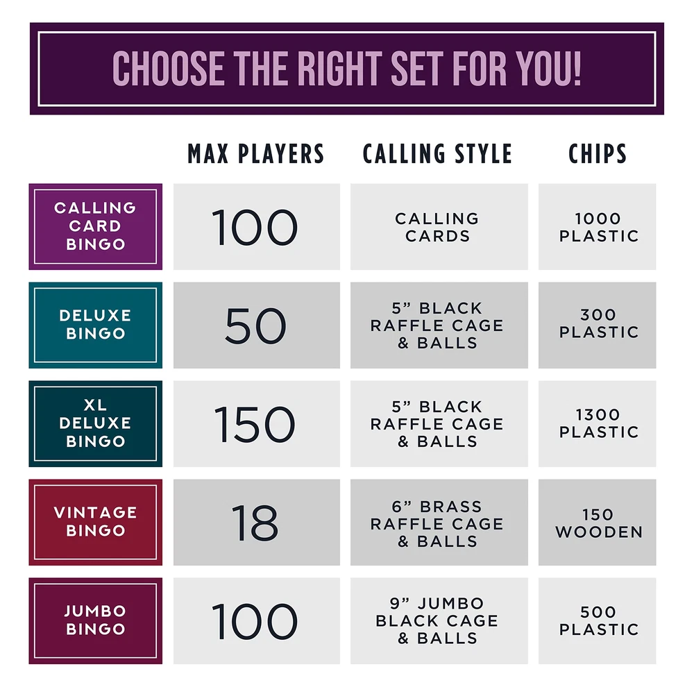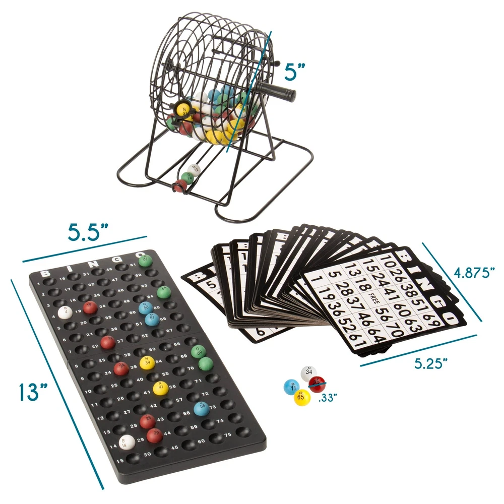 Free Expansion Set - Most starter Bingo sets offer just 18 bingo cards and 100 bingo chips, barely enough for 4 games of cover-all. Our Deluxe Bingo Set with Free Expansion Pack includes an additional 32 cards and 200 chips. That's a total of 50 cards and 300 chips! More Pieces, More Players, More Bingo - Our Deluxe Bingo game set is great for large groups, parties, classrooms, or experienced players playing multiple cards at once Pedal to the Metal - Our metal Bingo cage is superior to plastic cages. It spins smoothly and won't crack with use. And, instead of flimsy paper, our Bingo Cards are printed on reusable card stock Easy Reading - Our colorful Bingo Balls have a proprietary clear coating that competitors don't, which prevents the letters and numbers printed on from rubbing off over time Why You'll Love It - Because it suits so many players, our Deluxe Bingo Set is perfect for community centers, school classrooms, retirement homes, firehalls, family games for Christmas, game night, anywhere a game of Bingo is sure to get started