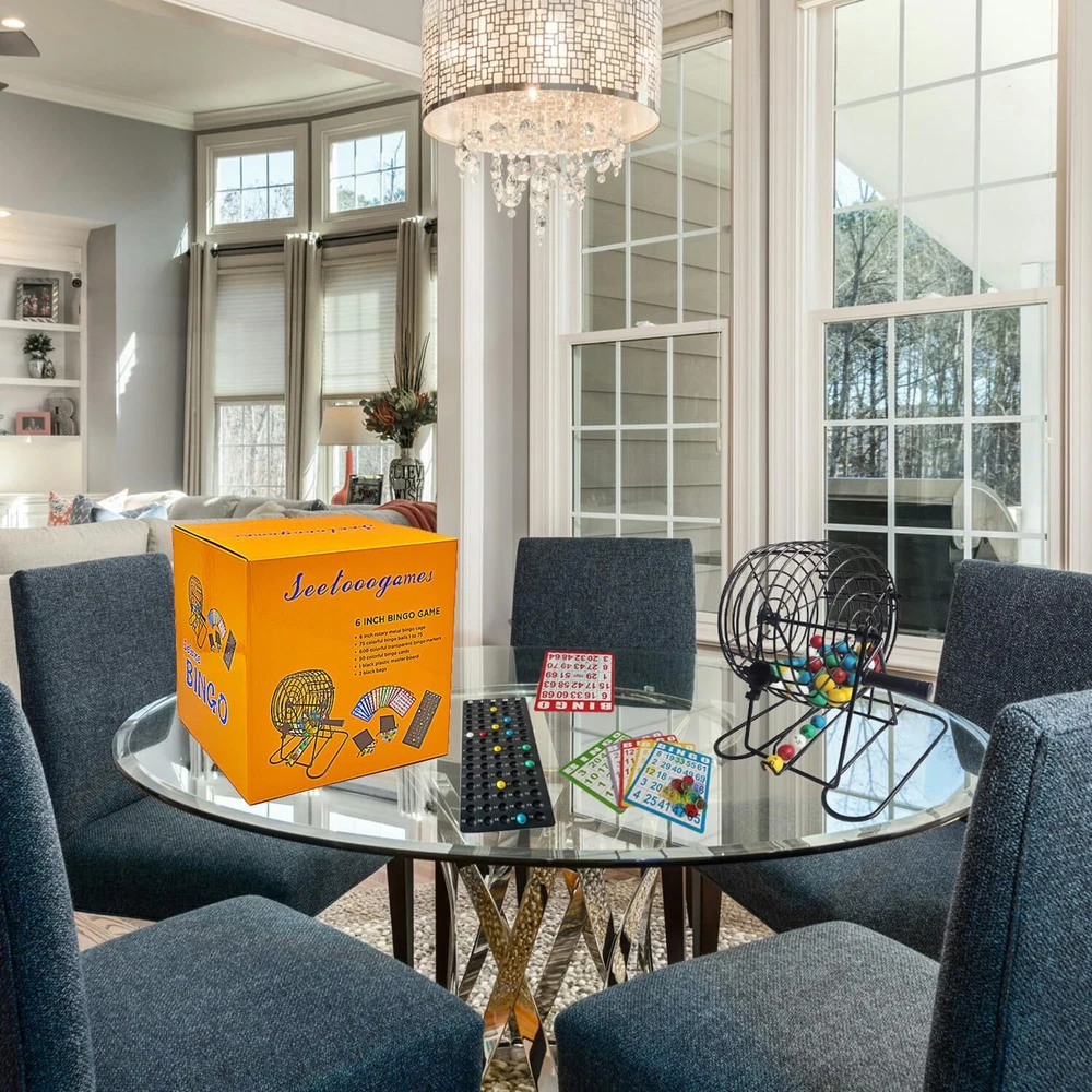 Deluxe Bingo Game Set includes a 6 inch rotary metal cage,75 colorful bingo balls, 600 colorful transparent bingo markers,50 colorful bingo cards,a black master board, black bags and a sheet of instruction. The 75 bingo balls are dia 3/5 inch(15mm),just fit the hole on the bingo cage,come with a black bag.Easy to read the bold numbers from B1-G75.The 600 colorful mixed (8 colors) transparent bingo chips(bingo marks) are dia 3/4 inch(19mm) come with a black bag. Cover the number when the bingo master calls. The 50 colorful bingo cards are made of sturdy cardboard. Every sheet is unique.A great gift for bingo game night with large groups.(12*13cm)A wonderful gift come with a color box.The black bags can the chips and balls well for repeat use. Deluxe Bingo Game Set - Includes a 8 inch rotary metal cage,75 colorful bingo balls, 600 colorful transparent bingo markers, 50 colorful bingo cards,a black master board, black bags and a sheet of instruction. 75 Bingo Balls - Dia 3/5 inch(15mm),easy to read the bold numbers from B1-G75,just fit the hole on the bingo cage. Come with a black bag for storage and repeat use. 600 Colorful Bingo Marks - Dia 3/4 inch(19mm),keeps numbers covered when the bingo master calls, thicker but visible.Come with a black bag for storage and repeat use. No Duplicate Bingo Cards - 50 Cards made of sturdy cardboard.Substantial and durable enough to stand up to repeat use. Every sheet is unique.(12*13cm) Wonderful Gift - Great for bingo game parities,family game nights with large crowds.Color box package.
