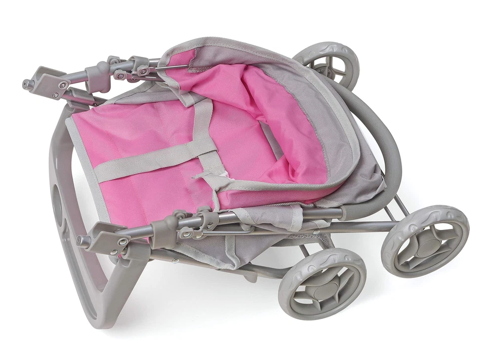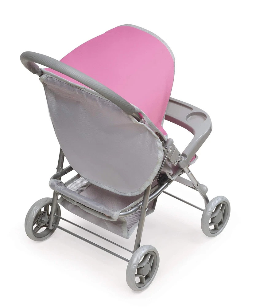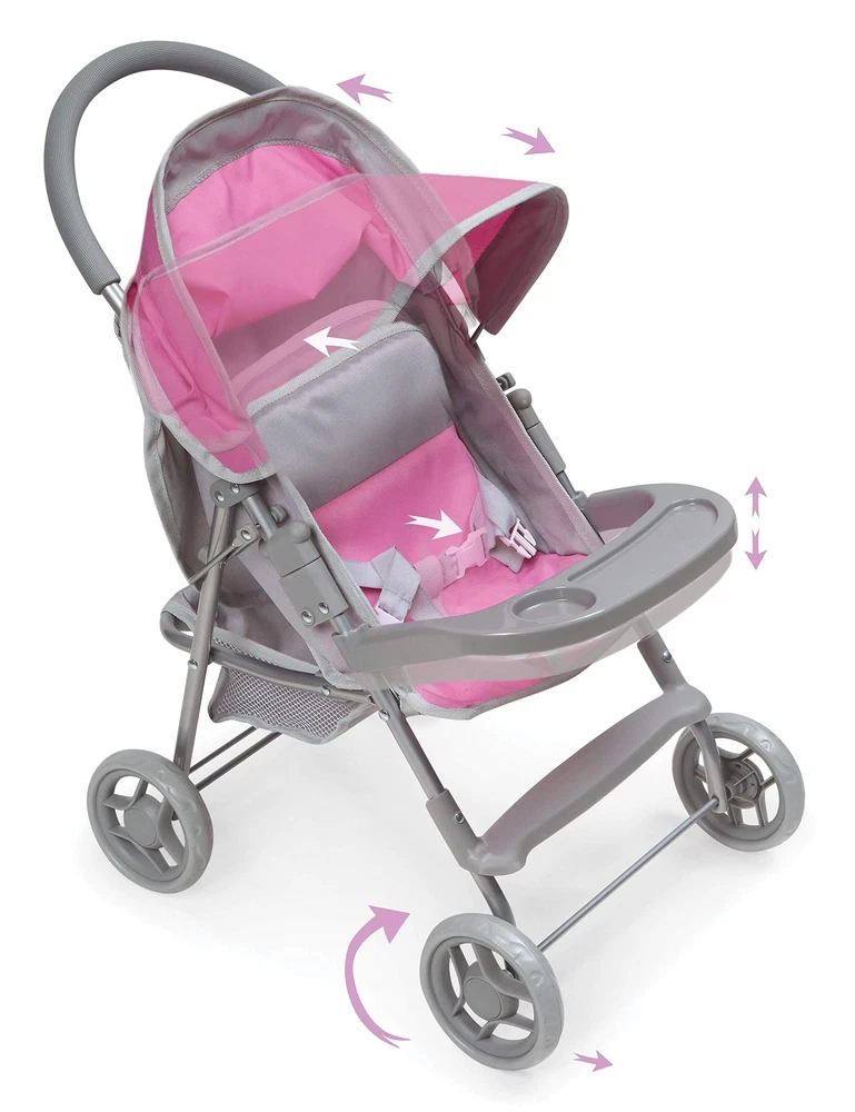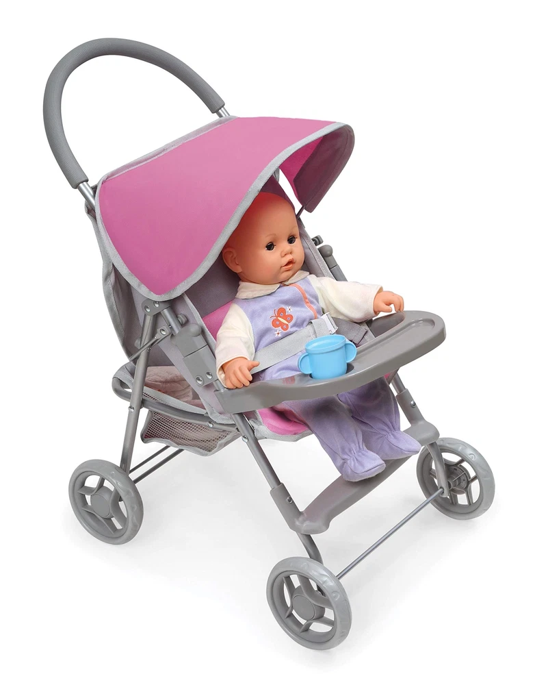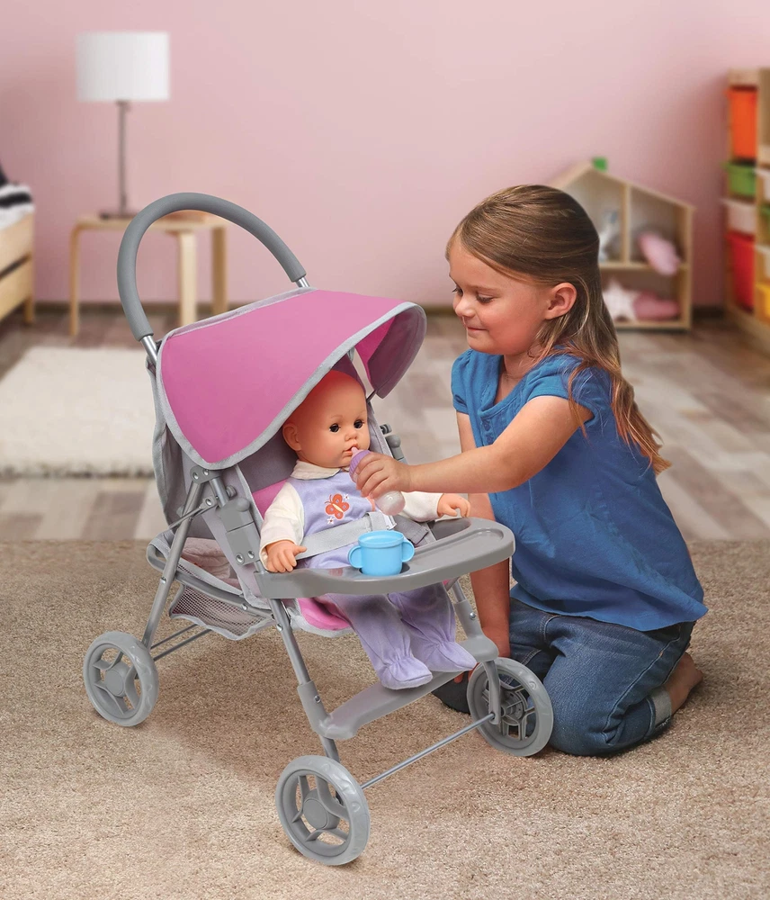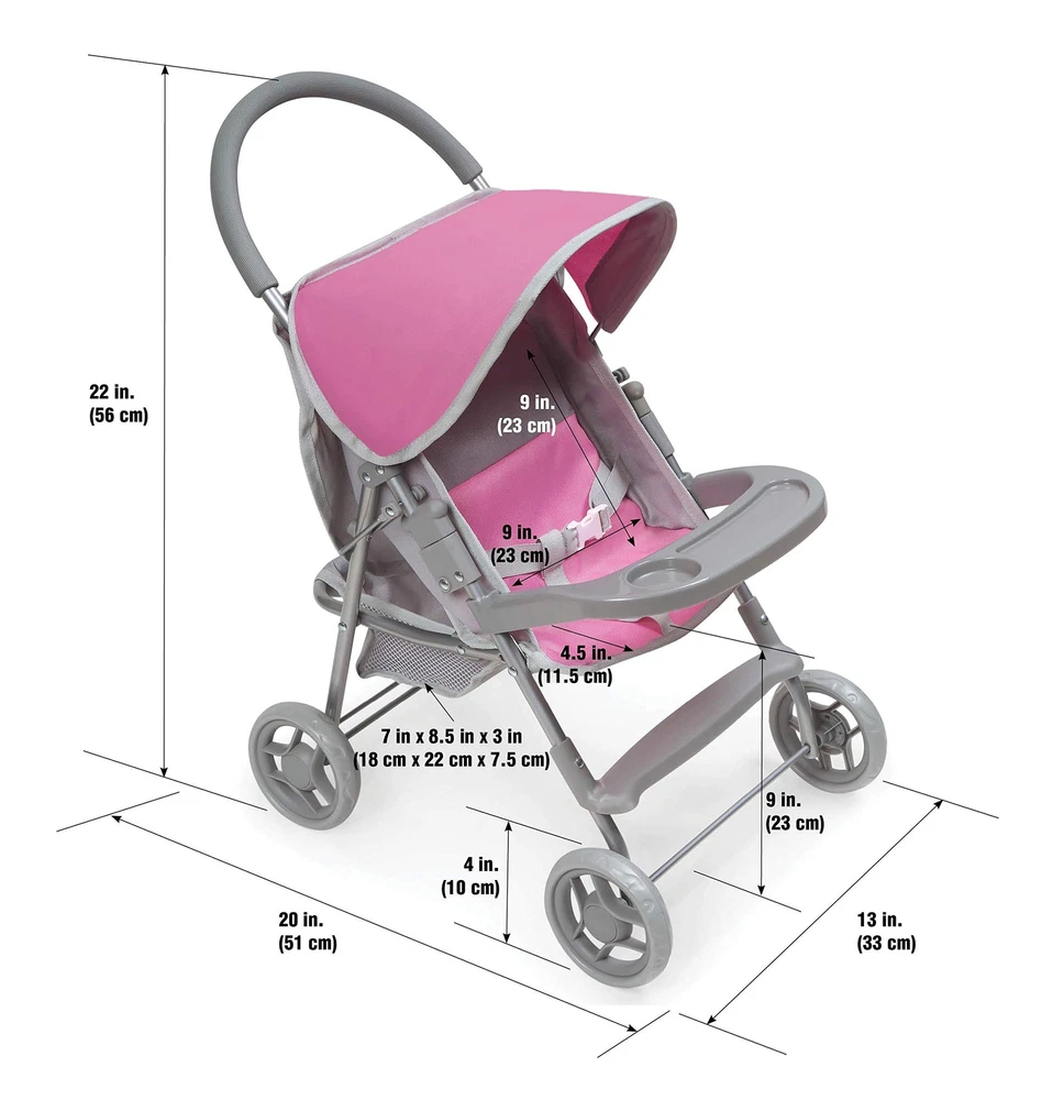 ’s Glide Folding Single Doll Stroller is an ideal gift for little parents, dolls, and treasured stuffed animals wishing for wheels. A screen-free toy to encourage hours of nurturing role-play! Padded handle is comfortable to push on long adventures. Adjustable multi-position seat changes from upright, for exciting scenery, to a full-recline for naptime. Easy to push thanks to the 4-inch fixed-position wheels. Folds for storage with the front tray on or off. Active and passive frame locks for safety. Wipe clean frame. Hand wash removable basket. Spot clean seat and canopy. Designed for dolls up to 18", including 14.5 and 15 inch dolls. Made with metal, Polyester/Cotton Fabric, PP Plastic, and EVA Rubber tire tread. Overall dimensions 20" L x 13" W x 22" H. Assembled weight: 3.1 pounds. Measurements approximate. Adult assembly required, no tools needed. Illustrated instructions included. This toy is for use with dolls only and is not for use with real infants. /! WARNING: CHOKING HAZARD - Small parts. Not for children under 3 years. Dolls and accessories not included. Actual color/finish may vary slightly from screen display. This item ships in original carton that may include product photo. Authentic stroller features such as a storage basket, 3-point seat belt, rubber padded handle, front snack tray, and a foot rest Stroller will accommodate all babydoll brands that measures up to 18 inches Overall size 20 inches L x 13 inches W x 22 inches H Made with metal, 99% Polyester/1% Cotton Fabric, PP Plastic, and EVA Rubber Adult assembly required (no tools needed)